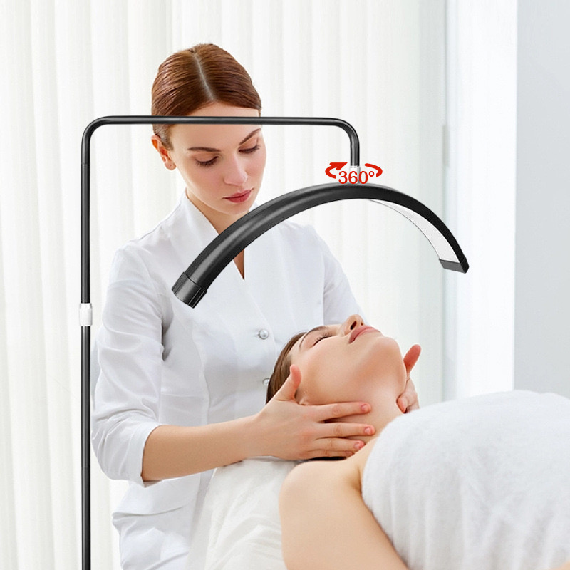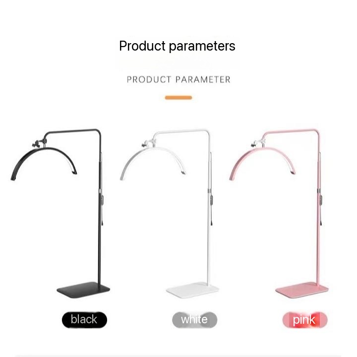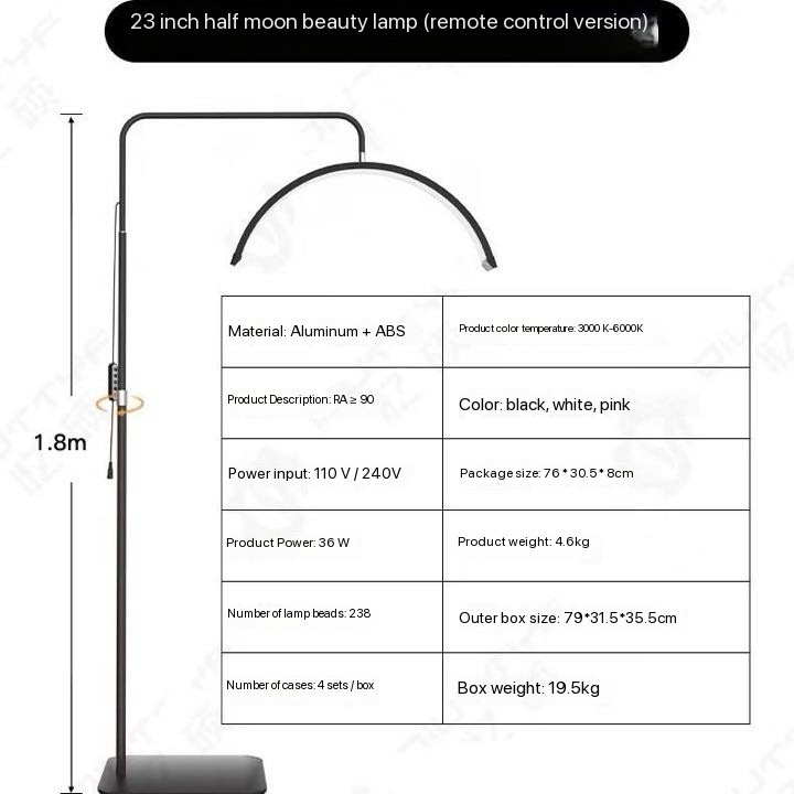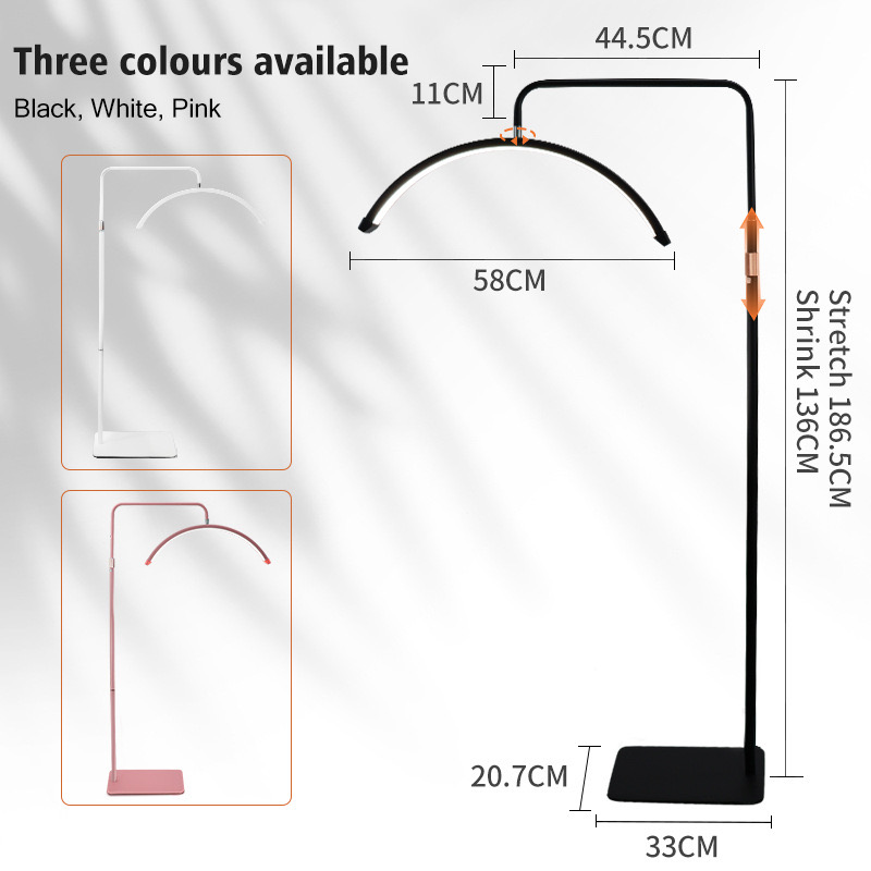 [Half-moon Floor Fill Light) Special half-moon shape design, with 238pcs high-quality lamp beads, 36W high power and 90+ high color rendering, suitable for desktop vlog, beauty salon live streaming, beauty project, etc. [Bi-Color Temperature & Dimmable 3200K-5600K adjustable color temperature allows you to have warm light or cold light easily, and 10 levels of adjustable brightness can meet your needs of light in different usage conditions. [Flexible Rotation Design The lamp body can be 360° rotated freely, you can adjust the lighting angle easily, no any block to your video recording, very flexible to use. [Adjustable Floor Light Stand] The metal light stand with 125cm-180cm/ 49.2in-70.8in adjustable height enables you to place the fill light on floor for stable and convenient usage. [With Phone Holder and Remote Control) With an adjustable phone holder that is compatible with most smartphones on the market, you can install your phone to the light easily for video recording. With a remote control for flexible operation.