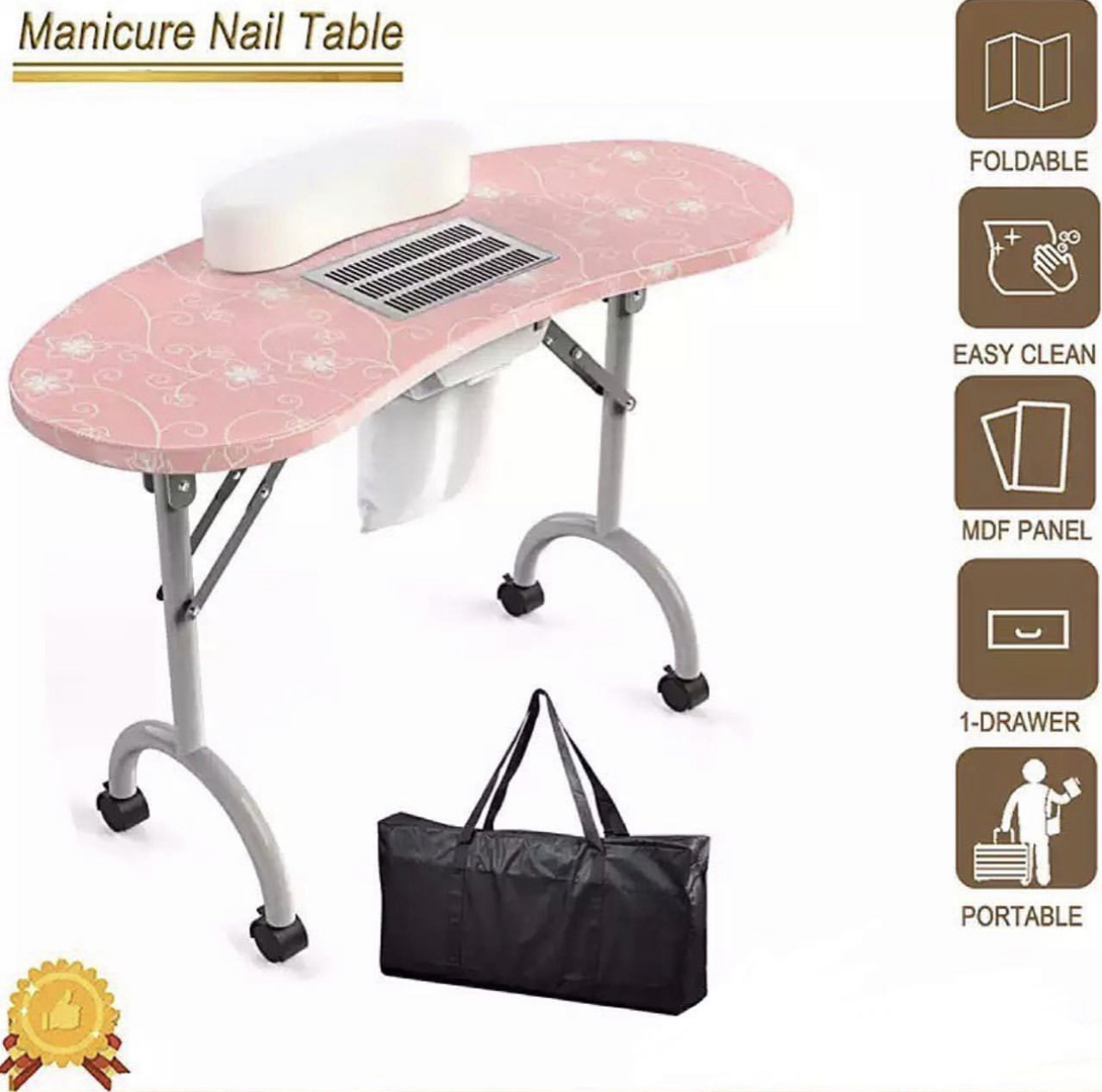 Tags: Foldable Mani Desk For Home Beauty Salon with Wrist Cushion Fan Dust Collector Wheels Carry Bag Manicure Table Nail Station