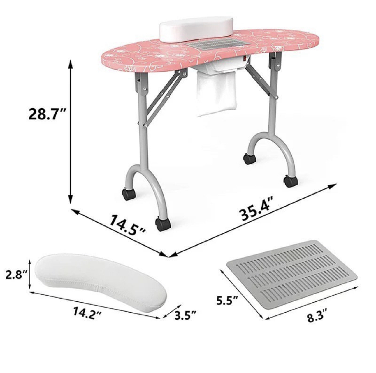 LARGE PORTABLE FOLDABLE MANICURE TABLE WITH FAN DUST COLLECTOR AND CARRY BAG NAIL ART Homecosy portable Manicure table with fan 4500 pm, foldable, and portable with useful carry bag. Made with the best materials. It will be possible to close every time you want to recovering useful space. At the center of the table is placed a comfortable pillow. The wheels are swivel 360° with locking system. The vacuum cleaner inserted in the center of the table is provided with a safety grid, are included in the price also three useful bags to collect dust. In the end, making it even more elegant, this splendid table we lacquered gray pearl legs. CONTENT PACK: Manicure Table with fan and european plug - pillow - Removable Aluminum grill collect dust - Carry Bag TECHNICAL FEATURES: Dimensions: 90 × 40 × 72 cm. Closed dimensions: 98 × 46 × 23cm. Suction power 4500 pm Electric consumption: only 17 w Nois level 55dB Weight: 12 Kg.