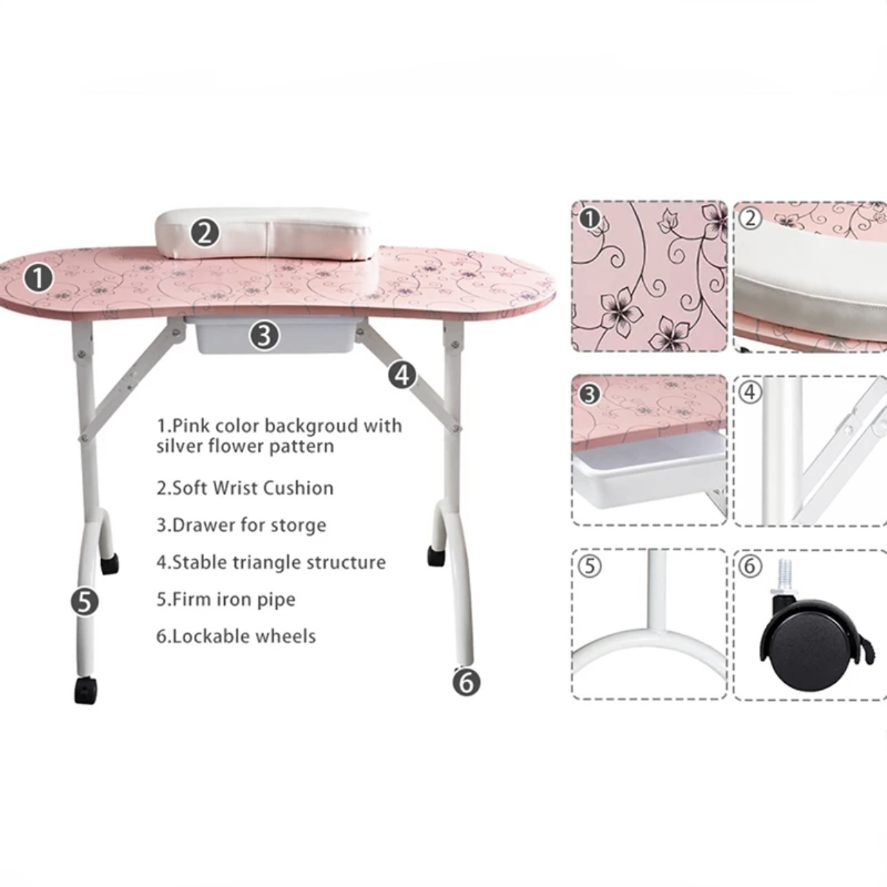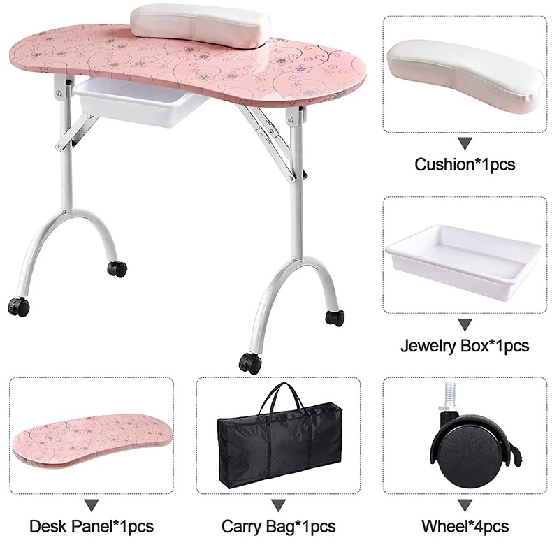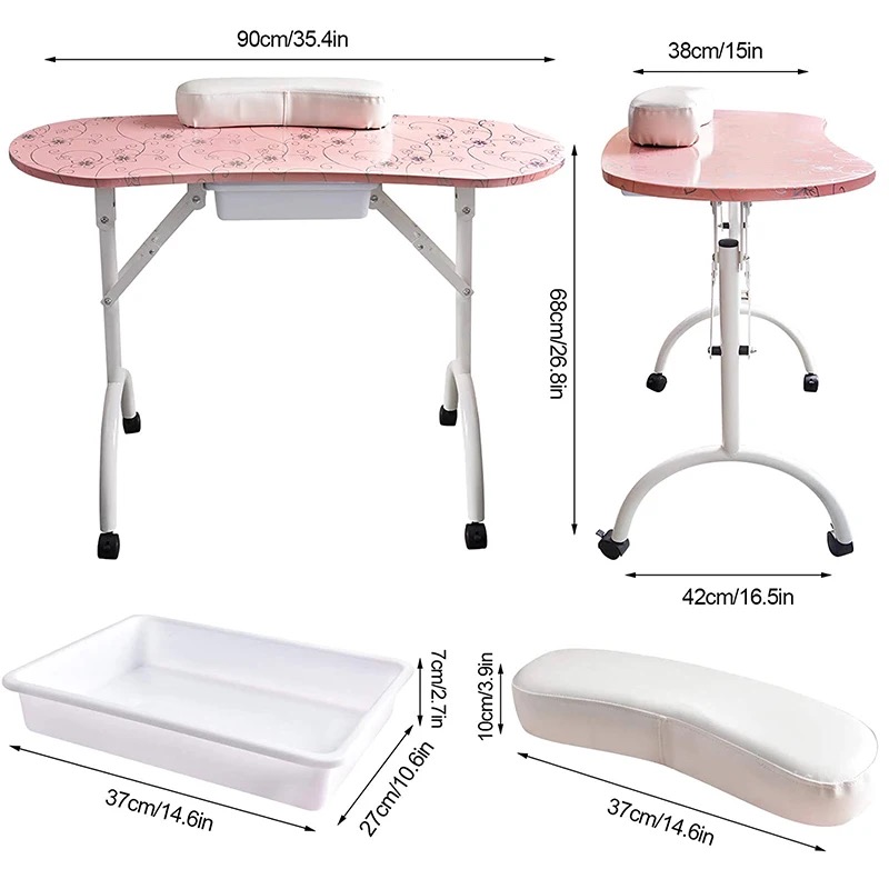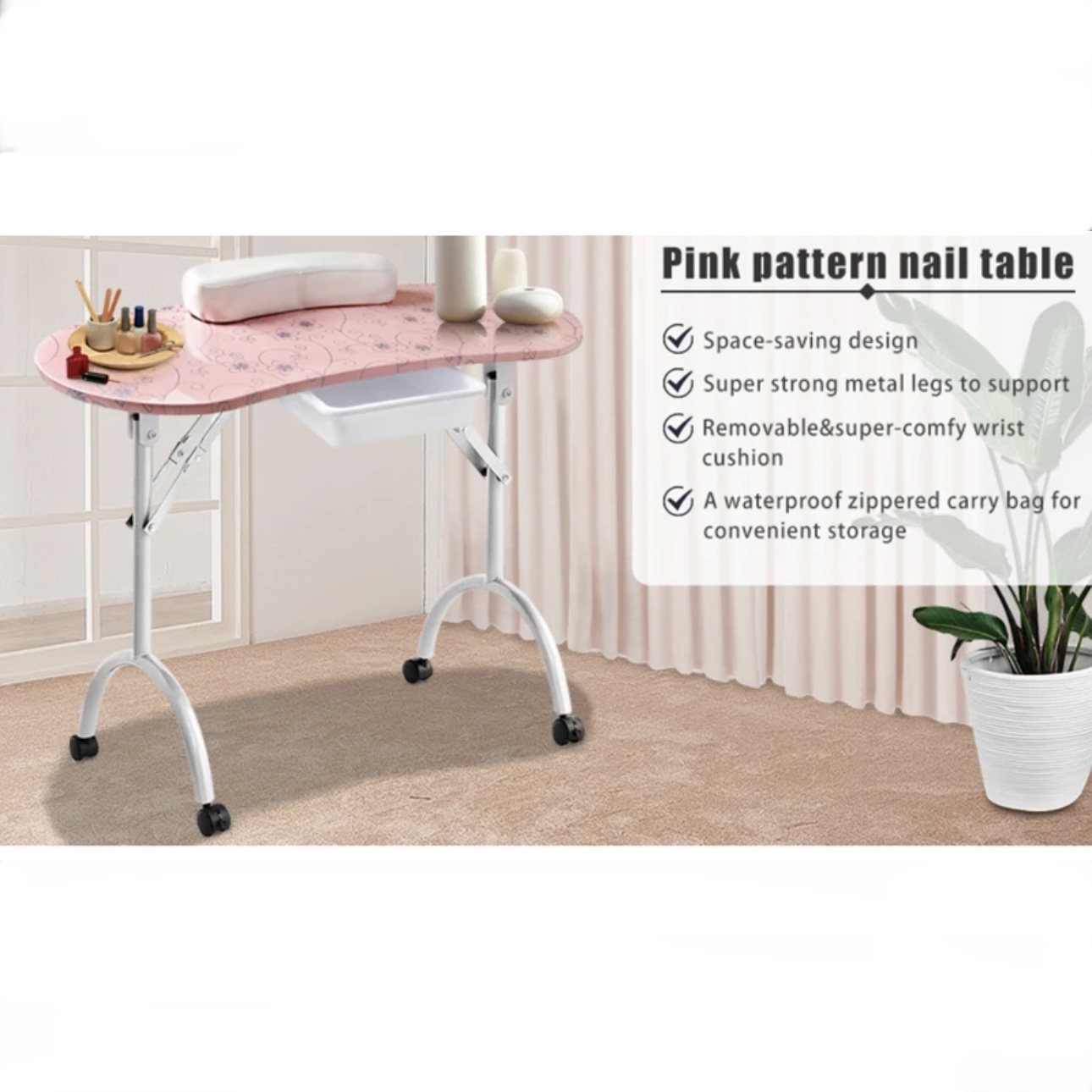[High Material this portable manicure table station is constructed of High Density Particle Board , Metal Legs, Plastic Drawer and Sponge Pad., sturdy and durable to use.Our desktop is protected by a layer of film, please tear off the film when you receive the goods. [Professional Design spacious tabletop (37 × 17.3" tabletop) can keep all your items neat and tidy. The corner of this nail desk is rounded to prevent damage caused by collision. [Removable & Foldable] This manicure table nail desk is designed with extra-comfortable & removable wrist cushion and folding metal legs for space-saving, a waterproof zippered carrying bag for storage & easy transport. [Lockable & Stable] 4 lockable rolling wheels for controllable movement; You can lock angle and wheels to ensure stability; Be able to fold it up and put it away when you don't need it. [Easy to assemble The sturdy portable nail table is easy to put together.It features stylish and fashionable design, which perfectlv decorates vour home and also adds a touch of elegant charm to your room. Pink pattern