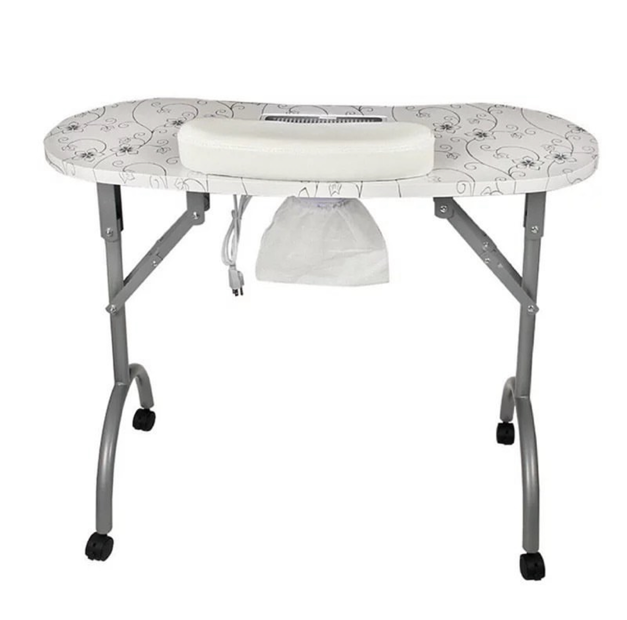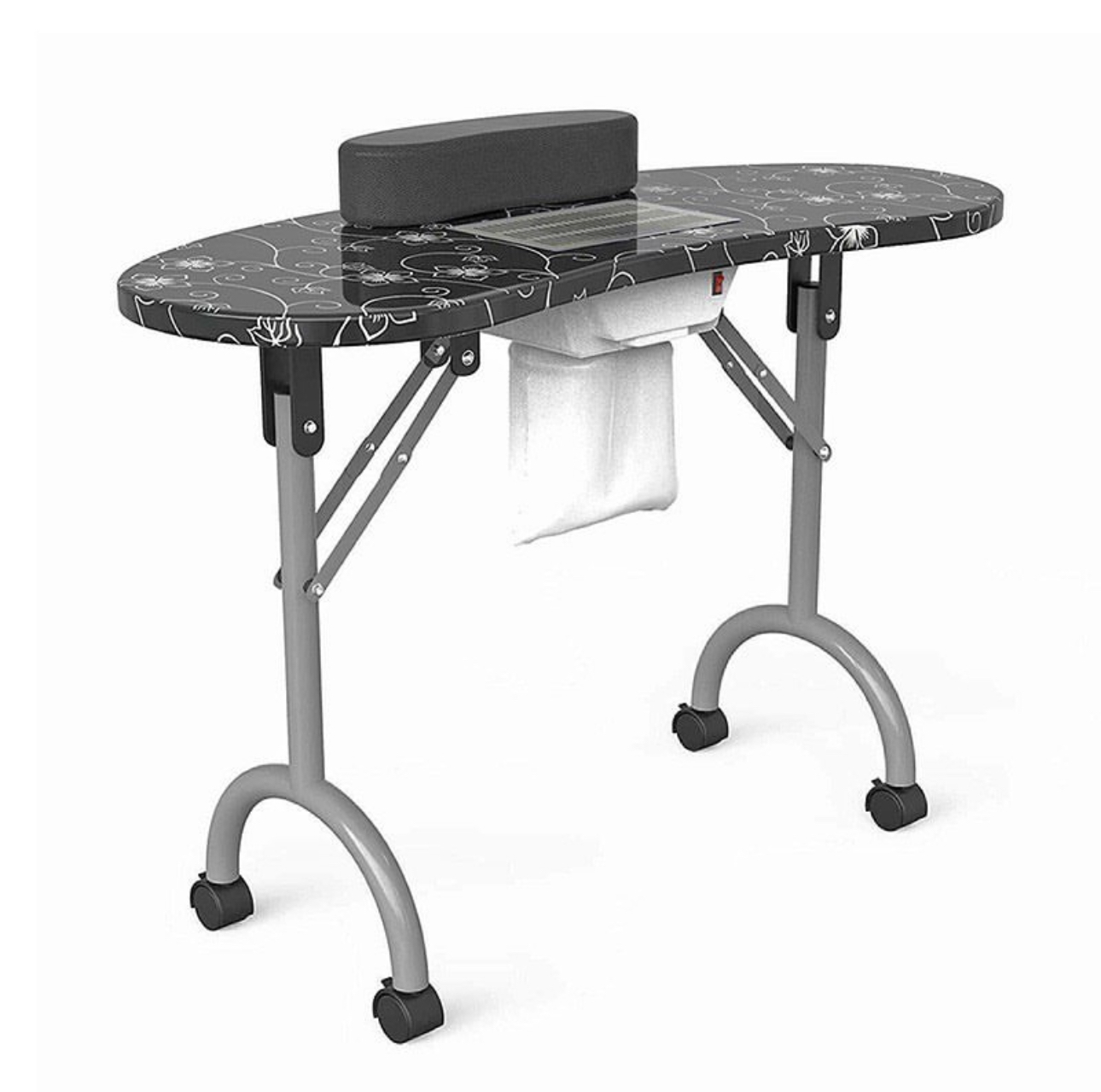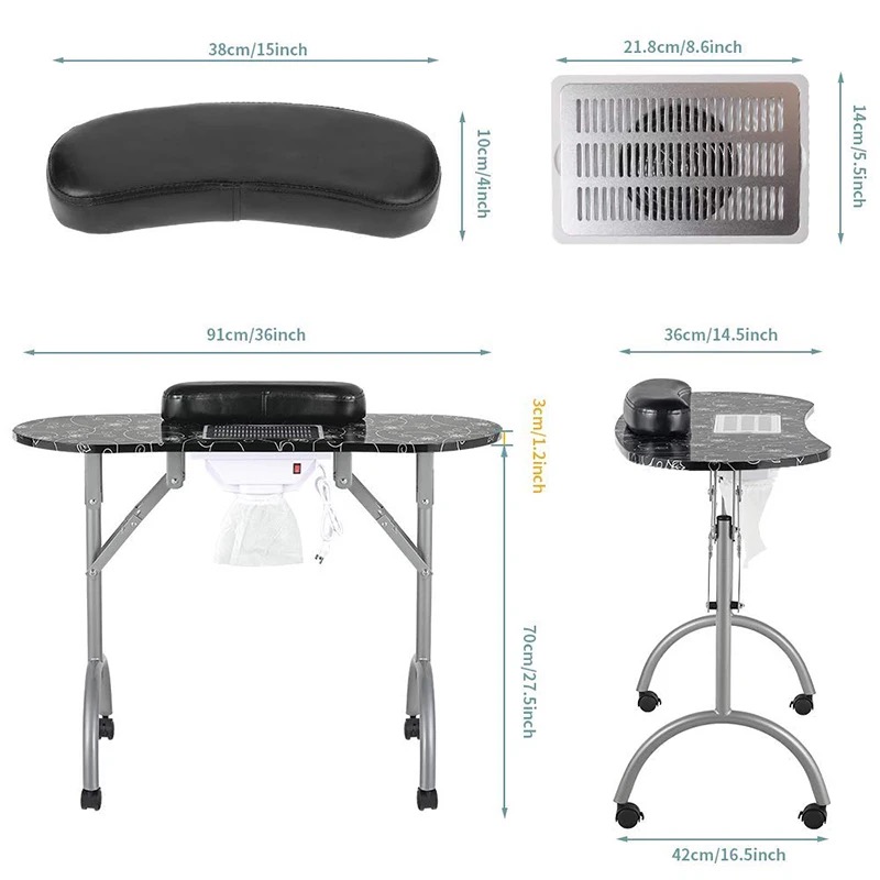 Portable Manicure Table Spa Beauty Salon Equipment Desk with Dust Collector, Cushion & Fan Portable Folding Station Desk Spa Beauty Salon With Rolling Wheels Fan Carry bag, SPECIAL MANICURE TABLE FOR YOU! Portable Manicure table with fan 4500 pm, foldable, and portable with useful carry bag. Made with the best materials. It will be possible to close every time you want to recovering useful space. At the center of the table is placed a comfortable pillow. The wheels are swivel 360° with locking system. The vacuum cleaner inserted in the center of the table is provided with a safety grid, are included in the price also three useful bags to collect dust. In the end, making it even more elegant, this splendid table we lacquered gray pearl legs. CONTENT PACK: Manicure Table with fan and european plug - pillow - removible alluminium grill - 3 bags collect dust - Carry Bag TECHNICAL FEATURES: Dimensions: 90 × 40 × 72 cm. Closed dimensions: 98 × 46 × 23cm. Suction power 4500 pm Electric consumption: only 17 w Nois level 55dB Weight: 13 Kg.