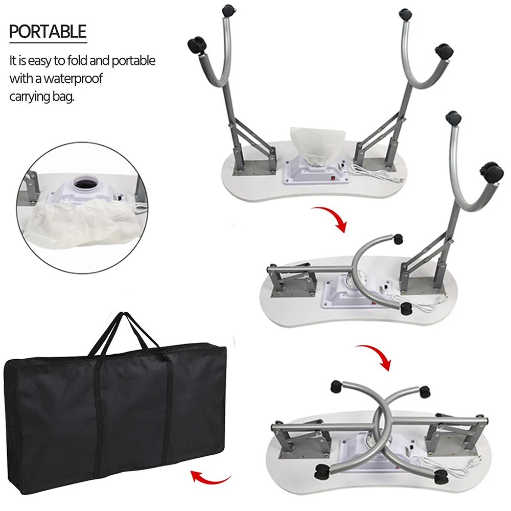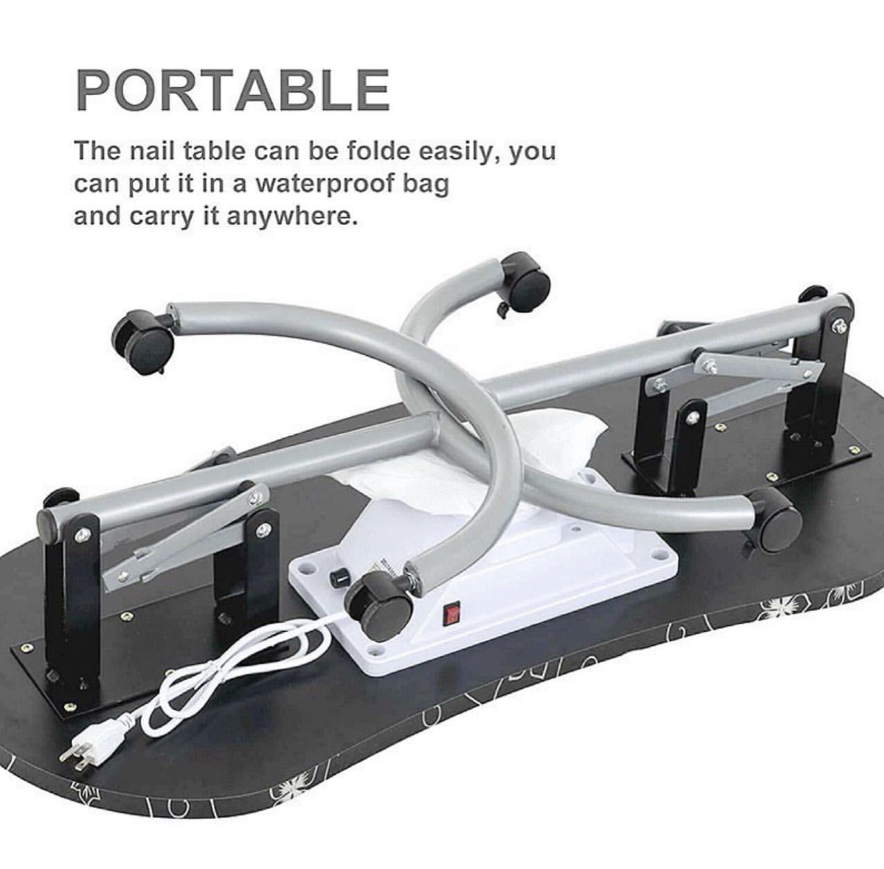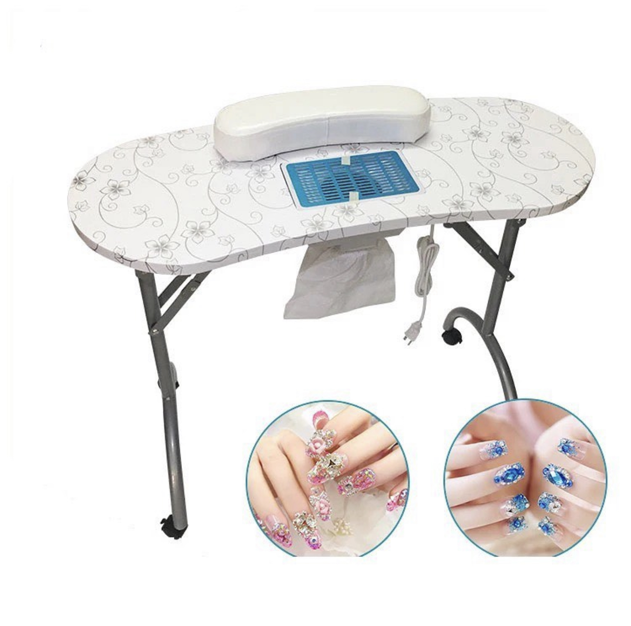 Portable Manicure Table Spa Beauty Salon Equipment Desk with Dust Collector, Cushion & Fan Portable Folding Station Desk Spa Beauty Salon With Rolling Wheels Fan Carry bag, SPECIAL MANICURE TABLE FOR YOU! Portable Manicure table with fan 4500 pm, foldable, and portable with useful carry bag. Made with the best materials. It will be possible to close every time you want to recovering useful space. At the center of the table is placed a comfortable pillow. The wheels are swivel 360° with locking system. The vacuum cleaner inserted in the center of the table is provided with a safety grid, are included in the price also three useful bags to collect dust. In the end, making it even more elegant, this splendid table we lacquered gray pearl legs. CONTENT PACK: Manicure Table with fan and european plug - pillow - removible alluminium grill - 3 bags collect dust - Carry Bag TECHNICAL FEATURES: Dimensions: 90 × 40 × 72 cm. Closed dimensions: 98 × 46 × 23cm. Suction power 4500 pm Electric consumption: only 17 w Nois level 55dB Weight: 13 Kg.