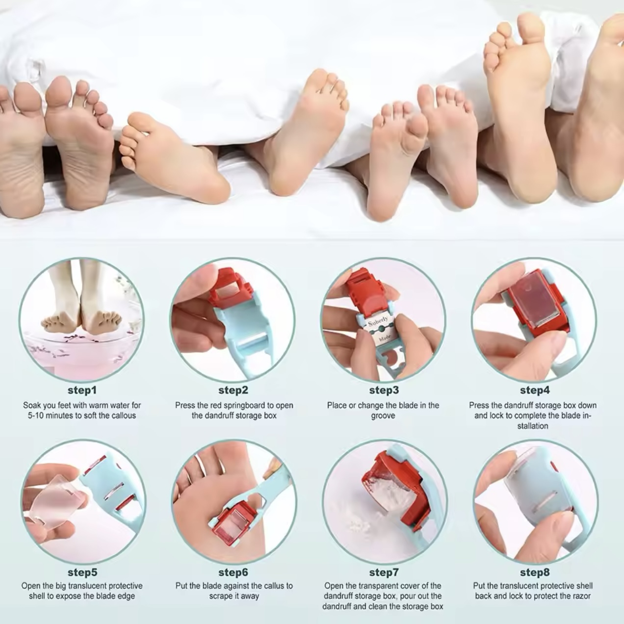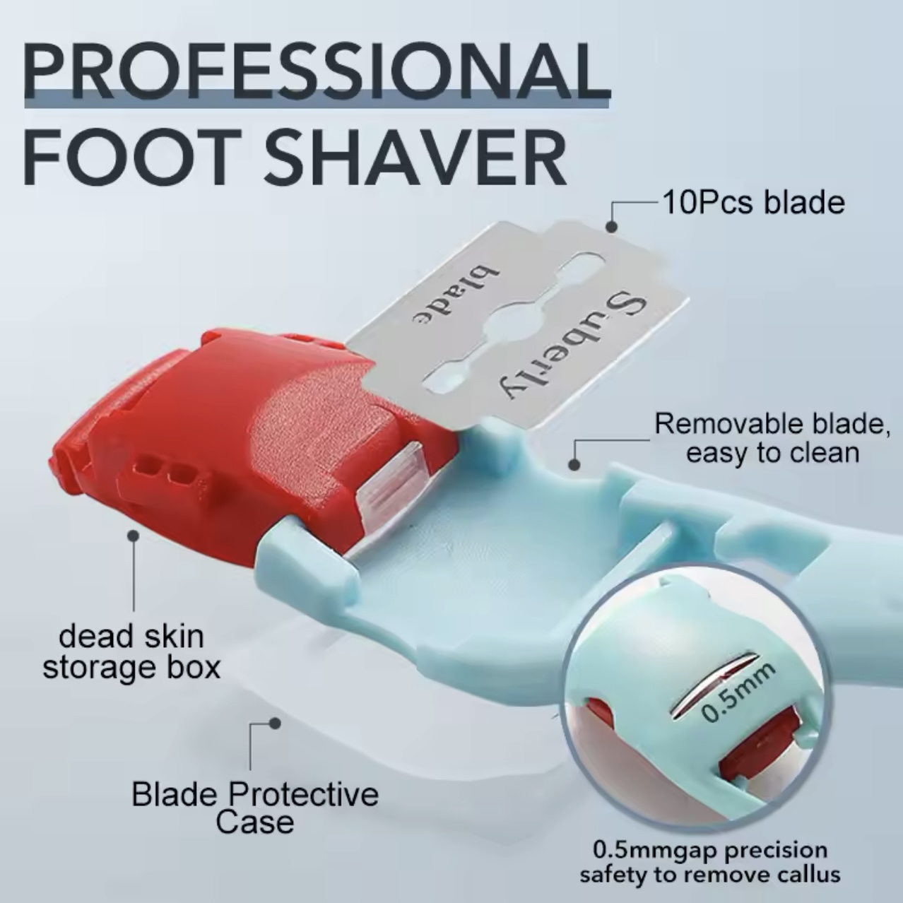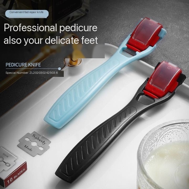 1Set of Callus Corn Shaver Foot Razor Scrapper for Dead Skin Remover. [MAKE IT SMOOTH) Do you suffer from dry skin and calluses? If so, letthis callus shaver be your instant solution. Our pedicure knife will let you rub and remove your dead skin cells, calluses and cracked skin for a smoother and softer heels. [NO MORE PAIN] Now you do not have to worry about hurting your feet or hands while removing calluses with this callus remover. We design it with safety in mind with our razor sharp blade that can effectively remove thick callus without hurting your hands or feet. [BETTER GRIP FOR YOUR COMFORT Experience an easy callus/skin scraping with less hand fatigue. Our foot callus scrubber's handle is made with plastic for a lightweight and convenient hold. [DESIGNED WITH SAFETY) we want your safety and convenience. Our callus knife has a dander storage box that can prevent the dander/callus from flying around and convenient for you to get an extra callus blade whenever you need it. [WHAT'S INSIDE You can now say good bye with problematic and dry skin - for a long time. Our package has 1 callus scraper including 10 callus blades with container for your multiple use. Portable pedicure knife