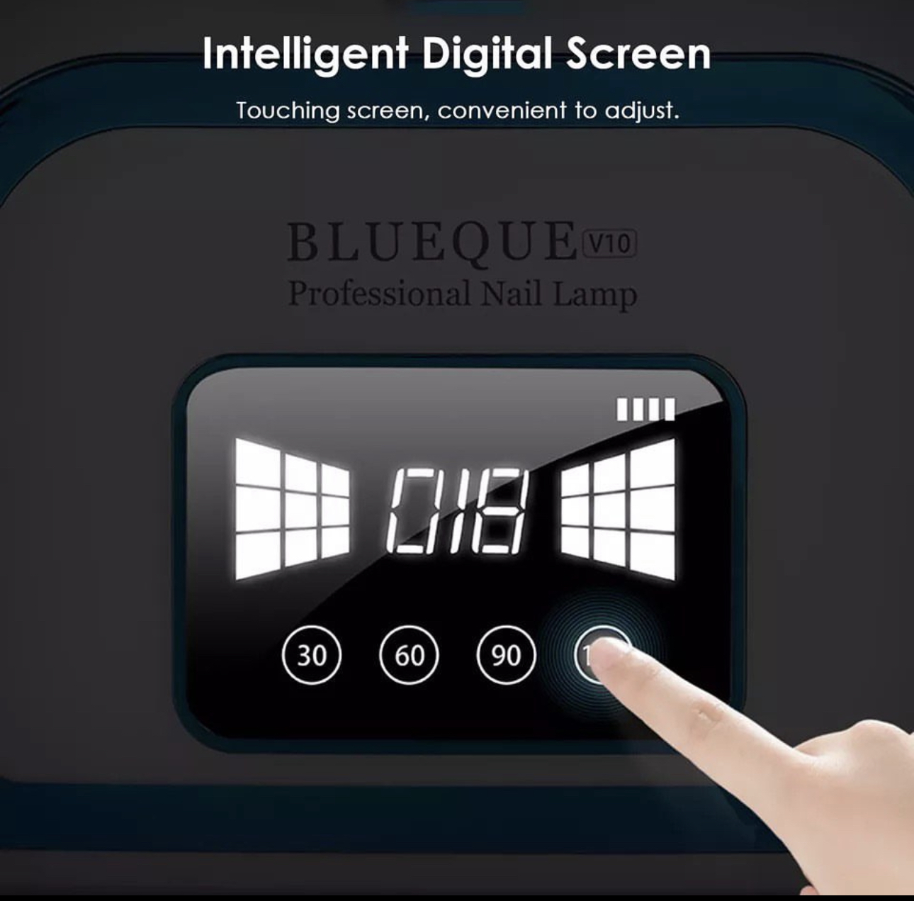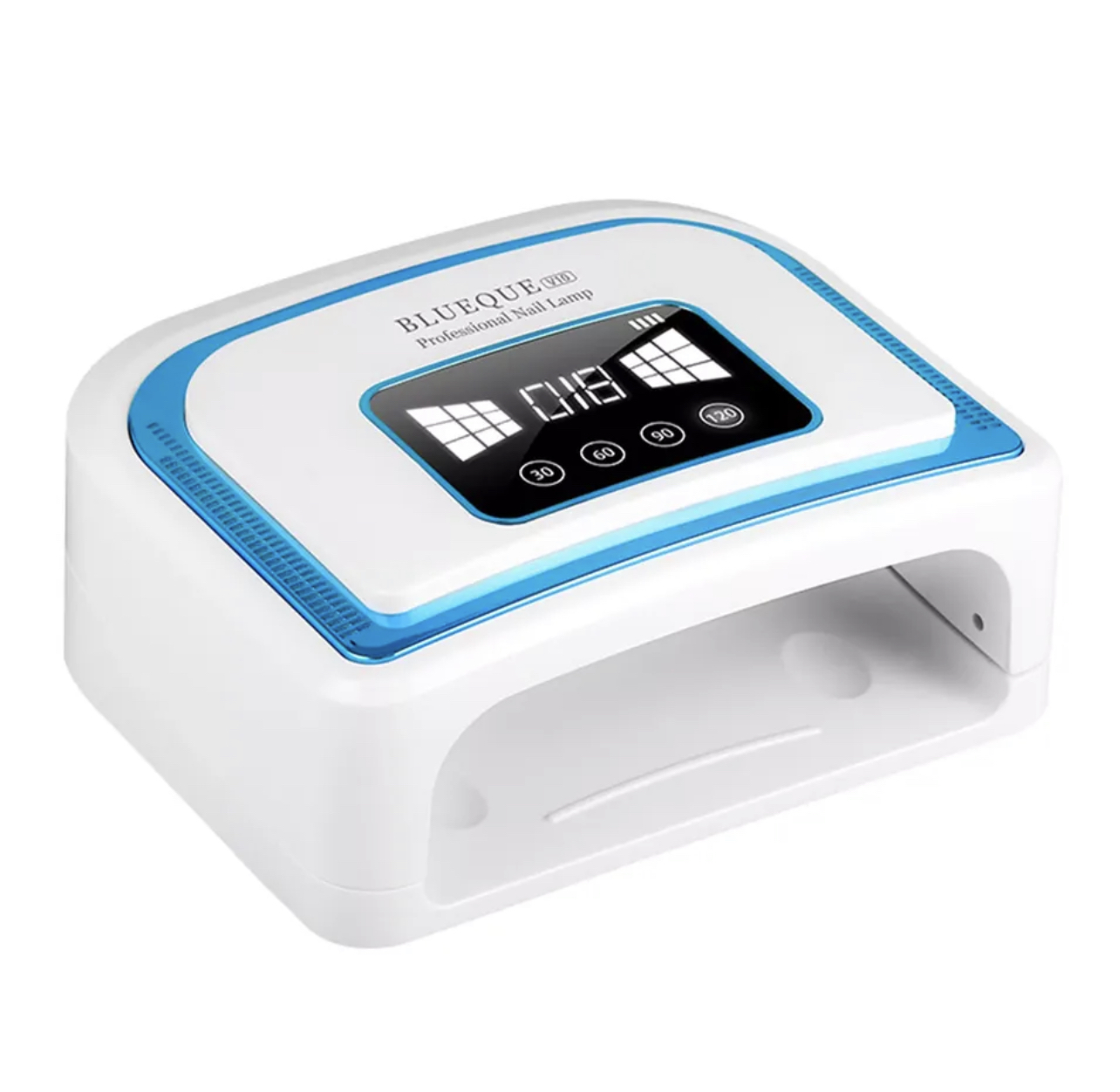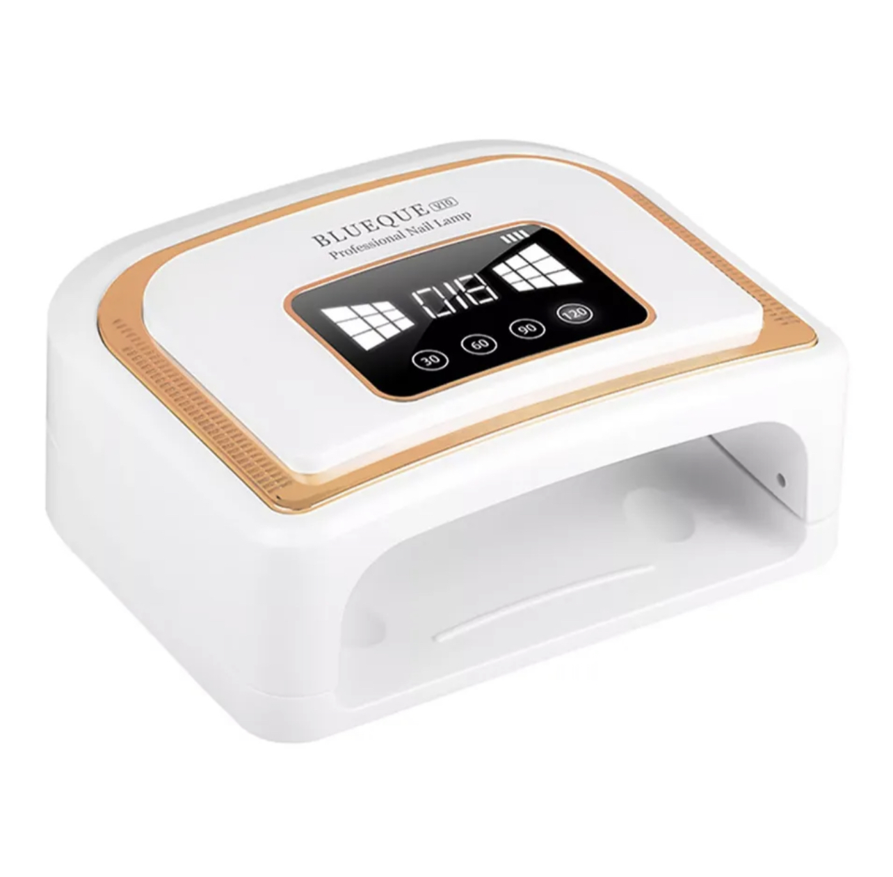 Specification Brand:BLUEQUE Material: ABS plastic Battery capacity: 7800MAH Voltage: 110-240V 50-60HZ Power: 120W Color: Gold , blue Lamp beads: 30pcs UV/LED dual light source Charging time: 2 hours Button: smart sensitive Product size: 22.5*18.2*8CM/8.85*7.16*3.14in 【Portable Nail Dryer】: This 120W wireless nail lamp built-in rechargeable lithium battery 7800mAH battery, 6-7 hours continues working time after2 hours full charging (can be used while charging). You can take it anywhere you want. 【White Light】White light does not darken the hands and softly protects the skin 【Rechargeable Cordless Design】: Rechargeable gel nail LED UV light,equipped with new professional designed UV+LED dual light source.Curing more faster, with smart automatic infrared sensor & time touch button control, LCD display screen for service time left and power state showing. 【 3 Timer Settings】: Normal 30s/60s/90s timer settings for better cure the gel polish according to your DIY needs and gel polish's requirements. 【Easy & Rapid & More Space】Designed for hands and toenails, manicures and pedicures, Achieve salon results in seconds for both home and professional use. 【Long Usage Life & safety】: 30 durable LED light beads,with a life span of 50000 hours nonstop, lasting up to 5 years of continuous use. No need to worry about the replacement of the light beads.