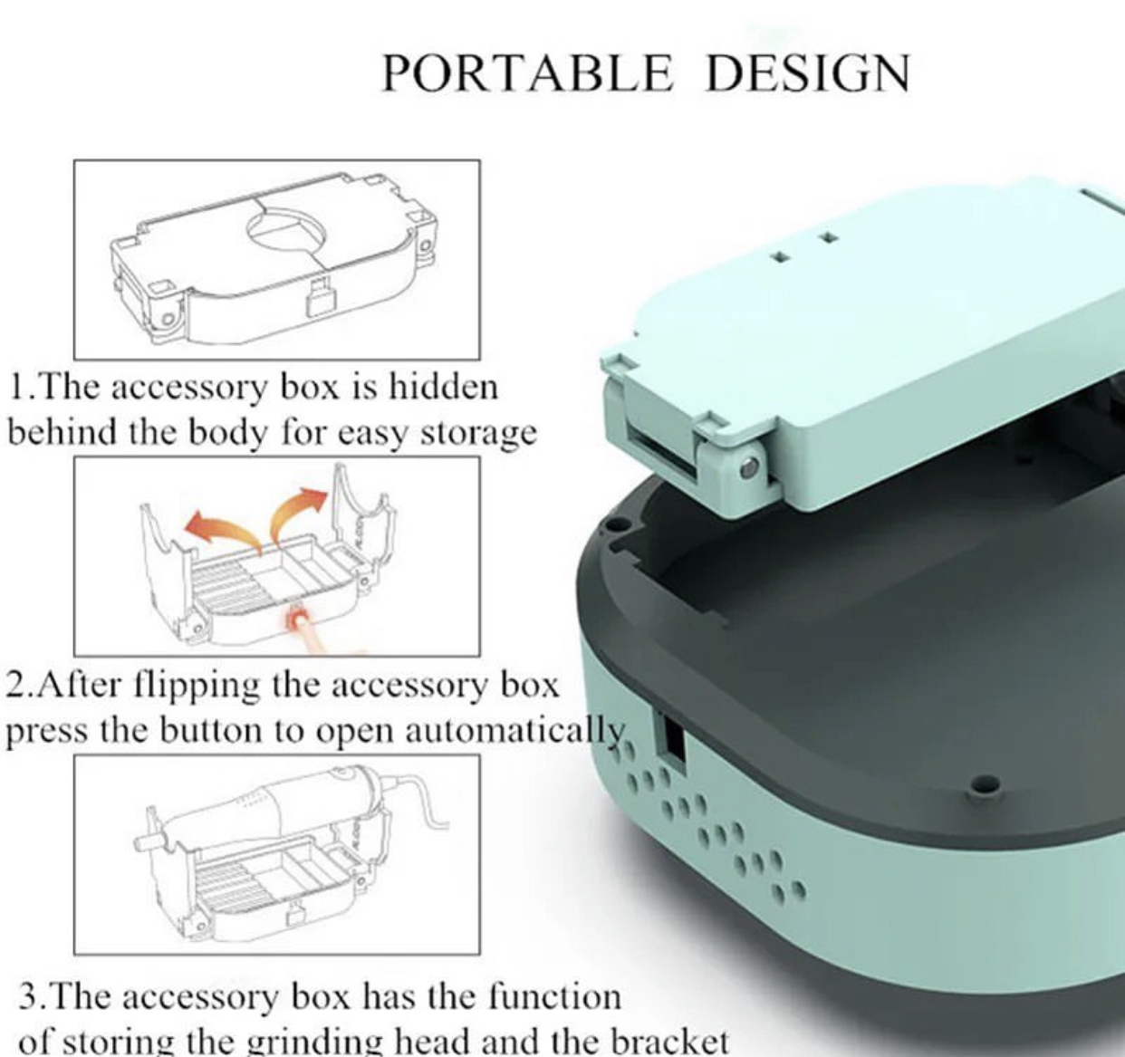 Product Description: Smart Electric nail drill Machine Adjustable speed Nail Grinding Manicure Polish Nail File Pedicure Drill Set Nail Drill Equipm Description: Description: 100% brand new and high quality Smart Electric Nail Drill Machine Main Features 1.Smat igh-tech design; one button to control start and stop 2. Alternate light colors indicate FWD/REV spinning direction 3. The bits box is designed to be inlayed in the machine to store the ece to hold the 4. Imported motor adapted to ensure that the drill is efficient and quiet. Specification Voltage: 110V Power: 24W Collect: 2.35mm (3/32‘’) Rated Speed: Up to 25000RPM Operation Steps: 1. Press the power switch on the machine for 3 seconds to turn on. 2. Press the handpiece switch to start the handpiece direction for the dril bit FW2 ne machineto select the spinning 4. The alternate gnt colors on he fast always shs that heRoeS achine indicate the FWD/REV not working. When the alt means that the machine is working Blue indicates FWD, and Re indicates REV: the default color is Blue 5. Spin the speed control knob on the machine to adjust the speed The direction light will go off to indicate that th seconds to turn off 6. Press the power switch on the machine Specifications: 1.Smat igh-tech design; one button to control start and stop 2. Alternate light colors indicate FWD/REV spinning direction 3. The bits box is designed to be inlayed in the machine to store the ece to hold the 4. Imported motor adapted to ensure that the drill is efficient and quiet. Package Included: 1*Adjustable speed host 4*Grinding head 1*Handle 1*English manual Notes: 1. Don't change the turning directions to frequently, otherwise it will damage the grinding head 2. While the grinding head is in operation, never pull out the 5. 5plug of the portable grinding head 3. For long idle time please disconnect the source power 4.Children should be spervised to ensure theat they do not play with Specifications: 1.Smat igh-tech design; one button to control start and stop 2. Alternate light colors indicate FWD/REV spinning direction 3. The bits box is designed to be inlayed in the machine to store the ece to hold the 4. Imported motor adapted to ensure that the drill is efficient and quiet. Package Included: 1*Adjustable speed host 4*Grinding head 1*Handle 1*English manual