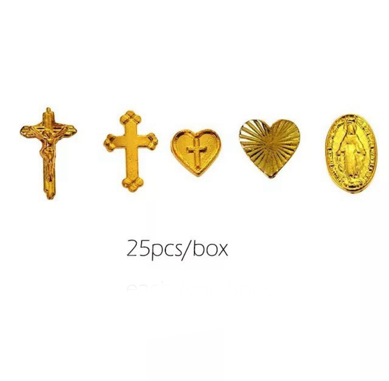 Type: Holy Jewelry Specification: Quantity: 10pcs Size: as the picture show Color: Gold / Silver Material:Metal+Zircon+Pearl Package Contents: 1Pcs/lot 3D Nail Art Decorations Feature: 100% brand new and high quality 3D Nail decoration Clean the surface of your nails, brush the base polish, and place it onto nails You can also use them to decorate your home, cell phone's case, glasses, made card, body art, etc. How to use: Step 1: Apply a layer of base coat and cure it. Step 2: apply a layer of your favorite nail gel color and cure it. Step 3: Apply glue to the nail surface for decoration. Step 4: Use your nail tool to light your accessories. Step 5: Put the accessories in the right place. Step 6: Apply top coat and cure it.