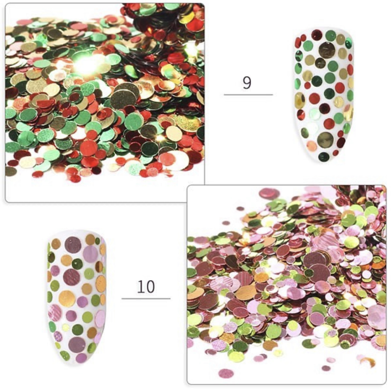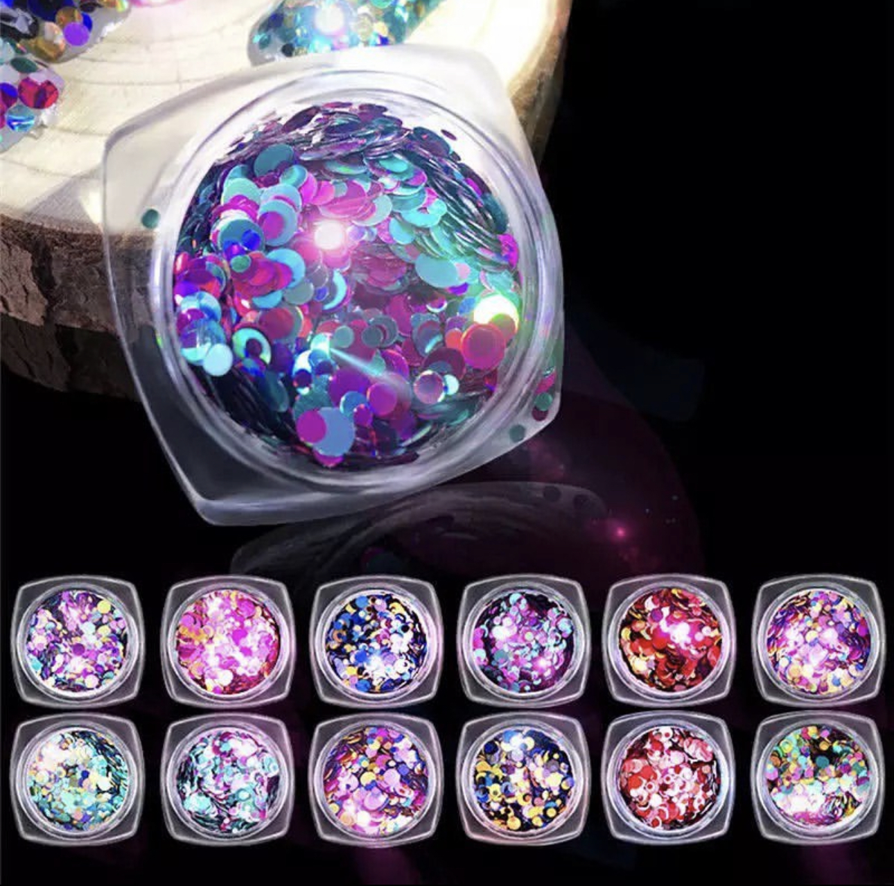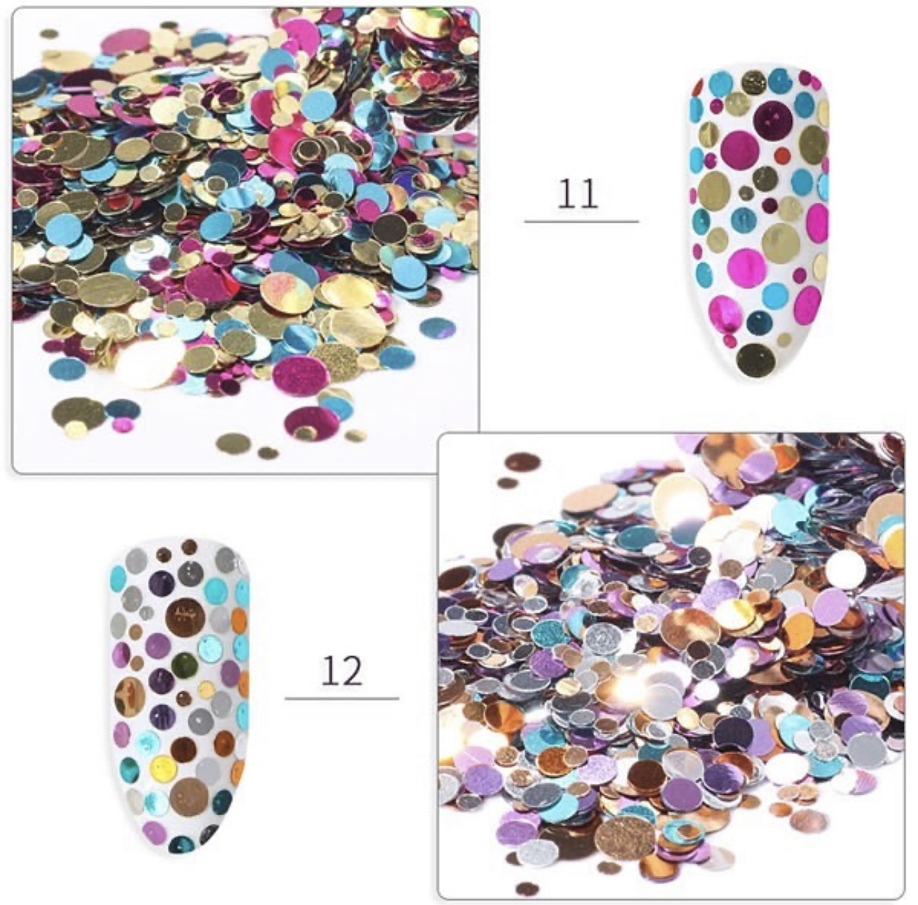 Designs: round Glitters Color: Colorful Quantity: 12 Jar/Box Package Contents: 12 Jar Of Nail Glitter How To Use: 1. Prepare Your Nails With Uv Base Coat And Cure It Under Uv/Led Lamp. 2. Apply Uv Color Gel (Do Not Cure). 3. Apply Nail Sequins Onto Your Nails. 4. Cure It Under Uv/Led Lamp. 5. Seal It With Uv Top Coat And Cure It Under Uv/Led Lamp.