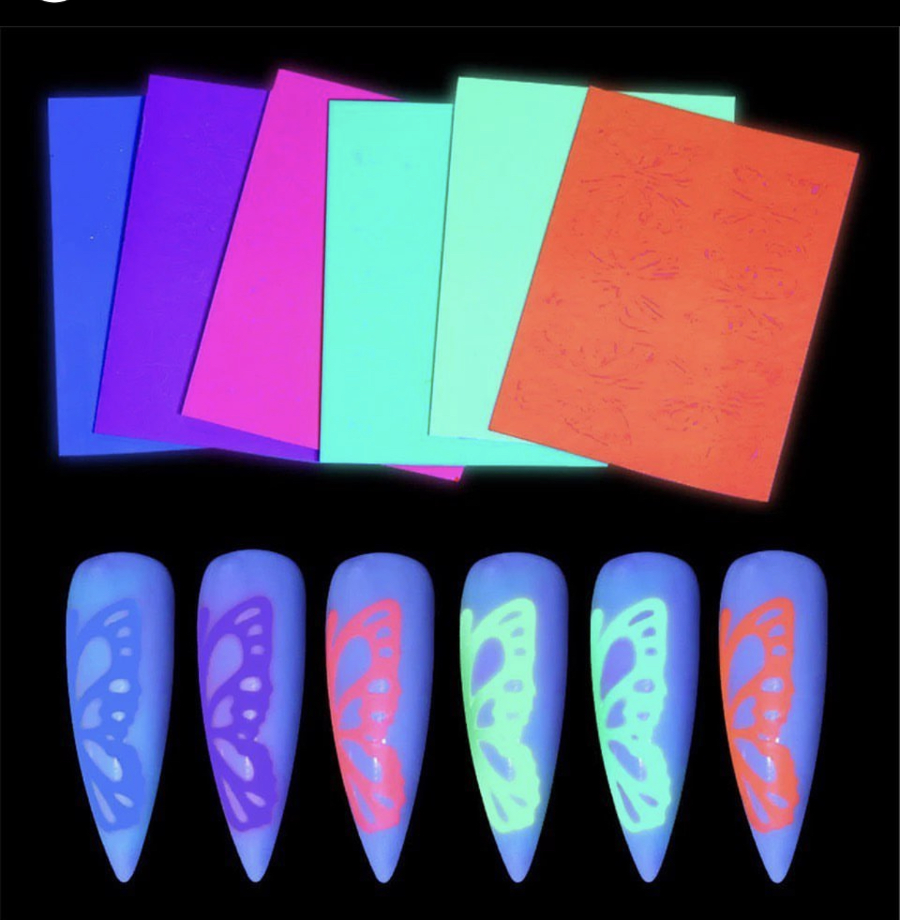 • Product features: Removable, waterproof, mildew proof, Environmentally friendly. • Applicable occasions: can be pasted on any smooth,well filed and polished nail. •Use strong light such as sunlight or a flashlight to directly illuminate the sticker for more than 15 minutes, and the sticker will flicker for 4-6 hours in the dark. • Under normal circumstances the sticker can absorb enough natural light during the day and then shine at night. • DIY Decoration Set Our neon Butterfly sticker set is perfect for decorating your nails. • The neon butterfly stickers allow you to place in a realistic dream world, adding a dreamy and romantic atmosphere to your nails.