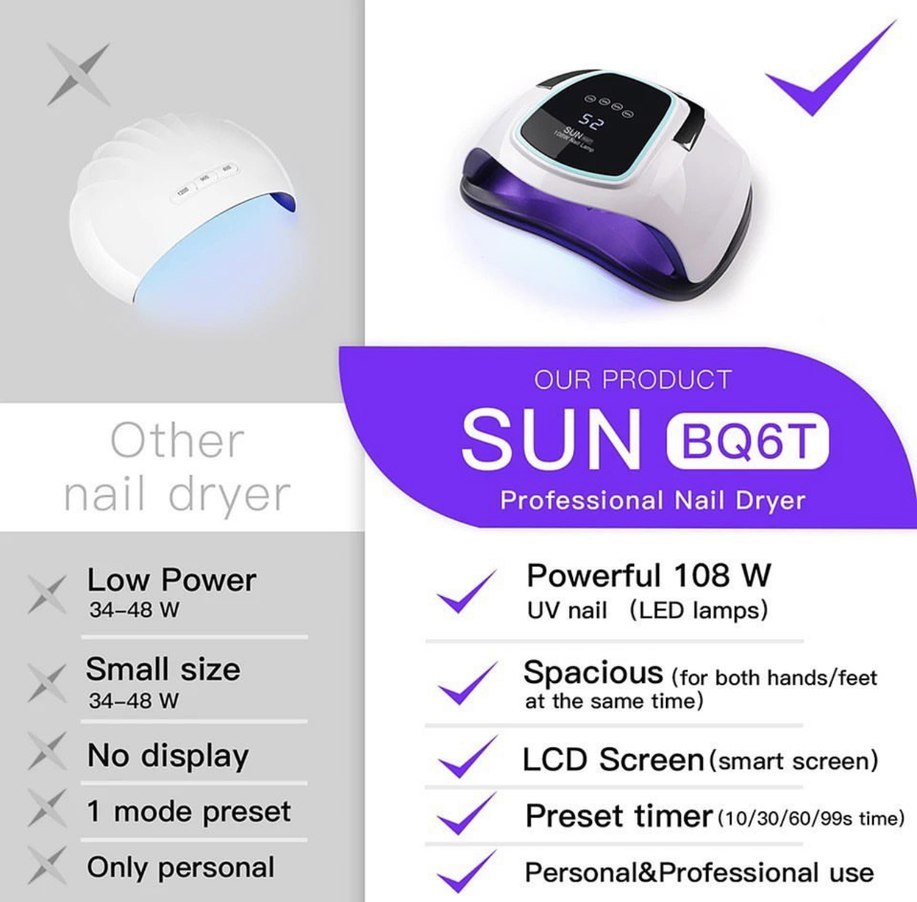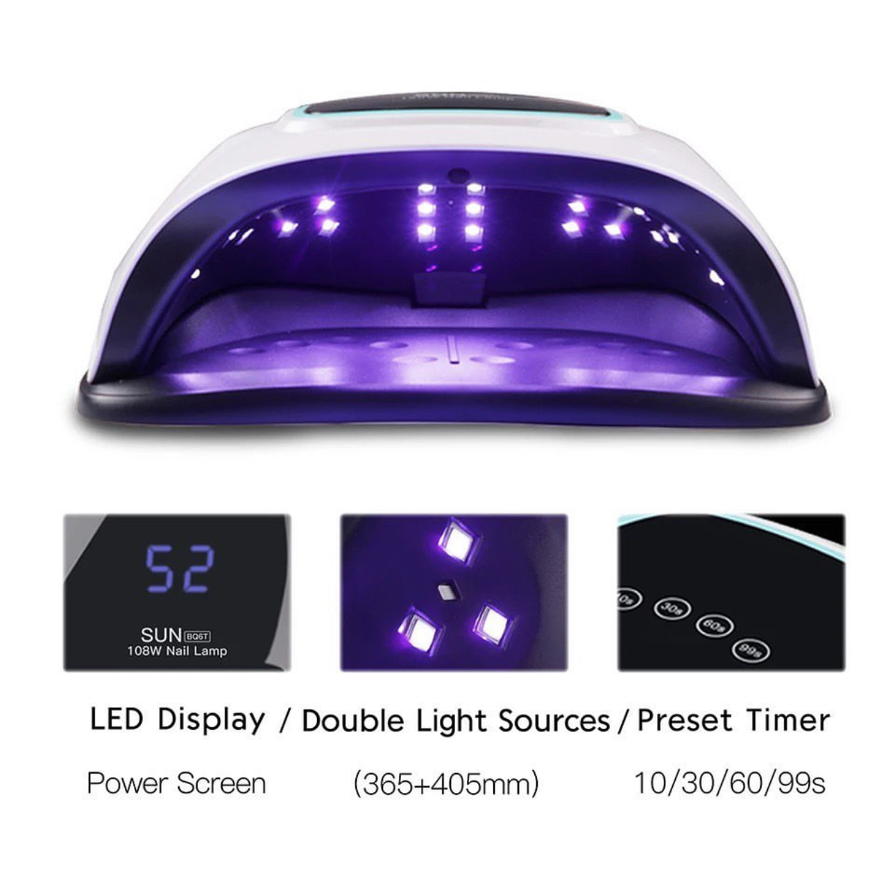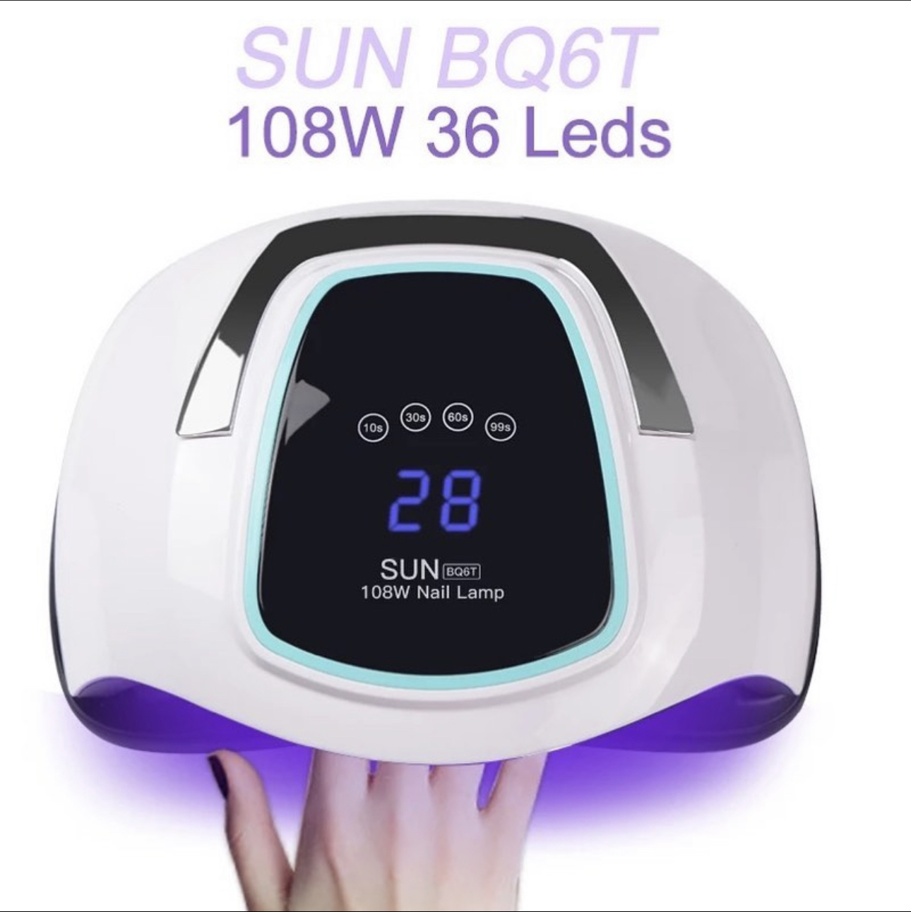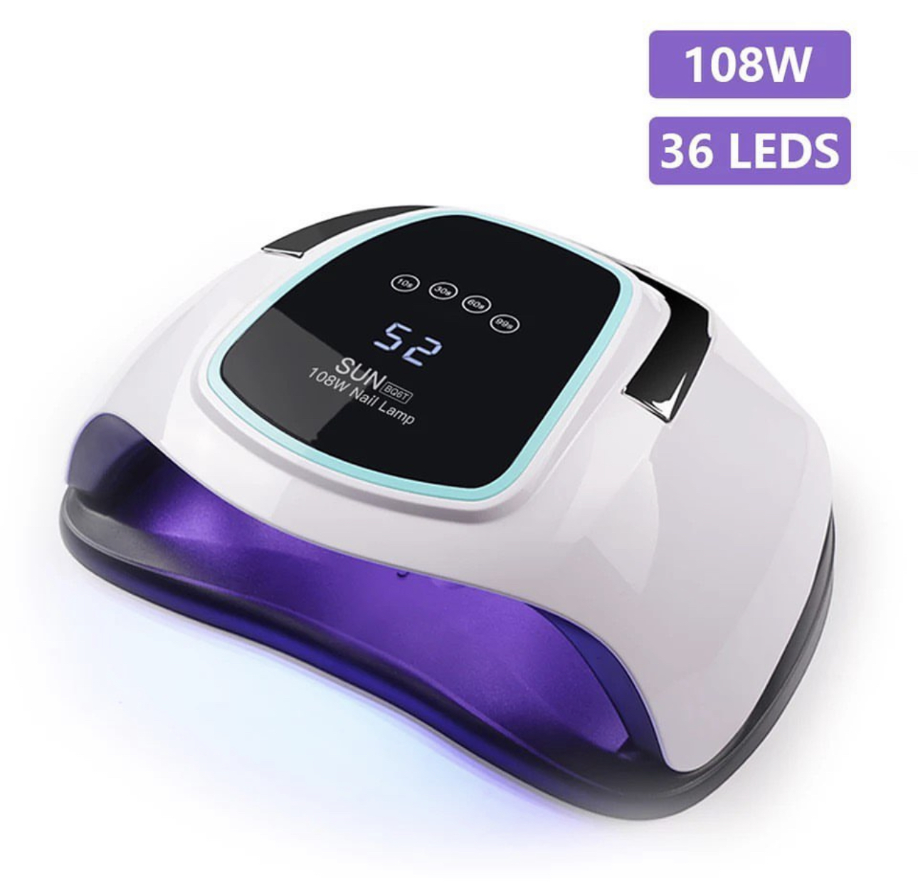 • 36 LEDs for fast drying :With 36 LEDs, this nail dryer quickly and efficiently dries gel polish, saving you time and effort. • UV light for professional results :The UV light feature ensures that your nails dry evenly and thoroughly, giving you professional-looking results every time. • CE certification for safety :This nail dryer is certified by CE, ensuring that it meets safety standards and is safe to use. Specifications: Product Name: Nail Lamp Power: 108W Plug:EU PLUG/US PLUG Material quality:ABS Baking Type: Phototherapy Glue, Nail Polish, Extension Glue, Etc. Weight: 715g Size: 22.5x19.5x10.2mm Features: 1. Nail Dryer, 108W high-power, fast drying 2. Fast Drying UV Glue/Extended Glue/LED Glue 3. Light Therapy Machines Wont Make Your Hands Dark Or harm to the eyes, 4. Not Only For Nails, But Also For Toes 5. Infrared sensing settings,30S 60S 90S 120S four speed modeSuitable For Home And Professional Use Package Included:1 * nail lamp, 1 * EU/US power adapter, 1 * instruction manual, How to use UV Nail Lamp? 1.Fully charge the nail lamp first. 2.Apply a thin coat of gel polishes to clean, dry nails 3.Use the appropriate timer (30s/60s/90s/120s low heat mode) depending on the requirements of your gel polish. (The UV nail lamp works automatically when you place your hand in the nail lamp. If you have selected a timer, the nail lamp will automatically stop working when the timer ends) 4.Curing time varies depending on gel polish brand. For best results, avoid moving your hands too much until the curing is complete. 5.Choose the curing time according to the thickness of the glue. If the glue is applied thicker, the time will be longer