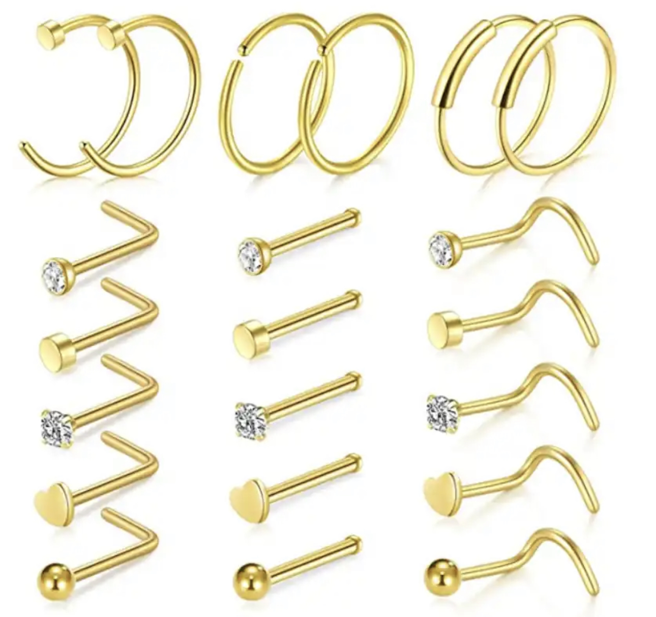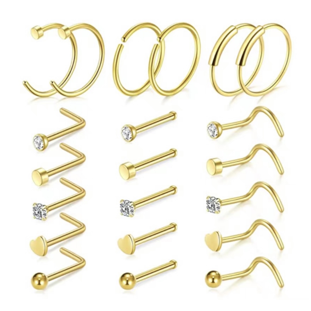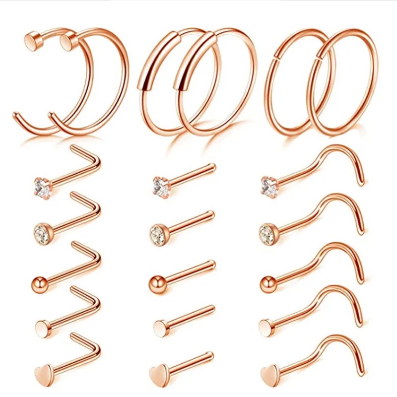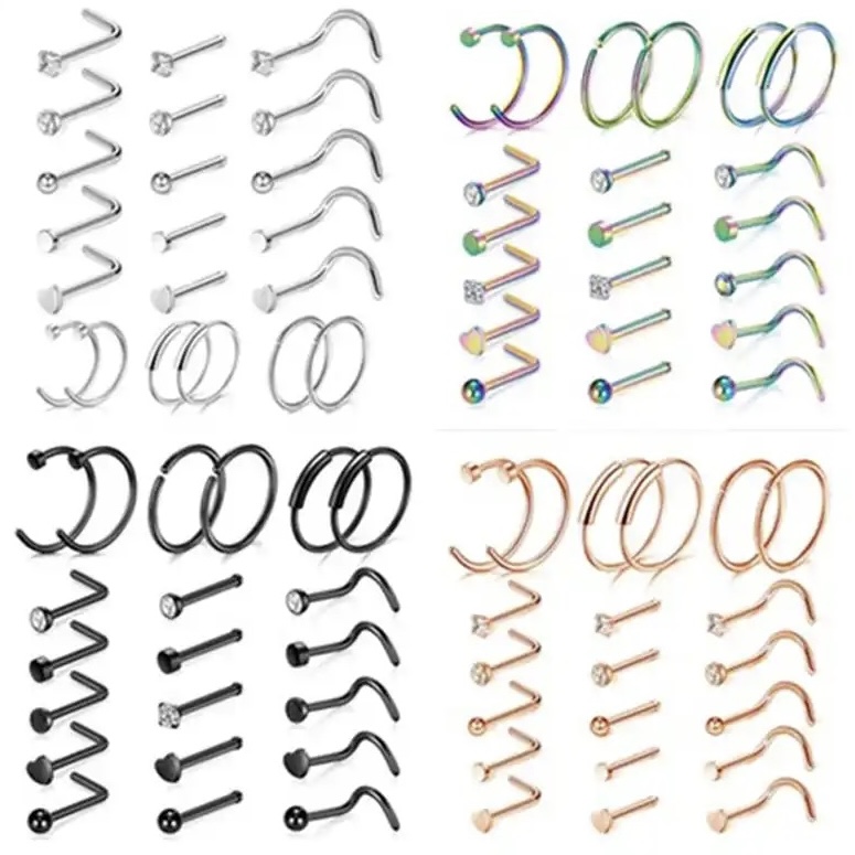 Item description: nose rings suits Material: stainless steel Color: silver, black, rainbow color, rose gold Packing: OPP bag Including: 21 pieces Size: 0.8 mm (20 g)