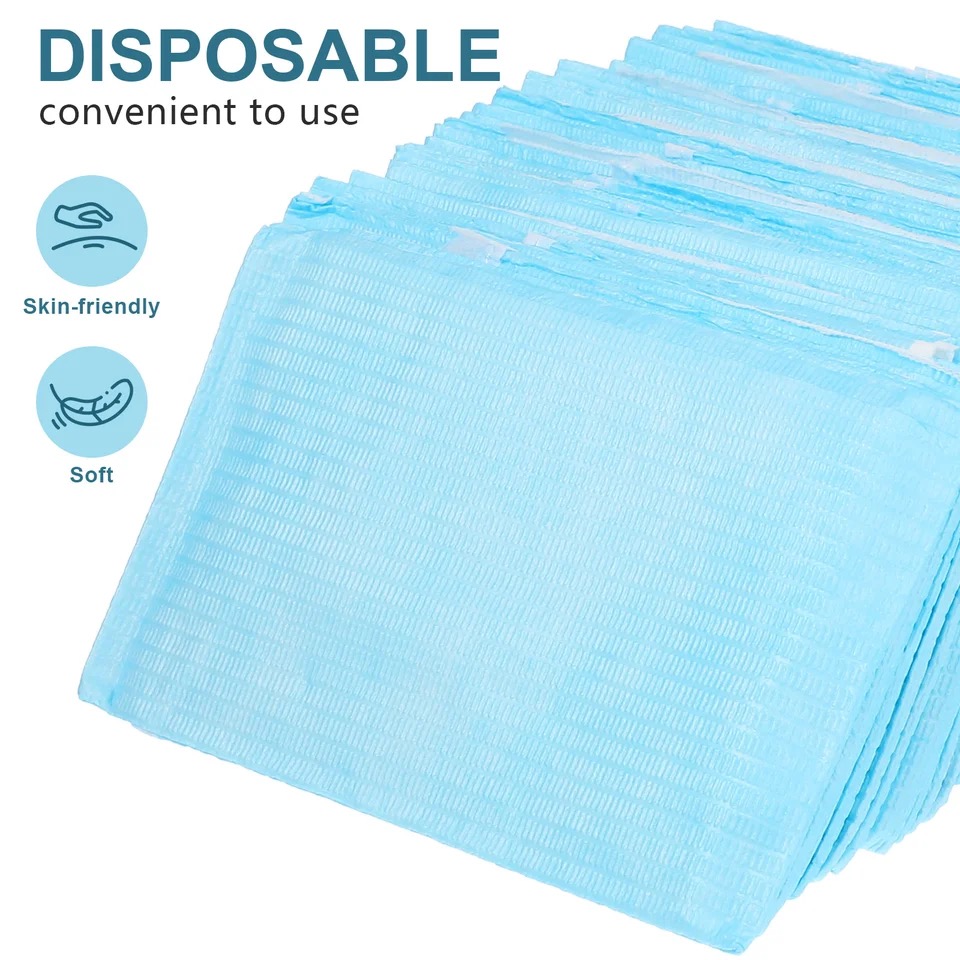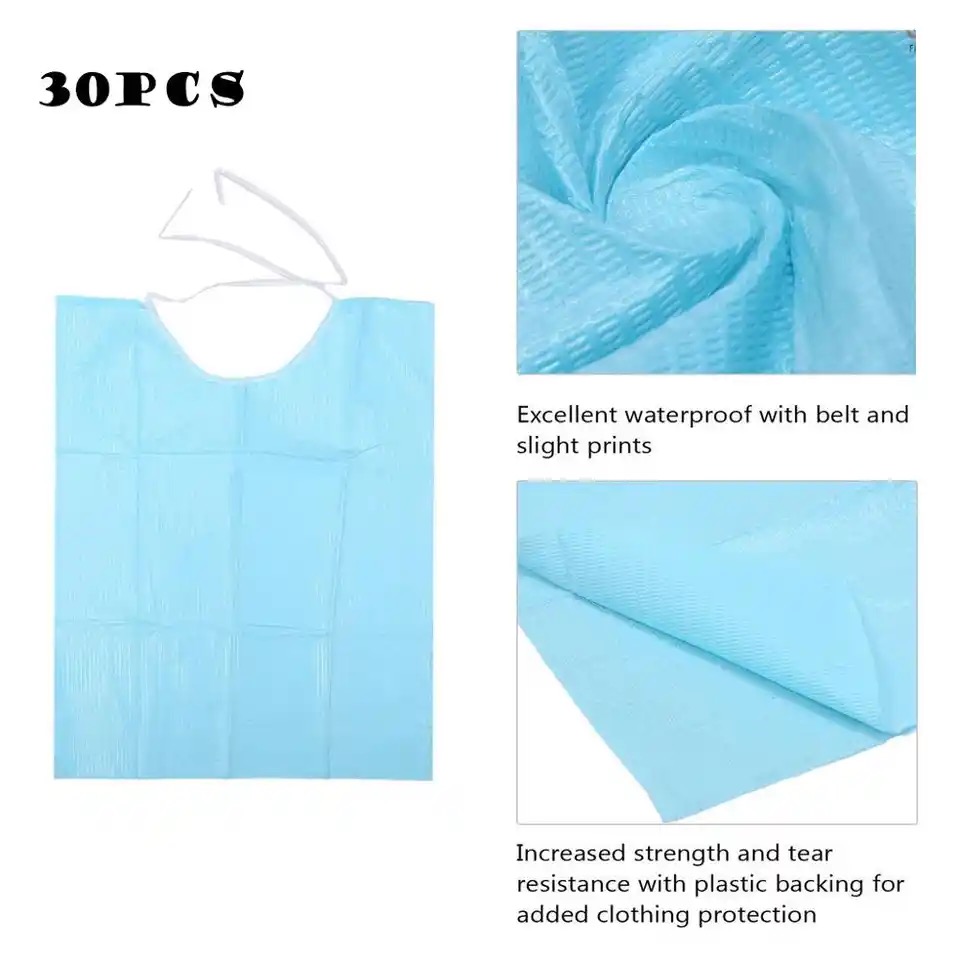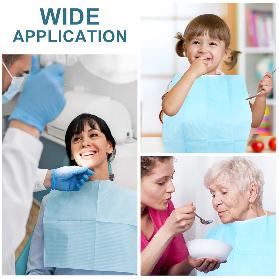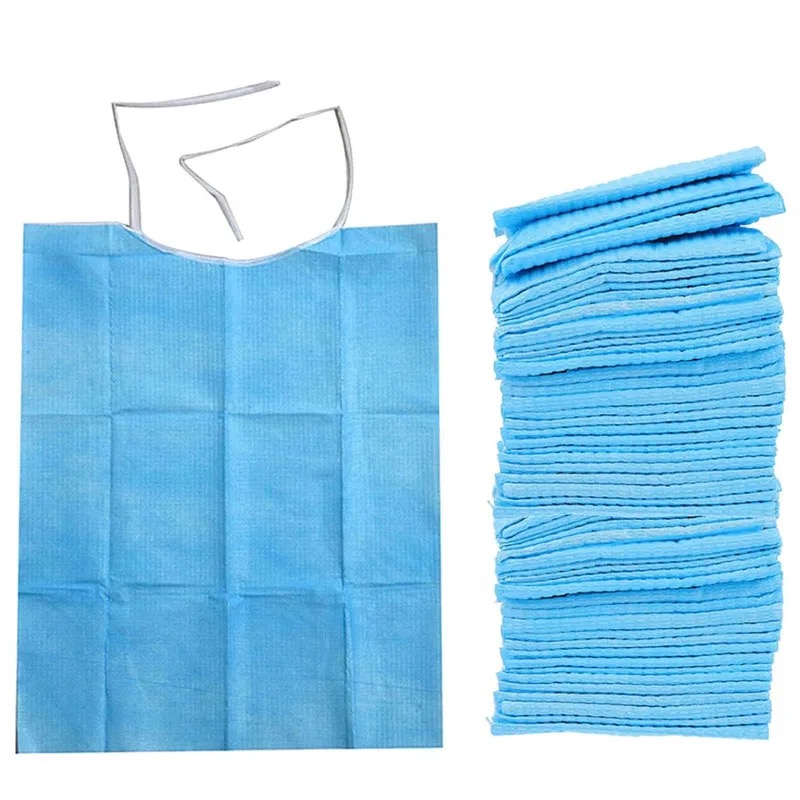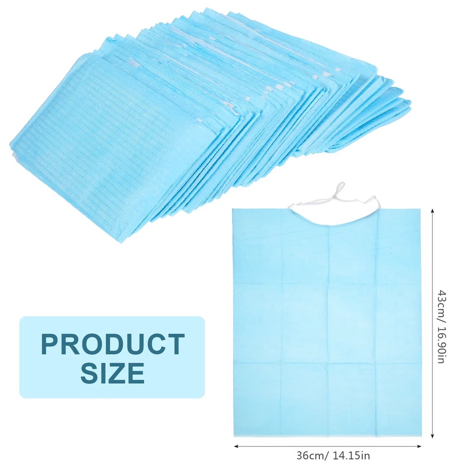 1.Disposable Bibs for Dental Clinics or Salons 2.Waterproof sheets keep fluids and spills off of the patient 3.Beautiful design with faint design on each bib 4.3 ply material designed to be more tear resistant 5.Each Bib has it's own laces to secure to patient Advantage: These Dental Bibs are large rectangles of thin waterproof material with a cutout for the neck and are held in place by inividual ties attached to each bib. Suitable for dental clinics and salons, each sheet is blue and has a faint print pattern on it. These bibs are aesthetically pleasing ano keep spills and fluids off of your patient during treatments such as cleaning, teeth whitening, and others. The material is 2 layers of tissue with 1 layer of plastic for waterproofing and designed to resist tears better than other thin dental bibs. Each bib has it's own individual tie as opposed to a reusable clip for convenience and hygiene. * Excellent waterproof with Belt and slight prints * Maximum protection with horizontal embossed pattern and a unique water repellent edge