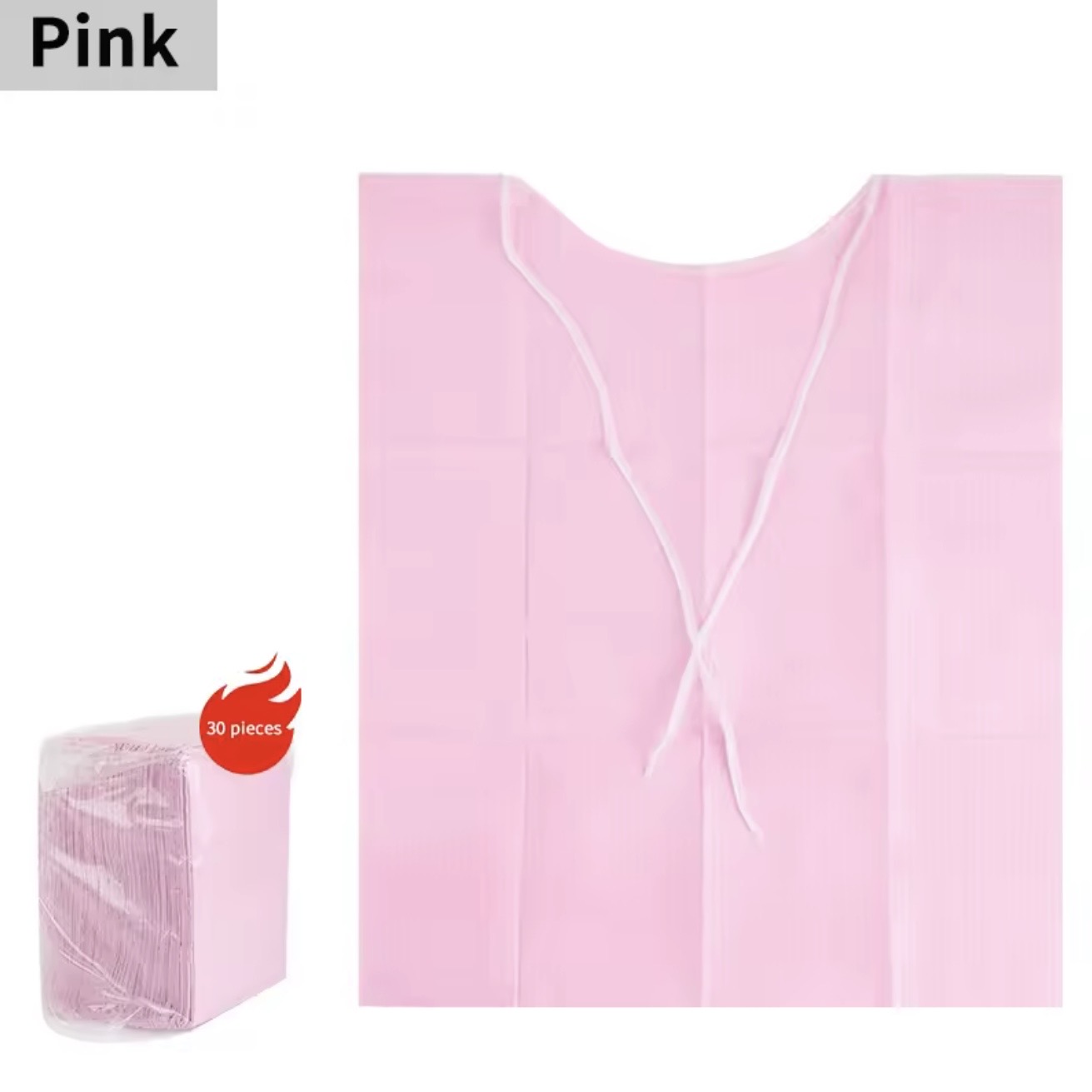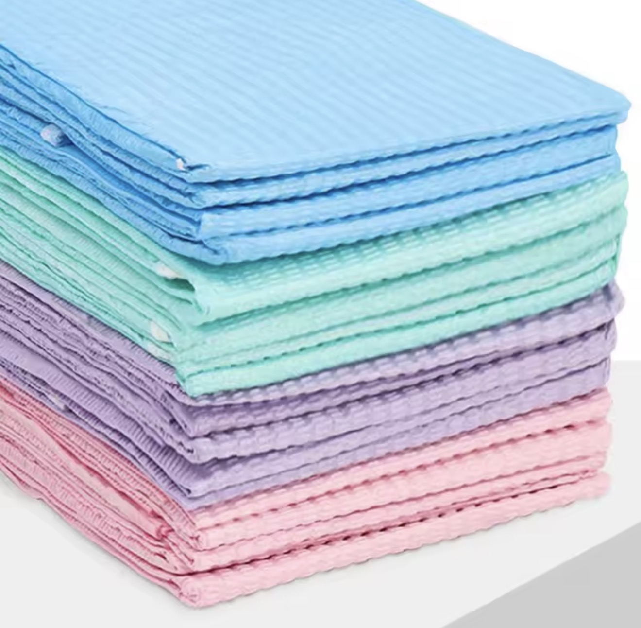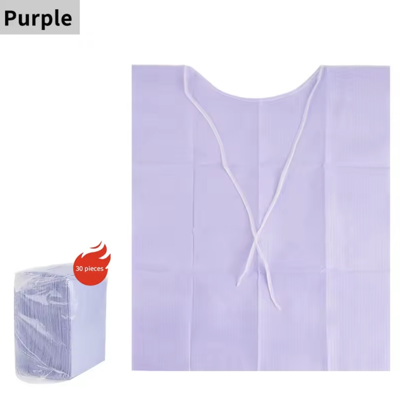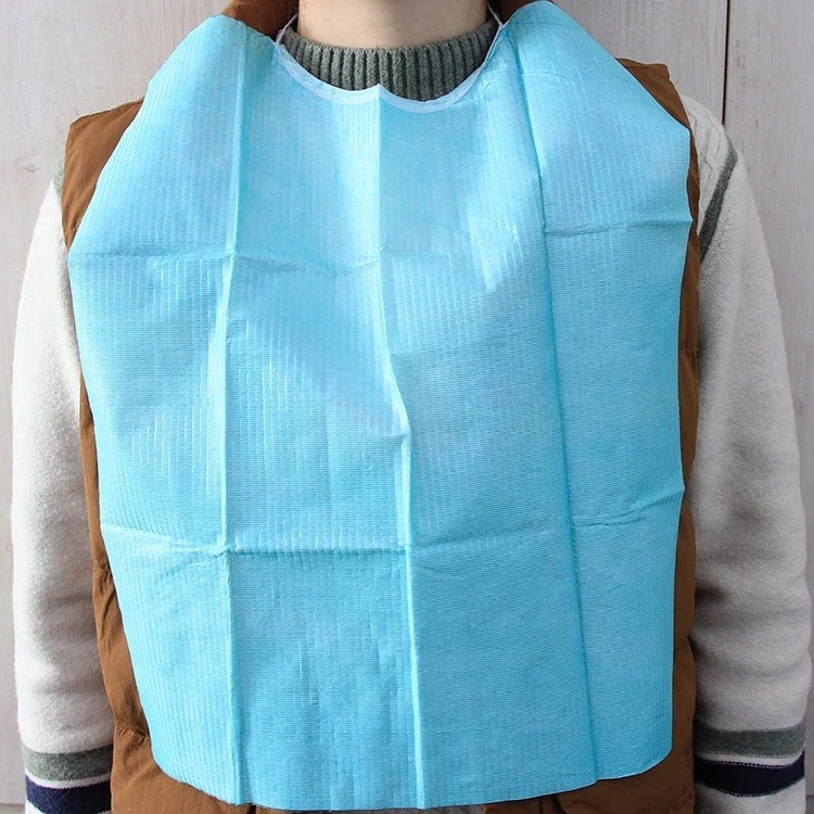 1.Disposable Bibs for Dental Clinics or Salons 2.Waterproof sheets keep fluids and spills off of the patient 3.Beautiful design with faint design on each bib 4.3 ply material designed to be more tear resistant 5.Each Bib has it's own laces to secure to patient Advantage: These Dental Bibs are large rectangles of thin waterproof material with a cutout for the neck and are held in place by inividual ties attached to each bib. Suitable for dental clinics and salons, each sheet is blue and has a faint print pattern on it. These bibs are aesthetically pleasing ano keep spills and fluids off of your patient during treatments such as cleaning, teeth whitening, and others. The material is 2 layers of tissue with 1 layer of plastic for waterproofing and designed to resist tears better than other thin dental bibs. Each bib has it's own individual tie as opposed to a reusable clip for convenience and hygiene. * Excellent waterproof with Belt and slight prints * Maximum protection with horizontal embossed pattern and a unique water repellent edge