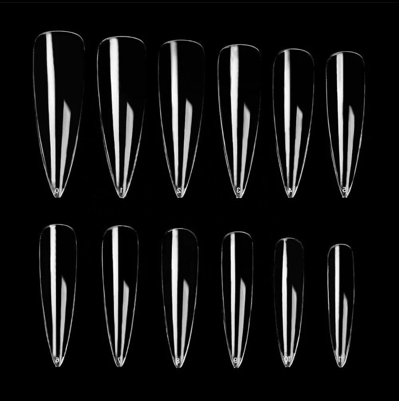 Quantity :240pcs/box Item Type :False Nail Type : Coffin Square Stiletto Nail Tips Color :Transparent Size:0-11 size, 12 sizes in total Suitable for use with gel, acrylic applications Can add nail art decorations on the nails