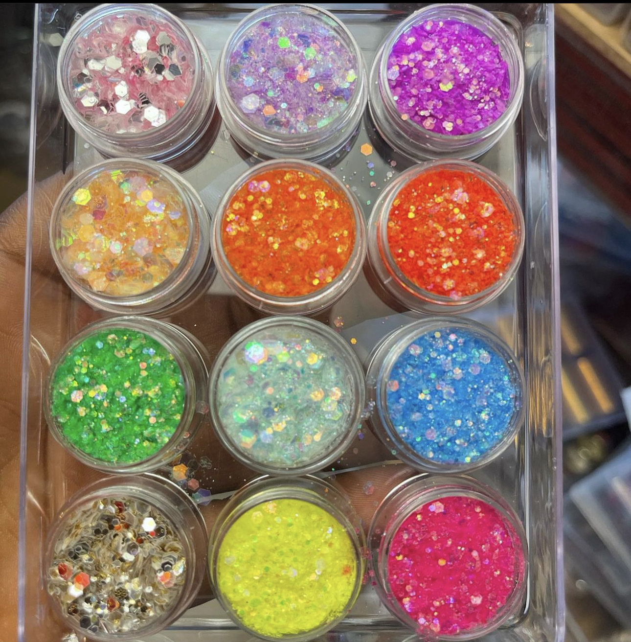 Designs: chunky glitters Color: Colorful Quantity: 12 jar/Box Package Contents: 12 jar of Nail Glitter How to use: 1. Prepare your nails with uv base coat and cure it under uv/led lamp. 2. Apply uv color gel (Do not cure). 3. Apply nail sequins onto your nails. 4. Cure it under uv/led lamp. 5. Seal it with uv top coat and cure it under uv/led lamp.