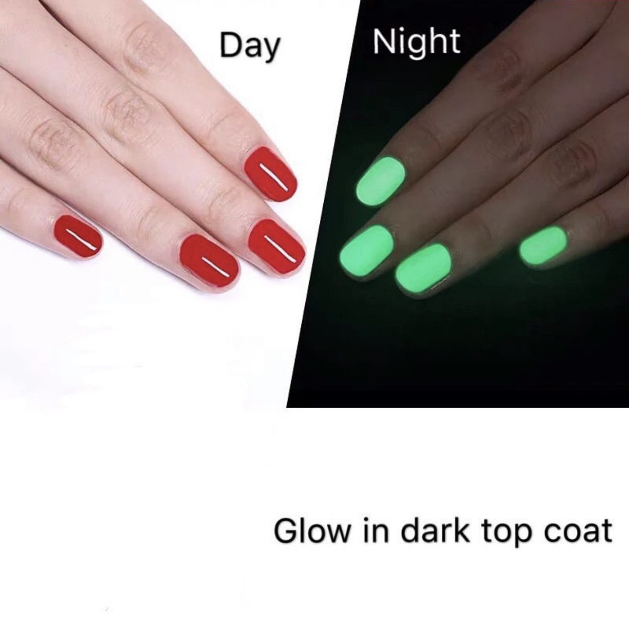 Product Description: Product Name: glow in dark top coat Product Type: Gel Polish Systems Content: 18ml Certificate: SGS/MSDS How to apply: 1. Prep nails, apply Primer, cure 2. Apply glow in the dark top coat, cure for 30s 3. Apply glow in dark top coat,for a thin layer, cure for 60s 4. Apply another layer of gel polish color, and cure for 60s 5. Apply glow in dark top coat No Wipe Top coat, cure for 60s. How to remove: Buff off the top coat, use cotton with acetone, wrap with foil for 10 minutes. Or use removal gel For two Minutes