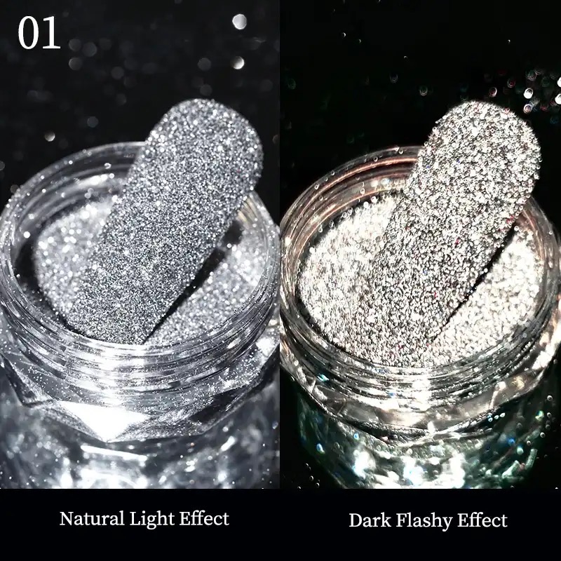 Material: Nail reflective Glitter Powder Package Includes: 12pcs jar in a Box Features: Can be used on natural or artificial nails. Easy to apply and shining your nail. Suitable to use on top of nail polish, UV gel, acrylic, etc. You can also use them to decorate vour home, cell phone' case, glasses, made card, etc. How to use: 1.Apply Base gel and cure. 2.Apply the color gel and cure. 3.Apply No Wipe Gel Top coat and cure it for 15-30 seconds. 4.Apply nail powder from top to bottom. 5.Apply reinforcement gel and cure. 6.Apply Top coat and cure. 7.Finished.
