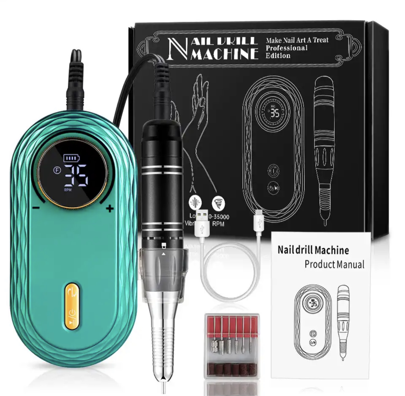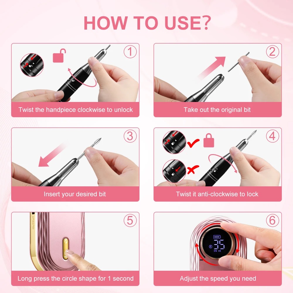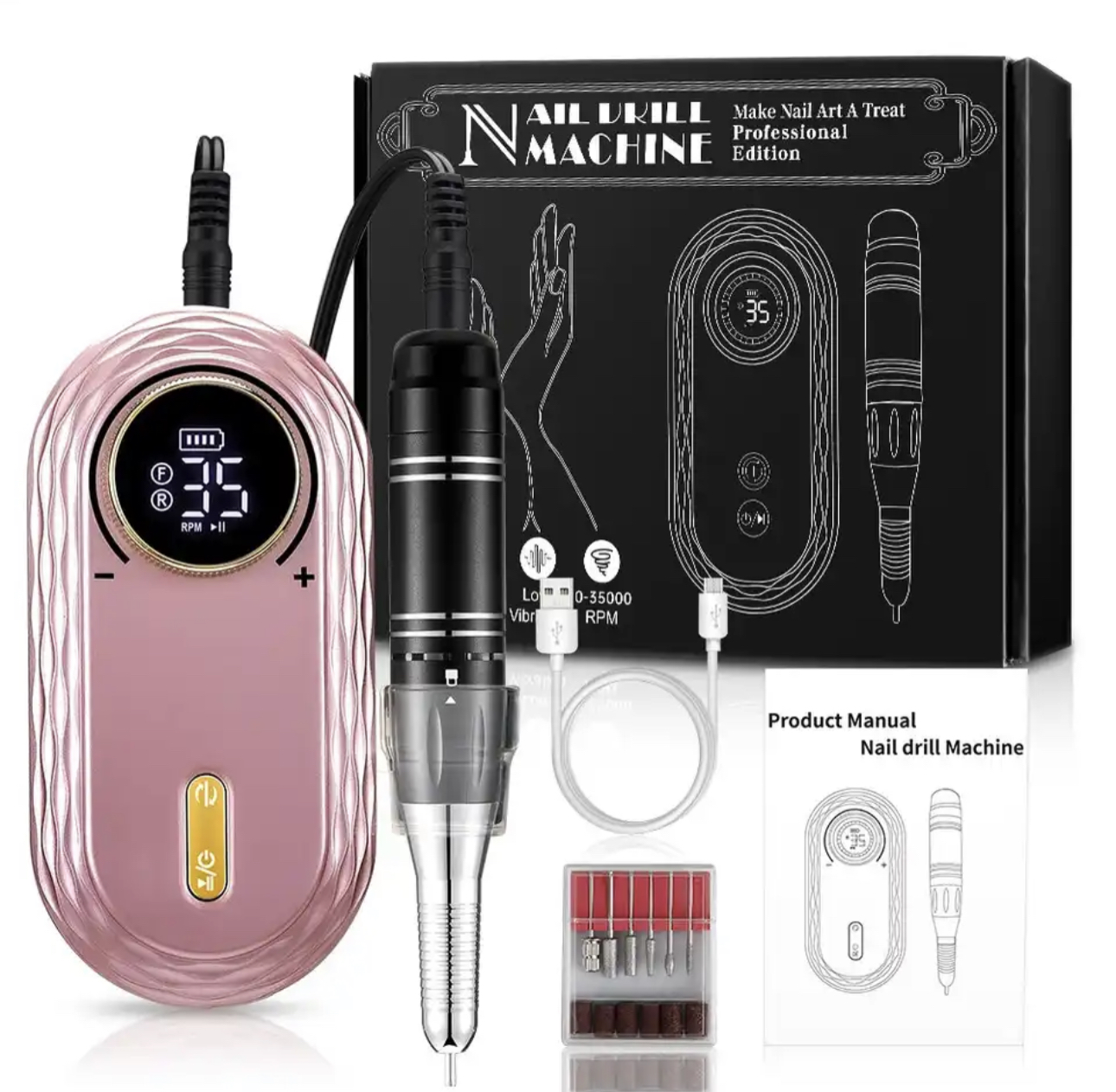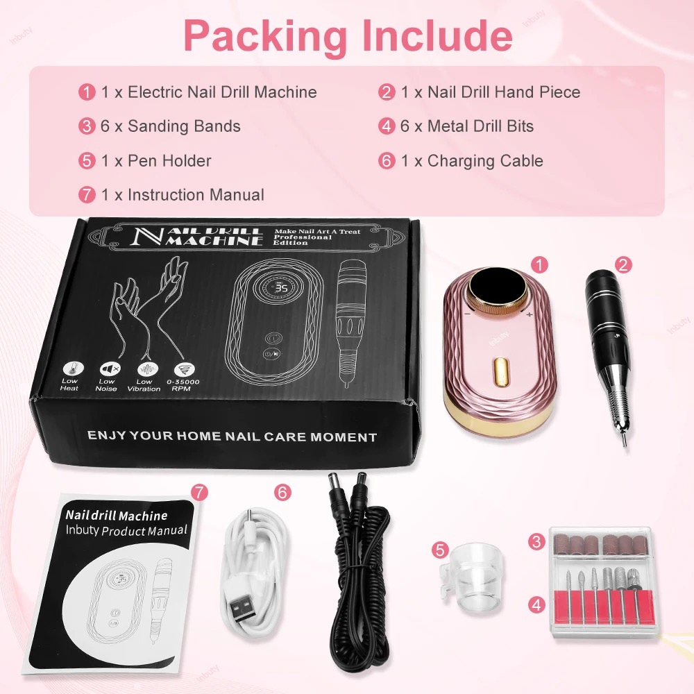 35000RPM Electric Nail Drill Machine File Portable Manicure Milling Cutter Set Gel Polishing Nail Drill Pen Salon Nail Equipment Description Features: 1. Stronger Motor with a Higher Speed : Professional acrylic nail drill in 35,000 RPM speed that offers more efficient nail filing and shaping and do your own nail art work like a pro. 2. Large Power Capacity for Longer Working Time: Built-in 2600mAh power capacity, full recharged 2 hours to work up to 10 hours straight working time. 3. Vibration-Free with Low Noise: Nail file machine creates about 50d sounds and almost 0 vibration. Smart heat dissipation prevents overheating. It can be used for manicure, pedicure, acrylic, gel, dead skin, callus and cuticle. 4. Easy to Use and Fully Functional: The manicure machine can be used as a Power Bank to charge your phone, and avoid the inconvenience of the phone power-off. Function super powerful, versatile and easy to work, even beginners can easily do manicure. Also ideal for both professional nail technicians and salon use. 5. Beautiful Design & Portable : Elegant design with advanced rose gold, smooth surface will provide comfortable grip for you. The palm sized handpiece allows you to take it everywhere you want. Plus the HD Smart LCD Screen to show the speed, direction and remaining power.
