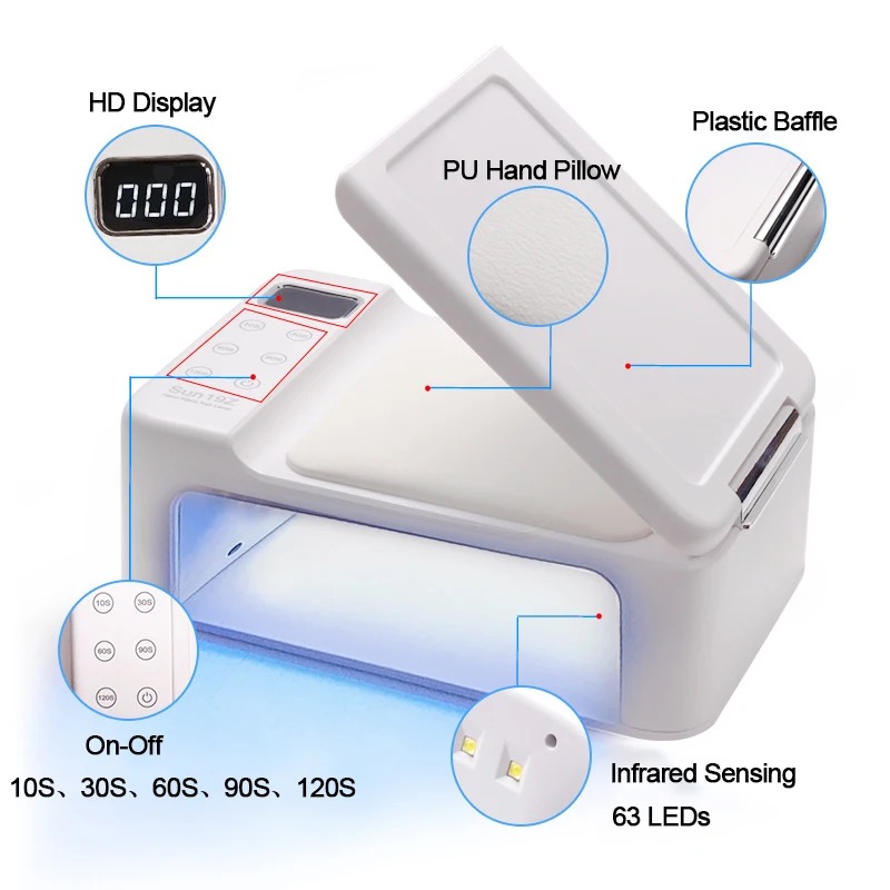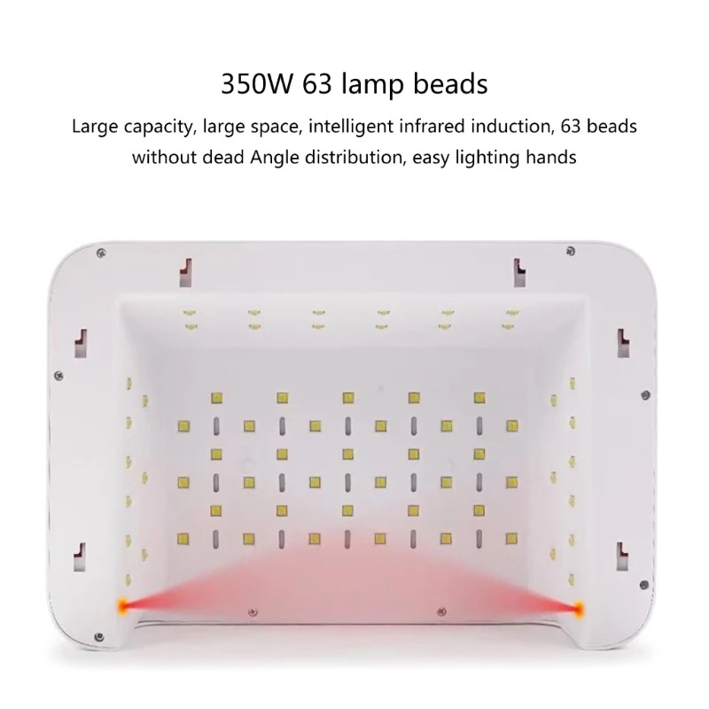 350W Nail Dryer Lamp For Machine With Hand Pillow Wear Nail Nail Lamp High-power Quick-drying Nail Polish Baking UV/LED Gel Lamp Specification: Material :ABS Color:white SUN 19Z, 63pcs Lamp Beads Fit Gel Type:UV Gel / Gel Polish/ Extension Gel Plug: EU, US Sensor : automatic infrared sensor Time :10/30/60/99s painless mode 4 Timer Design & Uses: 10S--for thin gel polish; 30S--for regular color; 60S--for dark color or thick gel polish; 90S--for painless low heat mode. 120S--for painless low heat mode . 1. Save Time for Curing Nail Gel: Our professional uv light for gel nails can shorten your curing time.Offer the great salon nail art experience at anytime and anywhere. 2.Comfotable and Different Curing Mode: Infrared smart sensor sensor can automatically turn on to work when you put the hand into our nail dryer machine; Meanwhile 4th gear timing function let you control the curing time with each layer. 50,000 hours life time, durable.Comfortable white light, no hurt eyes, no black hands. 3.Timer Design & Led Display: Convenient timing curing design with memory time function. Package includes: 1 * UV Led Nail Lamp 1* Power Adapter 1 * User Manual