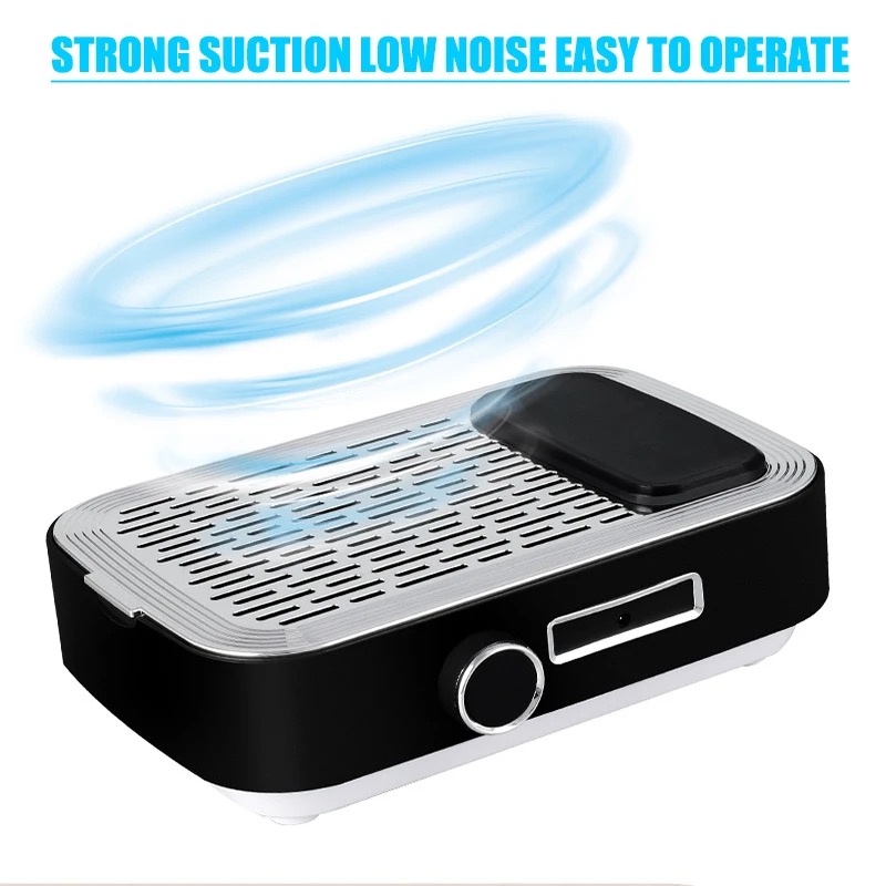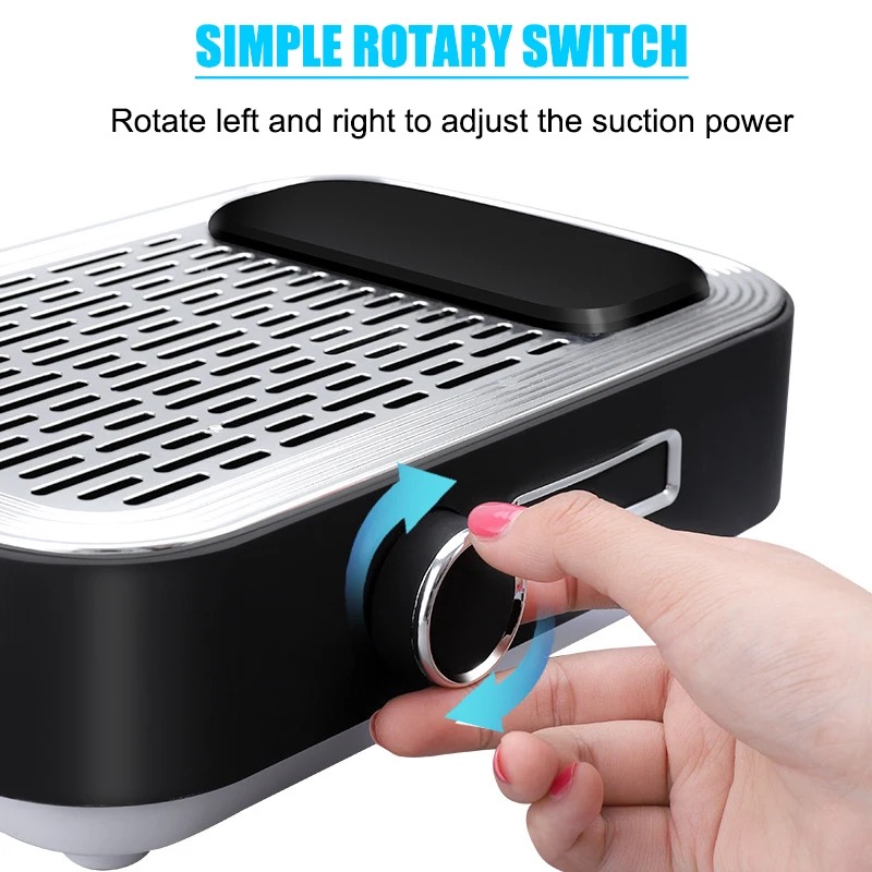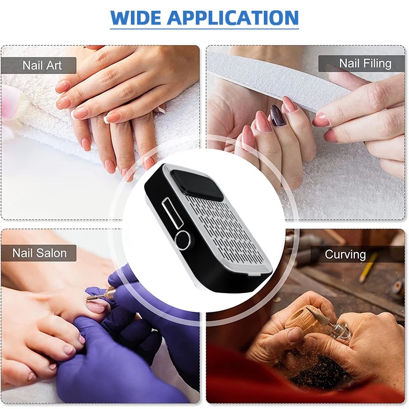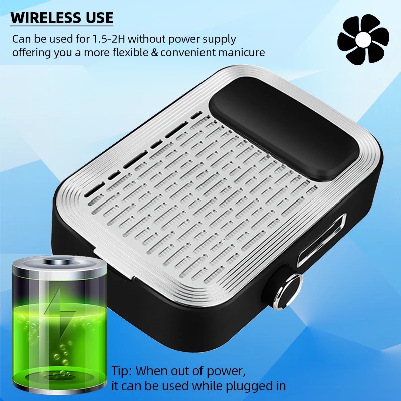 Product Description: * 80W High-power Nail Dust Collector - Are you still troubled by the dust flying when you polish your nails? 80w dust collector, perfectly solve your dust removal problem! The nail dusting machine is made of high-quality stainless steel and ABS resin, come with a powerful high-speed rotating motor, which can easily suck up dust and bring you a clean nail art making environment. Efficient Heat Dissipation & Low Noise - The bottom of the nail duster is designed with large exhaust holes for better heat dissipation. You can adjust the suction power according to your needs. Of course, the greater the suction power, the higher the power, and the noise will inevitably increase, but it will not affect your normal communication with customers, we hope vou can understand. * Comfortable Hand Pillow & Replaceable Filter - The dust collector for nails comes with a silicone hand pillow, which provides you with a comfortable manicure experience and relaxes your wrists. Comes with a replaceable filter, if you are using it personally, we recommend that you replace the filter every 4-6 months. In addition, the filter is not washable and can be cleaned by shaking it gently. If there is too much dust, you can use a hair dryer to blow off the excess dust. Versatile Use More Than Manicures - Our duster can be used not only for manicure polishing, but also to absorb dust in jewelry, small crafts, and woodworking. It is worth noting that if there is some dust left on the panel, you can clean it up by simply swiping the surface with any small brush. [Warm Tips - Our nail vacuum cleaner can be used with an adapter or without a power supply. the green light is on to indicate that it is fully charged (about 1.5hours of continuous use). The charging design is more convenient to carry, suitable for grinding fingernails and toenails. (Input voltage 110 v)