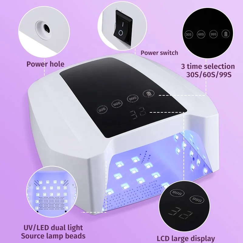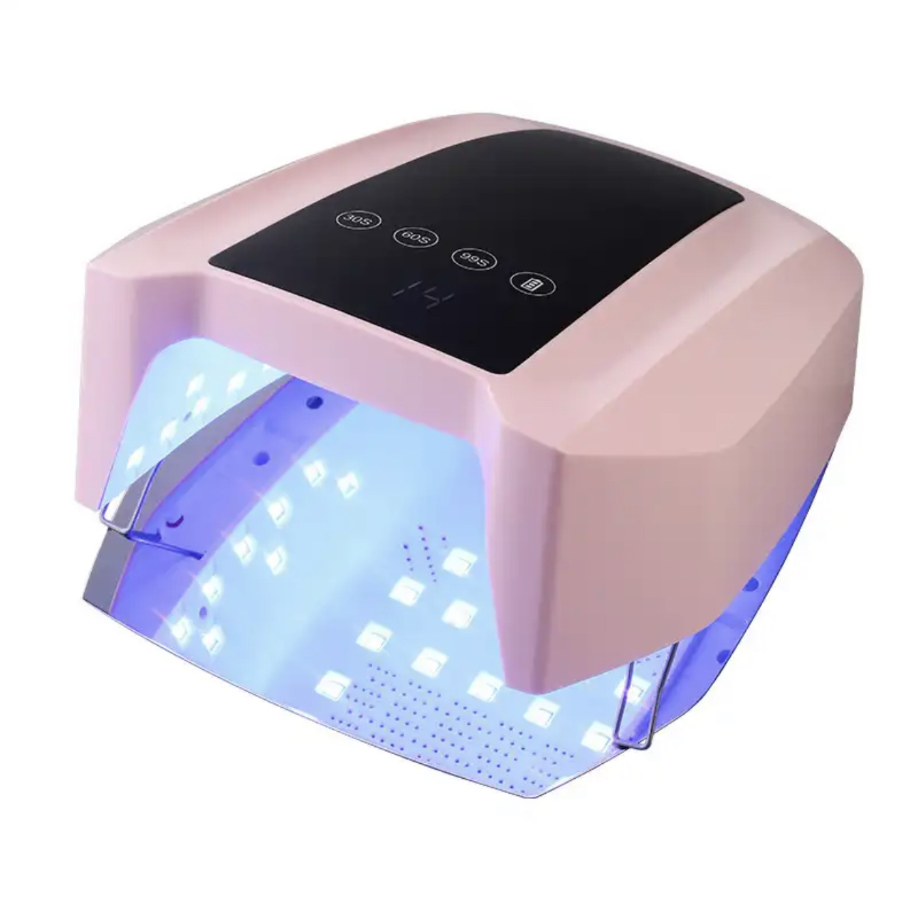 72w UV Gel Nail Lamp LED Purple Light Dryer Nail Light Therapy Machine Intelligent Sensor Wireless Charging Fast Drying Light Product Description 1. Quick drying lamp: gel nail UV lamp is professionally designed with UV and LED dual light sources, and 36 72W lamp beads illuminate your gel nails in all directions. Fast drying. 2. Intelligent sensor, nail gel nail lamp can automatically detect, light on when reaching out, and turn off automaticall when leaving 3. It has three timer settings: mode 30s/60s/timing, which is suitable for different types of gel glaze and requires different drying times. 4.15600mAh large capacity battery, can be used for 10-12 hours 5. Equipped with a folding tripod, not only fingernails, but also toenails can be baked Product Specifications Color: Pink Material: ABS Weight: 1.3 kg Battery capacity: 15600mAh Usage time: 10-12 hours Power: 72W Feature1 Nail Drying Lamp Feature2 LED baking lamp Feature3 High Capacity Phototherapy Lamp Feature4 Smart Switch