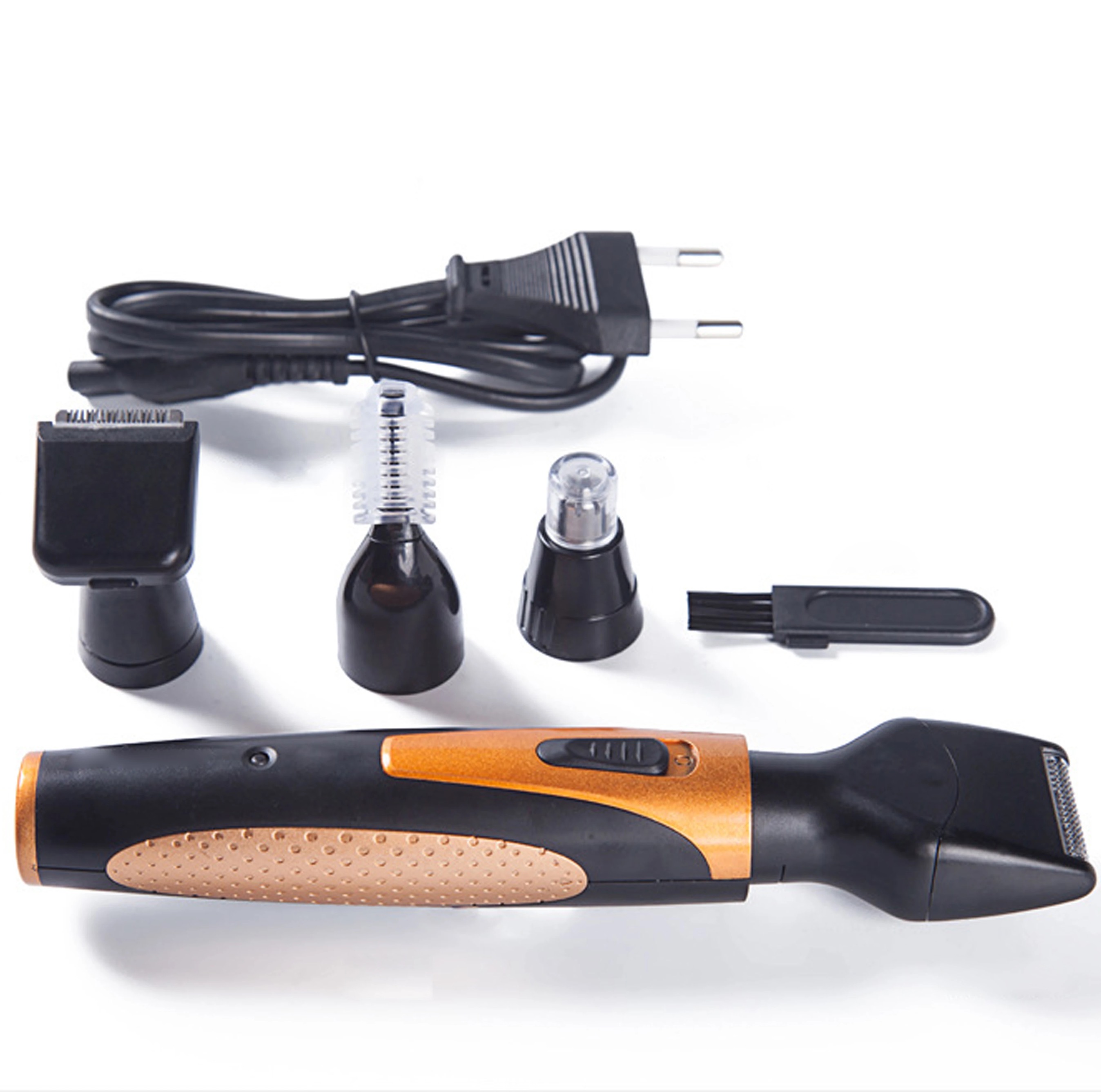 4 In 1 Rechargeable Men Trimmer for Nose Hair, Ear Trimmer, Beard Trimmers, Eyebrow Trimmer. Description: 1. 4 In 1 Grooming Kit: This rechargeable nose hair trimmer has four interchangeable heads ideal for trimming nose and ear hair, eyebrows, sideburns, beard and moustache. 2. Powerful Personal Groomer: Powerful 6500 revolutions/ min,The stainless-steel circular- blade system guarantees accurate removal of ear hair, nose hair, beard and eyebrows without pulling and tugging. 360° Rotary cutting system of nose hair trimmer provides vou a smooth and effective cut. The noise is below 50 B. 3. Rechargeable: 5-8 hour full charging time allow this trimmer Continued use for 3 hours, There is built-in rechargeable battery in the device. Don't need to buy extra battery. 4. Portable Design: Super tiny size allows you to take it for travel, business trip, camping or others as ideal personal care trimmer, take it with you to everywhere. 5. Easy To Clean: IPX4 waterproof and washable cutting head. This nose hair trimmer heads are water resistant, Please simply rinse the blades after each use for long-lasting performance. A cleaning brush is included to clean away stubborn hair particles easily. Specifications: Type:Nose Hair Trimmer set Gender:Men Color:Gold/Blue Charging time:5-8 hours Washing level:IPX4, the cutter head can be washed Voltage:USB (DC 5V) Power:3W Battery type:Built-in nickel metal hydride battery (400 mAh) Wire length:1 meter Package size:22.5*13.5*3.3cm/8.86*5.31*1.3" Package Included: 1 x nose hair host 1 x razor head 1 x eyebrow trimming head 1 x temple head 1 x USB charging cable 1 x cleaning brush 1 x manual