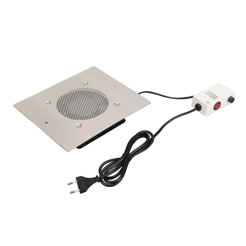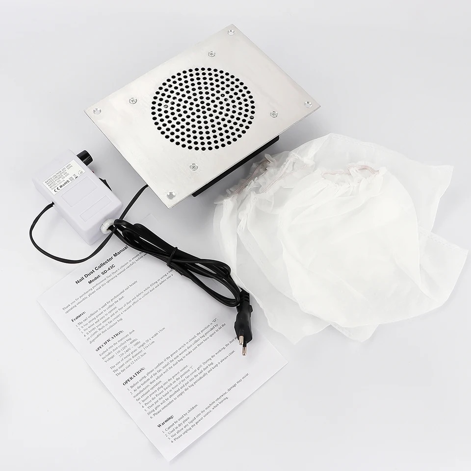 (Package does not included mounting screws, desk, chairs) Specification Item Type:Desk Nail Dust Collector Color:White Material:ABS Plug:EU/US/AU/UK Power:6W Fan Speed:4500RPM.MAX Voltage:110V/220V Weight:445g Size:15*20*5cm/5.91*7.87*1.97in Product Include 1*Main Machine 3*Dust Bags 1*Manual 1*Box Feature This built-in nail suction collector needs to be installed on a table. Professional Nail Art Tool for Nail Technician. Feel comfortable to use, and easy to operate. No noise and easy to use. Strong power, high speed, low noise and very good suction effect. Strong fan to collect dust created while filing or polishing nails. Includes 2 pcs of dust bags which can be changed and washed. Suitable for grinding nails and foot, make your hands and foot fell comfortable. Note Can not used by children Used in dry place Not allow any liquid in to the machine otherwise, damage may occur Please unplug the power source, when leaving Tips Please peel off the blue protection film before use. Do not include mounting screws