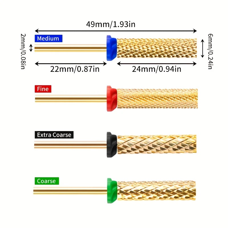 professional manicure pedicure sanding bit Shape: Super Long Barrel Grits: extra coarse, coarse, medium, fine head size: 24.2mm*5.7mm Application: remove nail gel, foot dead skin, callus, cuticle etc It can be installed in most electric nail drill machines or pedicure machines Package includes: 1 x nail drill bit