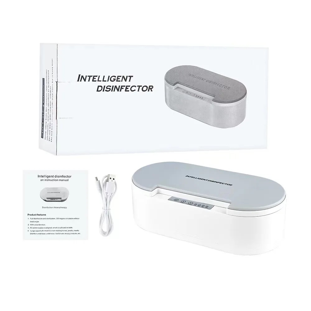 Specification Item type: Intelligent disinfection Material: ABS Input voltage: DC 5V Input current: 2A Disinfection power: 2W Maximum power: 9W Maximum Capacity: 6.5in mobile phone Battery capacity: 1500mAh Charging time: 2.5 hours Product Include: 1* Disinfection 1* USB cable 1* Manual 1* Box Feature: 1.360 ° all-round sterilization.Ultraviolet ray sterilizes, quickly destroys the molecular structure of bacteria, disinfect personal clothes before wearing, comfortable and healthy. 2.Aroma tank design. In the groove drops into the aromatherapy, disinfection at the same time you can make the items increase the charming fragrance. 3.Efficient sterilization rate. Built-in high-powered UV - C LED generates 260-280m UV light, directly destroy bacterial DNA and RNA, no chemical residues. 4.Only 5 minutes, complete a comprehensive disinfection. Sterilization is complete, voice broadcast reminders, automatic stop, saving you time, the sterilization rate can reach more than 99%. 5. Disinfection hundred treasure box. Disinfect the required items: cell phones, masks, jewelry, toothbrushes, beauty products, mother and baby products and intimate clothing. 6.Super large capacity. USB 5V charging form, at the same time built-in 1500mAh large capacity battery. It takes 2.5 hours to charge and can be used more than 50 times. It is recommended to fully charge for the first use. Operation: 1. Long press the power button. 2. Select the disinfection key or aromatherapy key. 3. After 5 minutes, the machine will remind: disinfection or aromatherapy has been completed. Notes 1. Close the lid before turning on the machine, do not let the UV radiation directly to the human body 2. Keep away from children 3. Keep away from fire and corrosive chemicals, pay attention to waterproof 4. Do not look directly at it with your eyes for a long time
