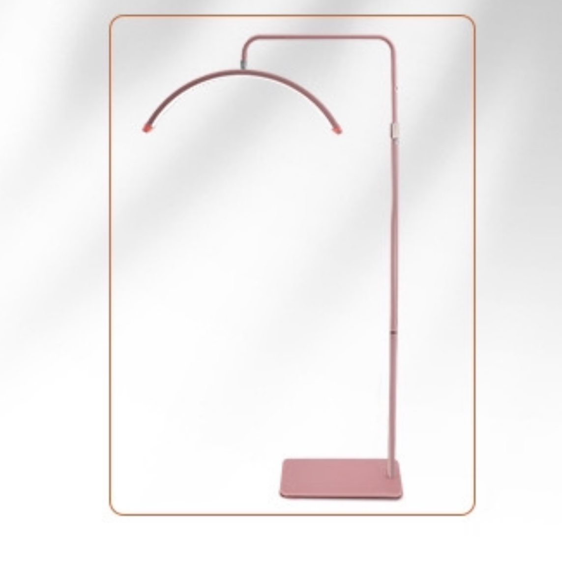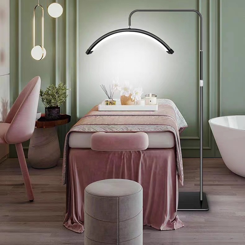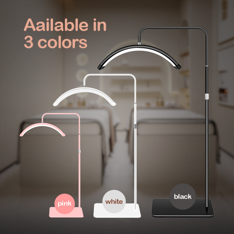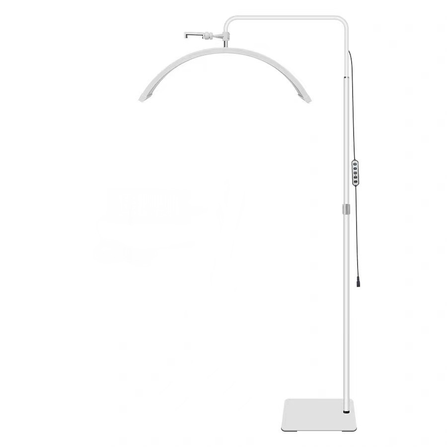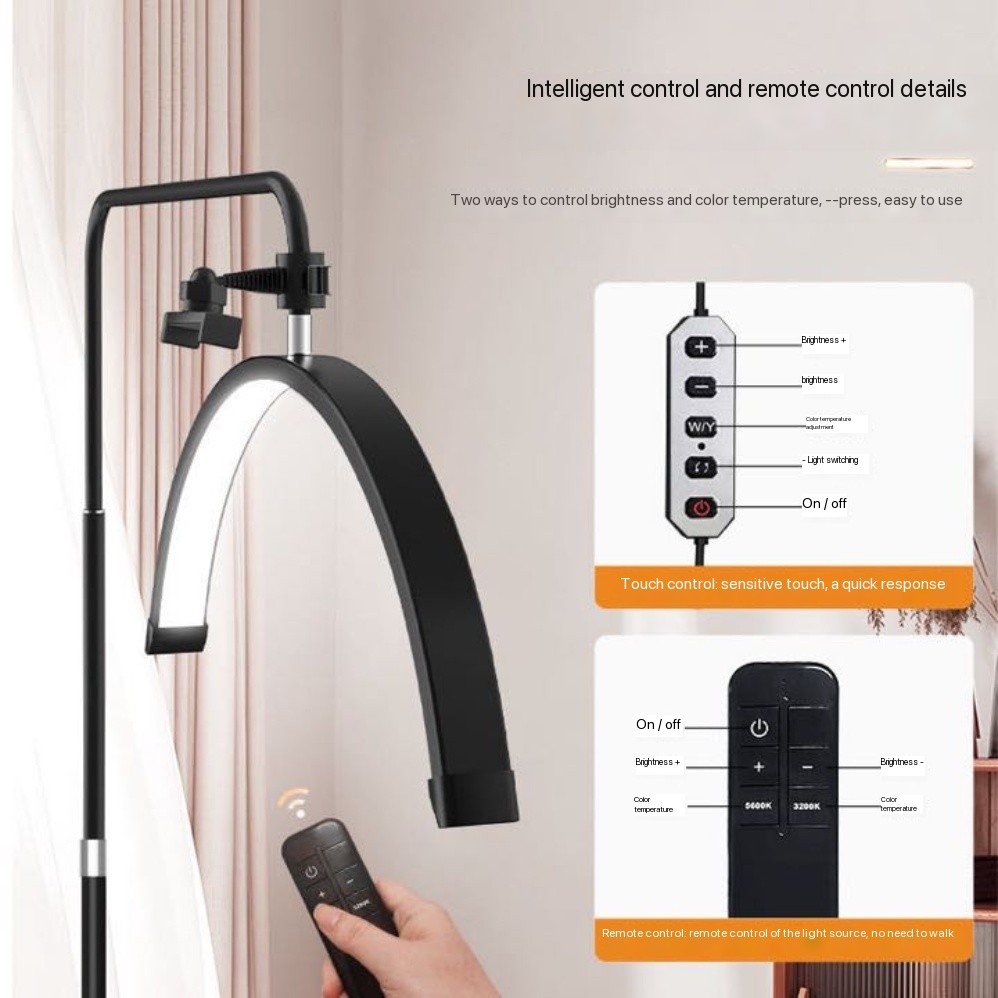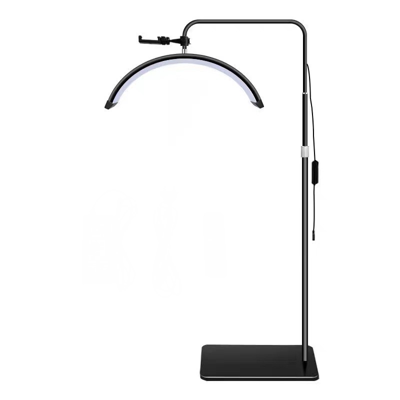 [Half-moon Floor Fill Light) Special half-moon shape design, with 238pcs high-quality lamp beads, 36W high power and 90+ high color rendering, suitable for desktop vlog, beauty salon live streaming, beauty project, etc. [Bi-Color Temperature & Dimmable 3200K-5600K adjustable color temperature allows you to have warm light or cold light easily, and 10 levels of adjustable brightness can meet your needs of light in different usage conditions. [Flexible Rotation Design The lamp body can be 360° rotated freely, you can adjust the lighting angle easily, no any block to your video recording, very flexible to use. [Adjustable Floor Light Stand] The metal light stand with 125cm-180cm/ 49.2in-70.8in adjustable height enables you to place the fill light on floor for stable and convenient usage. [With Phone Holder and Remote Control) With an adjustable phone holder that is compatible with most smartphones on the market, you can install your phone to the light easily for video recording. With a remote control for flexible operation.