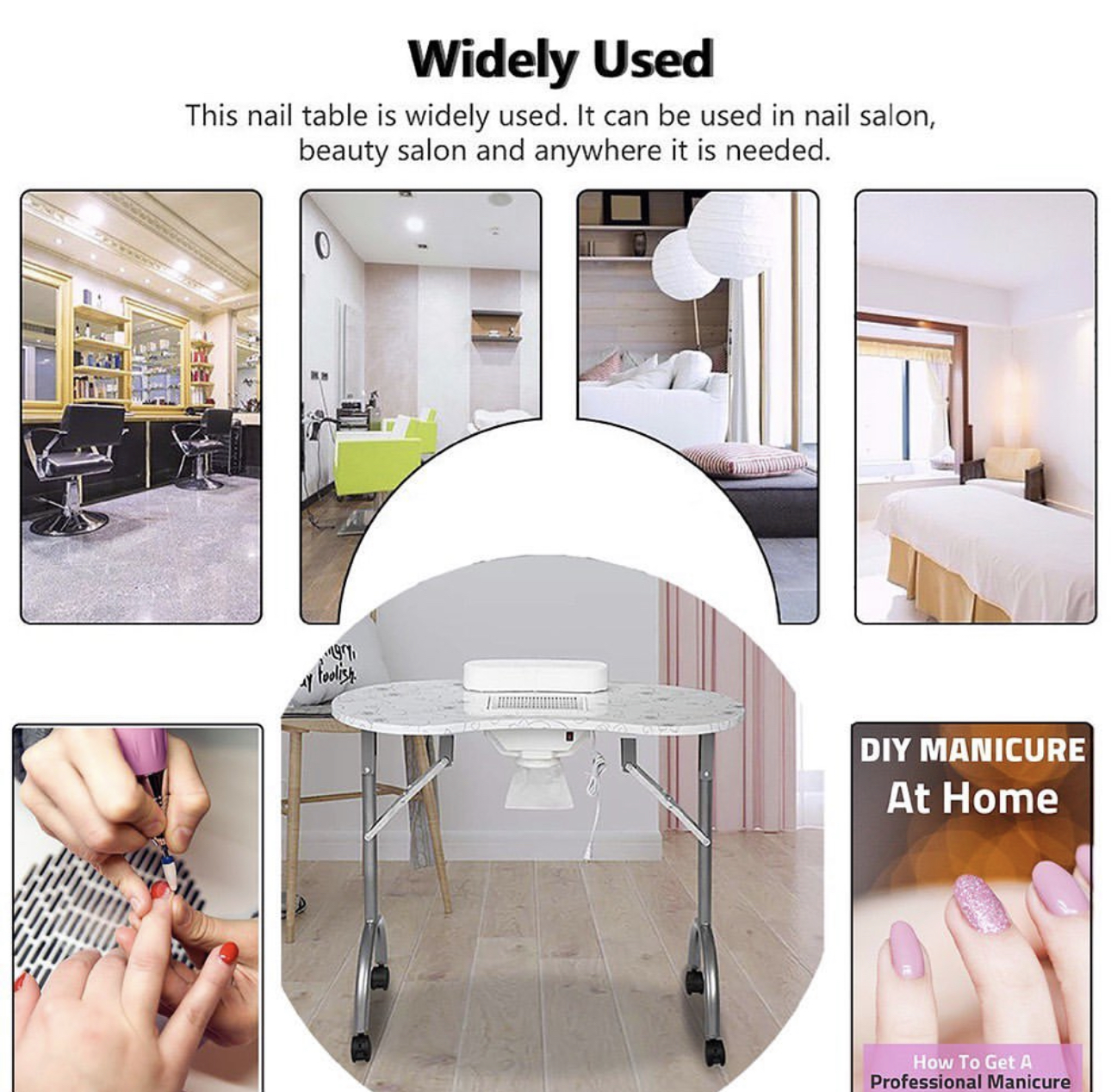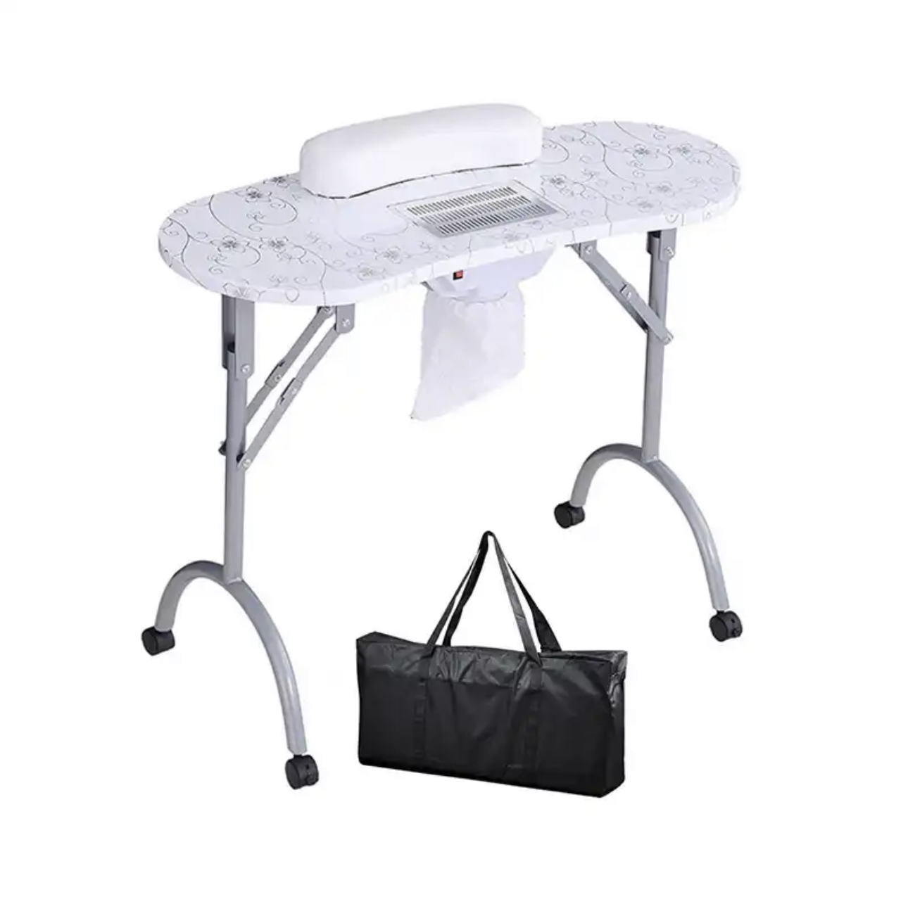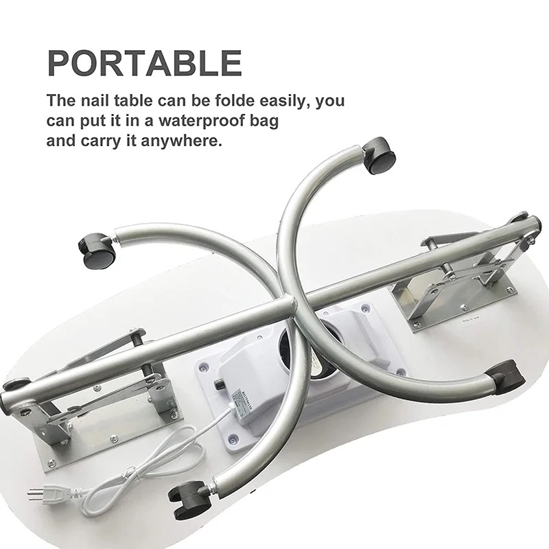 Portable Manicure Table Spa Beauty Salon Equipment Desk with Dust Collector, Cushion & Fan Portable Folding Station Desk Spa Beauty Salon With Rolling Wheels Fan Carry bag, SPECIAL MANICURE TABLE FOR YOU! Portable Manicure table with fan 4500 pm, foldable, and portable with useful carry bag. Made with the best materials. It will be possible to close every time you want to recovering useful space. At the center of the table is placed a comfortable pillow. The wheels are swivel 360° with locking system. The vacuum cleaner inserted in the center of the table is provided with a safety grid, are included in the price also three useful bags to collect dust. In the end, making it even more elegant, this splendid table we lacquered gray pearl legs. CONTENT PACK: Manicure Table with fan and european plug - pillow - removible alluminium grill - 3 bags collect dust - Carry Bag TECHNICAL FEATURES: Dimensions: 90 × 40 × 72 cm. Closed dimensions: 98 × 46 × 23cm. Suction power 4500 pm Electric consumption: only 17 w Nois level 55dB Weight: 13 Kg.