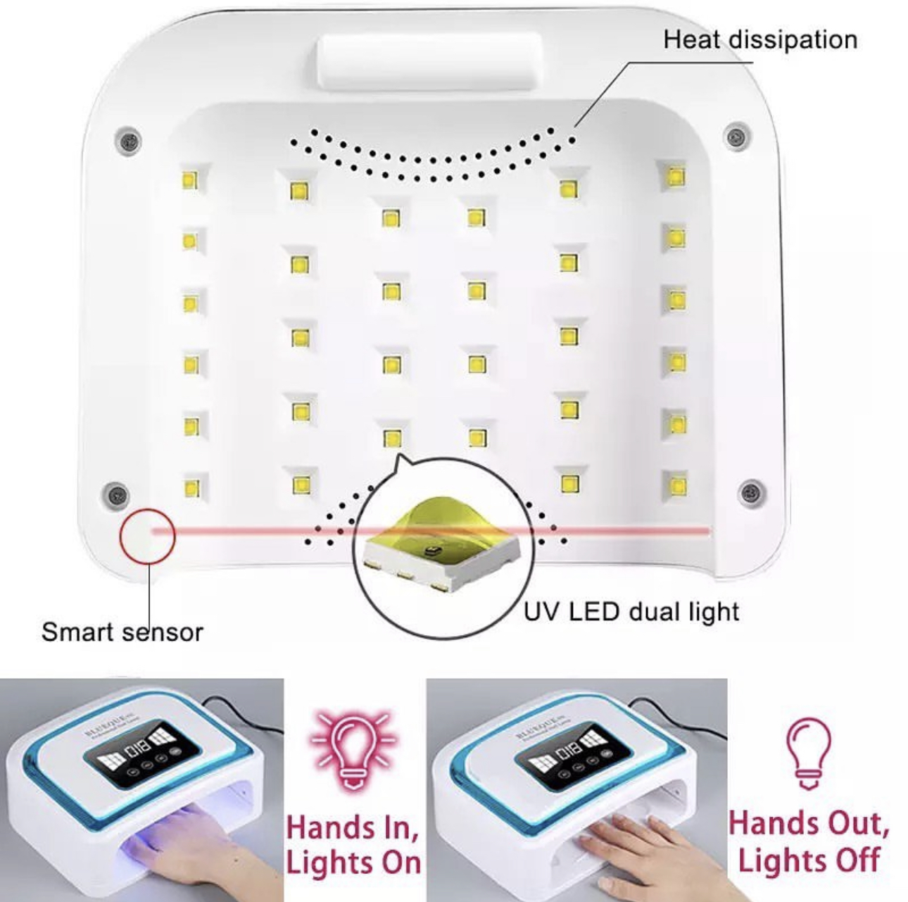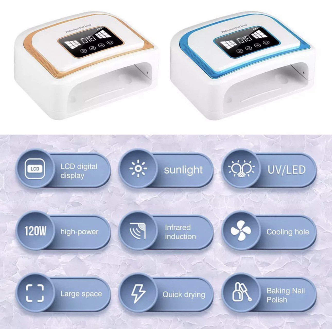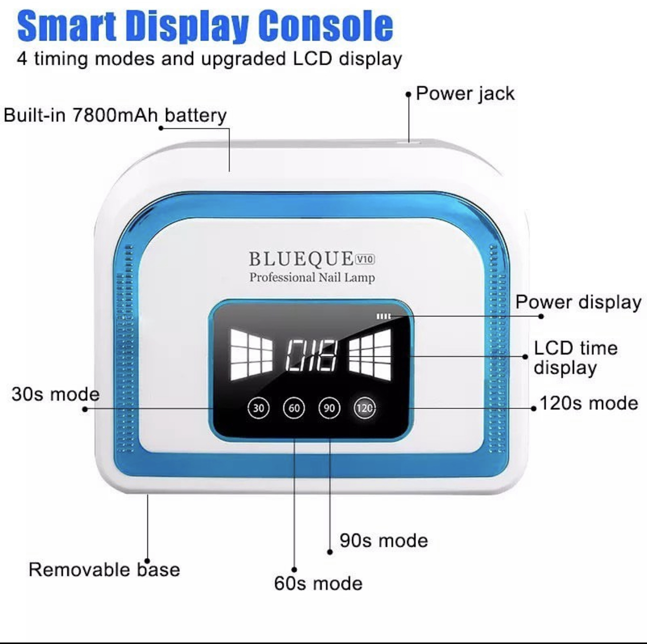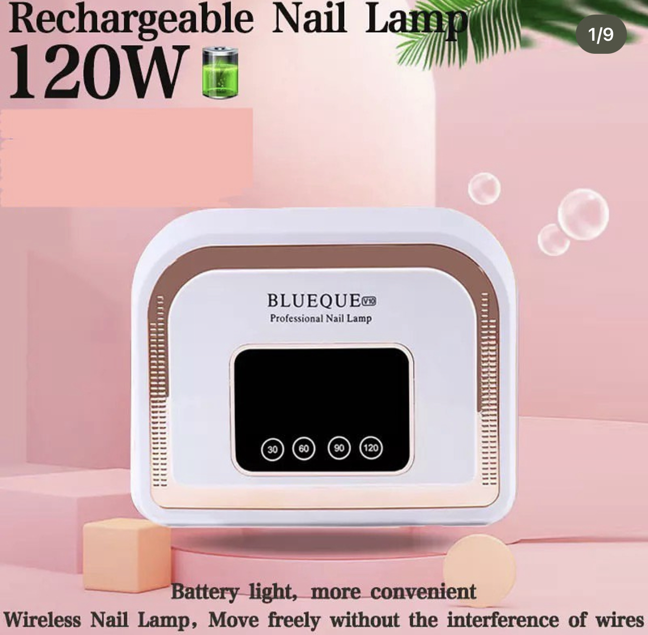 Specification Brand:BLUEQUE Material: ABS plastic Battery capacity: 7800MAH Voltage: 110-240V 50-60HZ Power: 120W Color: Gold , blue Lamp beads: 30pcs UV/LED dual light source Charging time: 2 hours Button: smart sensitive Product size: 22.5*18.2*8CM/8.85*7.16*3.14in 【Portable Nail Dryer】: This 120W wireless nail lamp built-in rechargeable lithium battery 7800mAH battery, 6-7 hours continues working time after2 hours full charging (can be used while charging). You can take it anywhere you want. 【White Light】White light does not darken the hands and softly protects the skin 【Rechargeable Cordless Design】: Rechargeable gel nail LED UV light,equipped with new professional designed UV+LED dual light source.Curing more faster, with smart automatic infrared sensor & time touch button control, LCD display screen for service time left and power state showing. 【 3 Timer Settings】: Normal 30s/60s/90s timer settings for better cure the gel polish according to your DIY needs and gel polish's requirements. 【Easy & Rapid & More Space】Designed for hands and toenails, manicures and pedicures, Achieve salon results in seconds for both home and professional use. 【Long Usage Life & safety】: 30 durable LED light beads,with a life span of 50000 hours nonstop, lasting up to 5 years of continuous use. No need to worry about the replacement of the light beads.