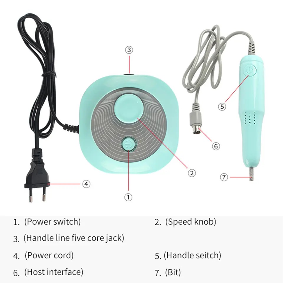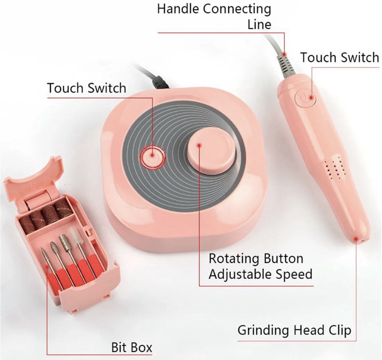 Product Description: Smart Electric nail drill Machine Adjustable speed Nail Grinding Manicure Polish Nail File Pedicure Drill Set Nail Drill Equipm Description: Description: 100% brand new and high quality Smart Electric Nail Drill Machine Main Features 1.Smat igh-tech design; one button to control start and stop 2. Alternate light colors indicate FWD/REV spinning direction 3. The bits box is designed to be inlayed in the machine to store the ece to hold the 4. Imported motor adapted to ensure that the drill is efficient and quiet. Specification Voltage: 110V Power: 24W Collect: 2.35mm (3/32‘’) Rated Speed: Up to 25000RPM Operation Steps: 1. Press the power switch on the machine for 3 seconds to turn on. 2. Press the handpiece switch to start the handpiece direction for the dril bit FW2 ne machineto select the spinning 4. The alternate gnt colors on he fast always shs that heRoeS achine indicate the FWD/REV not working. When the alt means that the machine is working Blue indicates FWD, and Re indicates REV: the default color is Blue 5. Spin the speed control knob on the machine to adjust the speed The direction light will go off to indicate that th seconds to turn off 6. Press the power switch on the machine Specifications: 1.Smat igh-tech design; one button to control start and stop 2. Alternate light colors indicate FWD/REV spinning direction 3. The bits box is designed to be inlayed in the machine to store the ece to hold the 4. Imported motor adapted to ensure that the drill is efficient and quiet. Package Included: 1*Adjustable speed host 4*Grinding head 1*Handle 1*English manual Notes: 1. Don't change the turning directions to frequently, otherwise it will damage the grinding head 2. While the grinding head is in operation, never pull out the 5. 5plug of the portable grinding head 3. For long idle time please disconnect the source power 4.Children should be spervised to ensure theat they do not play with Specifications: 1.Smat igh-tech design; one button to control start and stop 2. Alternate light colors indicate FWD/REV spinning direction 3. The bits box is designed to be inlayed in the machine to store the ece to hold the 4. Imported motor adapted to ensure that the drill is efficient and quiet. Package Included: 1*Adjustable speed host 4*Grinding head 1*Handle 1*English manual