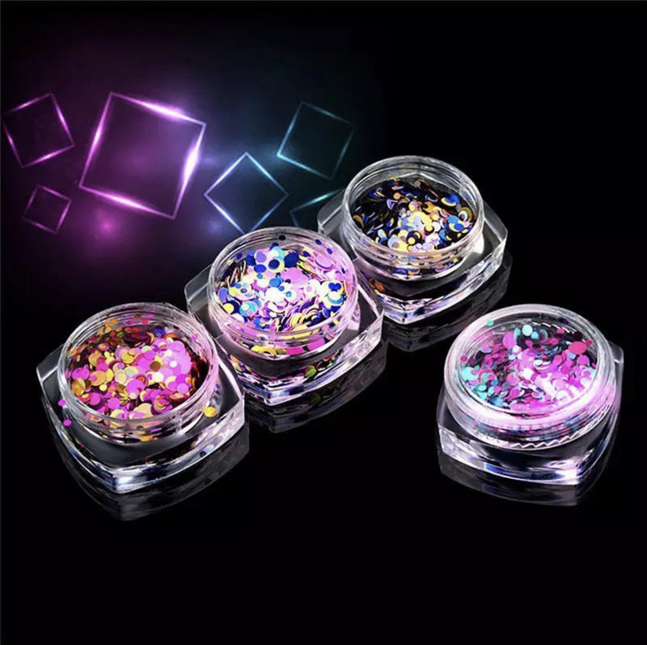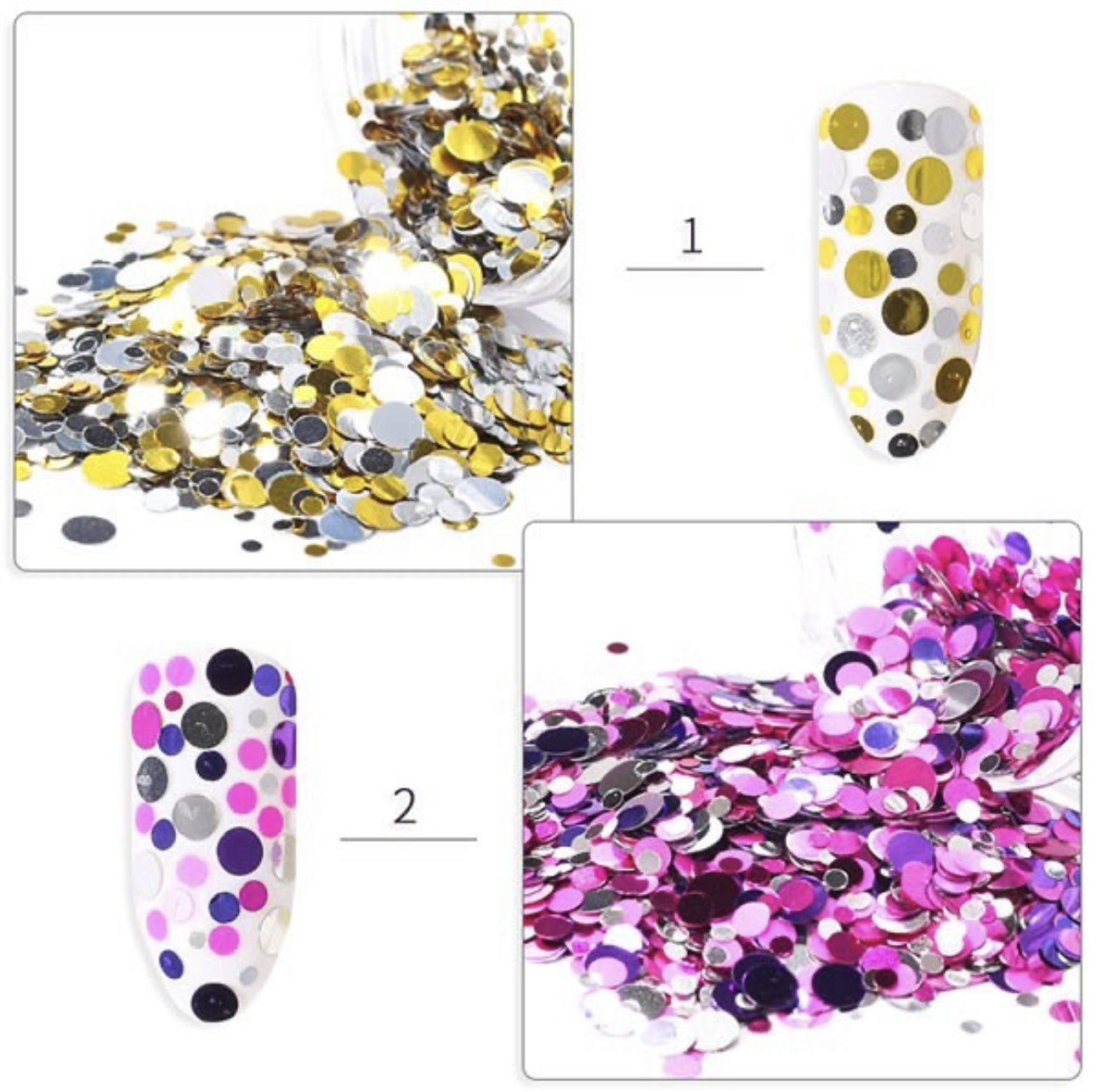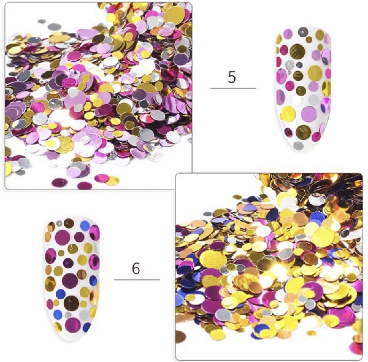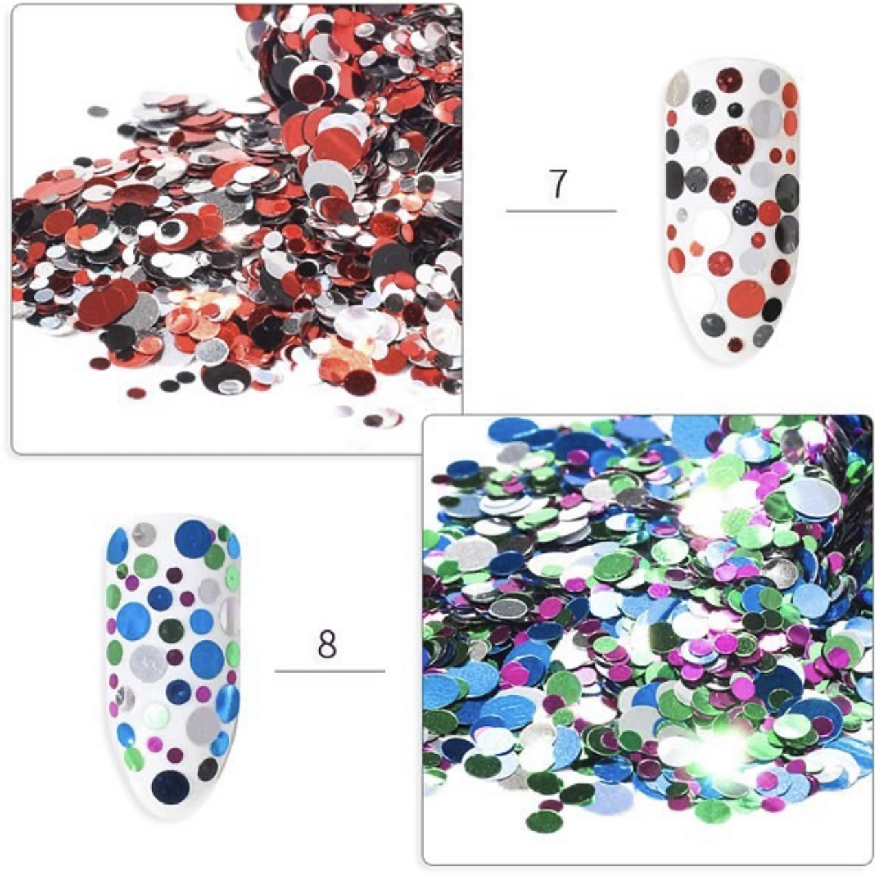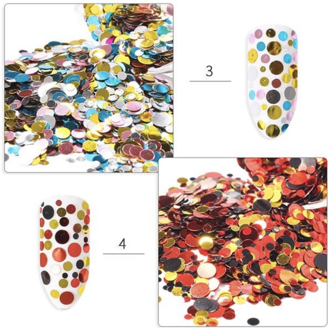 Designs: round Glitters Color: Colorful Quantity: 12 Jar/Box Package Contents: 12 Jar Of Nail Glitter How To Use: 1. Prepare Your Nails With Uv Base Coat And Cure It Under Uv/Led Lamp. 2. Apply Uv Color Gel (Do Not Cure). 3. Apply Nail Sequins Onto Your Nails. 4. Cure It Under Uv/Led Lamp. 5. Seal It With Uv Top Coat And Cure It Under Uv/Led Lamp.
