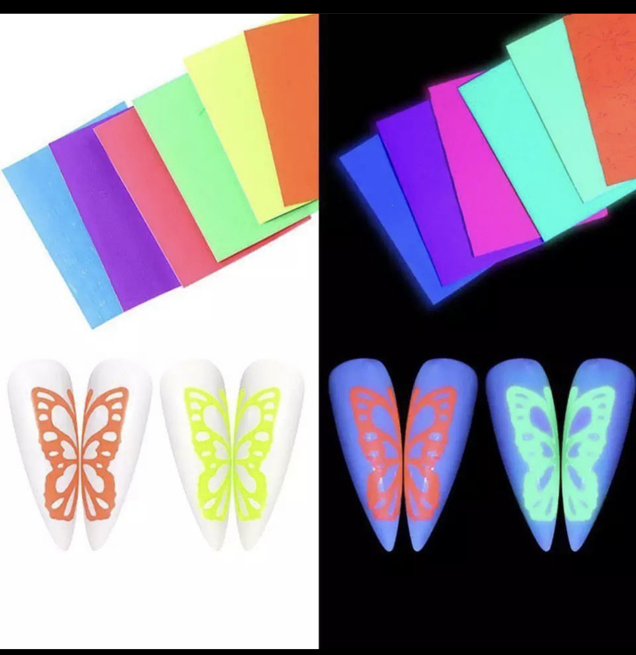 • Product features: Removable, waterproof, mildew proof, Environmentally friendly. • Applicable occasions: can be pasted on any smooth,well filed and polished nail. •Use strong light such as sunlight or a flashlight to directly illuminate the sticker for more than 15 minutes, and the sticker will flicker for 4-6 hours in the dark. • Under normal circumstances the sticker can absorb enough natural light during the day and then shine at night. • DIY Decoration Set Our neon Butterfly sticker set is perfect for decorating your nails. • The neon butterfly stickers allow you to place in a realistic dream world, adding a dreamy and romantic atmosphere to your nails.