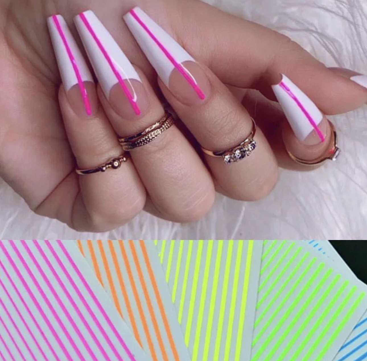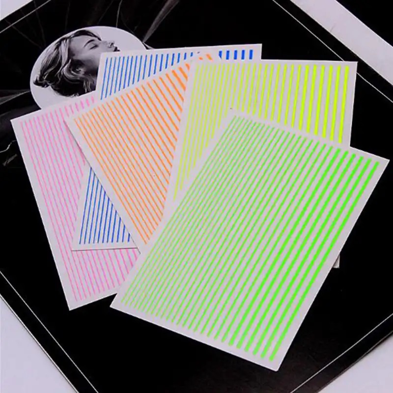 Quantity: 1 Sheet Pattern: Stright Stripe Line Size: Approx. 10cm * 8cm Feature: 100% brand new and high quality. Suitable to use on top of nail polish, UV gel polish, acrylic, etc. Easy to apply on natural or artificial nails. Suitable for home use or professional use. How to use: 1. Applying a base coat and wait it dry completely. 2. Select a base color that you like and apply it onto your nails. 3. Select a design and peel off by your nail. (Don't touch the glue) 4. Use tweezers to gently remove the prepared sticker place it onto your nail and press it. 5. Apply top coat for a perfect effect.