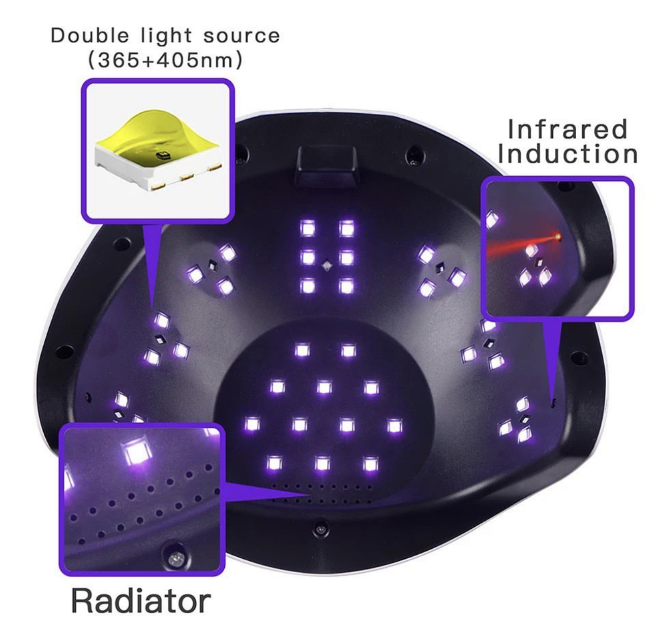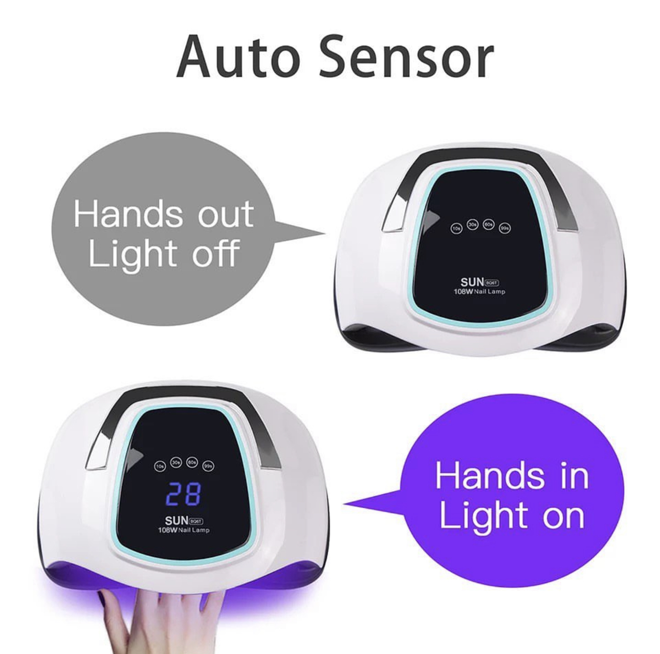 • 36 LEDs for fast drying :With 36 LEDs, this nail dryer quickly and efficiently dries gel polish, saving you time and effort. • UV light for professional results :The UV light feature ensures that your nails dry evenly and thoroughly, giving you professional-looking results every time. • CE certification for safety :This nail dryer is certified by CE, ensuring that it meets safety standards and is safe to use. Specifications: Product Name: Nail Lamp Power: 108W Plug:EU PLUG/US PLUG Material quality:ABS Baking Type: Phototherapy Glue, Nail Polish, Extension Glue, Etc. Weight: 715g Size: 22.5x19.5x10.2mm Features: 1. Nail Dryer, 108W high-power, fast drying 2. Fast Drying UV Glue/Extended Glue/LED Glue 3. Light Therapy Machines Wont Make Your Hands Dark Or harm to the eyes, 4. Not Only For Nails, But Also For Toes 5. Infrared sensing settings,30S 60S 90S 120S four speed modeSuitable For Home And Professional Use Package Included:1 * nail lamp, 1 * EU/US power adapter, 1 * instruction manual, How to use UV Nail Lamp? 1.Fully charge the nail lamp first. 2.Apply a thin coat of gel polishes to clean, dry nails 3.Use the appropriate timer (30s/60s/90s/120s low heat mode) depending on the requirements of your gel polish. (The UV nail lamp works automatically when you place your hand in the nail lamp. If you have selected a timer, the nail lamp will automatically stop working when the timer ends) 4.Curing time varies depending on gel polish brand. For best results, avoid moving your hands too much until the curing is complete. 5.Choose the curing time according to the thickness of the glue. If the glue is applied thicker, the time will be longer