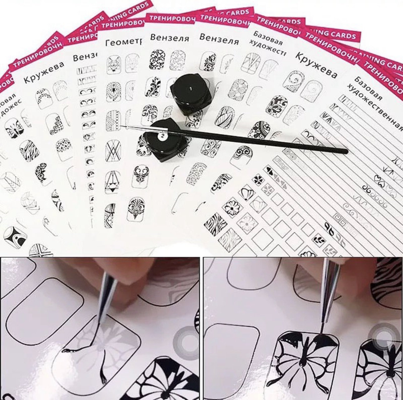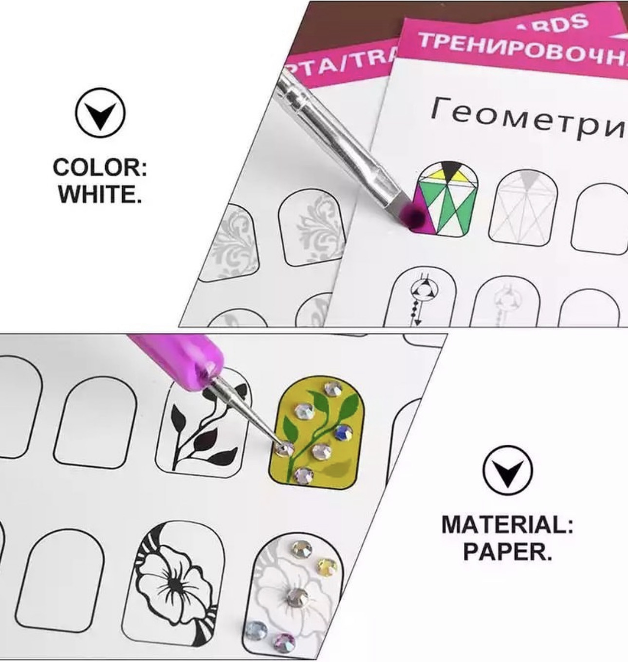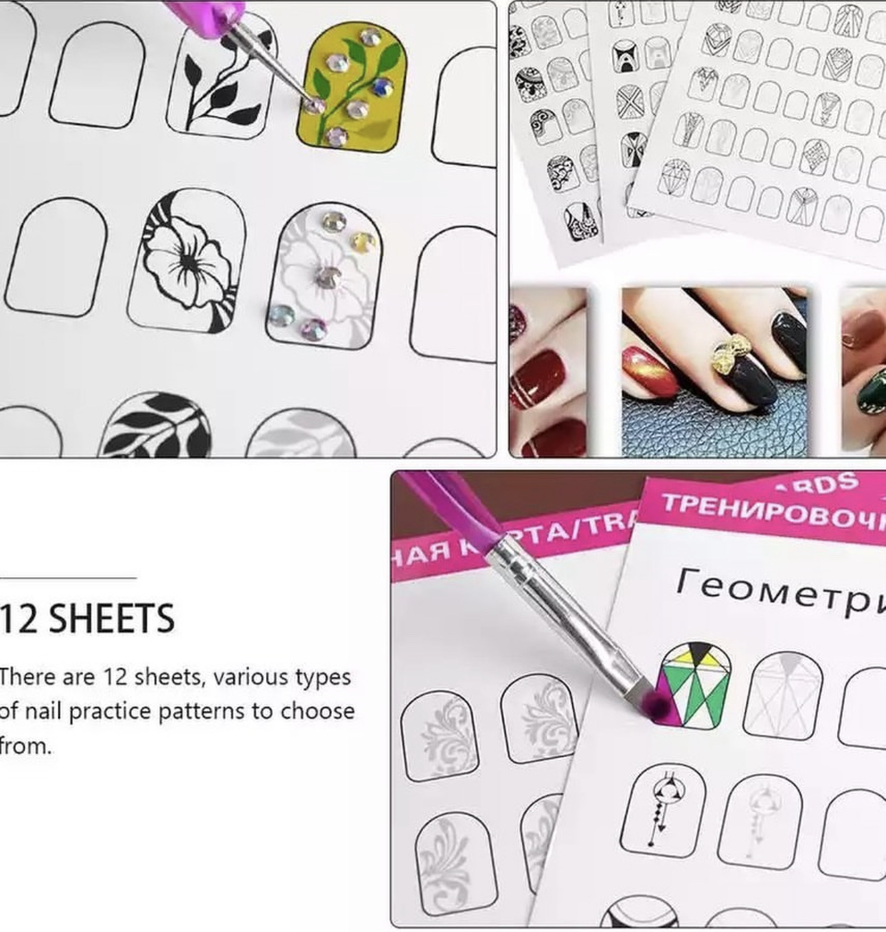 Item Type: Nail Practice Book Material: Paper one set includes 12 papers Features: 1. Suitable for beginners nail special practice or manicure novel practice. 2. Simple and easy to use, avoid the trouble of practicing with nail tips. 3. Can create a pattern on the exercise book firstly, then make a proofing, cost saving. 4. A variety of nail practicing types, available for selection. 5. Different patterns can be practiced according to different nail types.