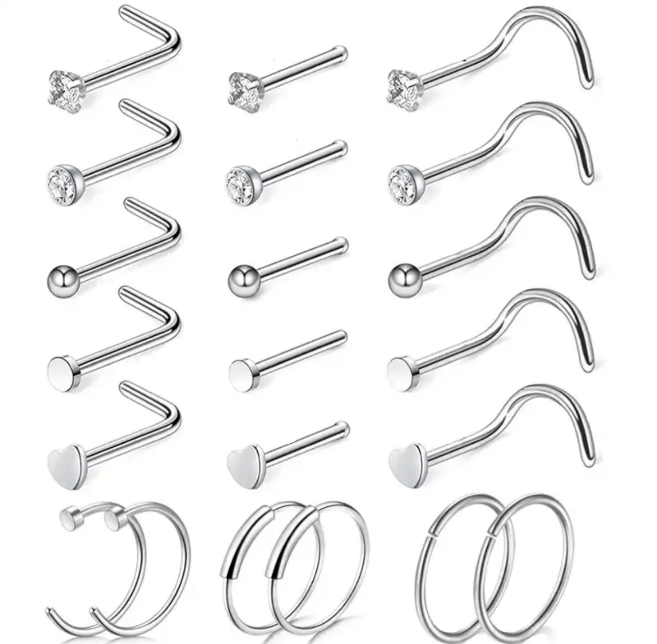Item description: nose rings suits Material: stainless steel Color: silver, black, rainbow color, rose gold Packing: OPP bag Including: 21 pieces Size: 0.8 mm (20 g)