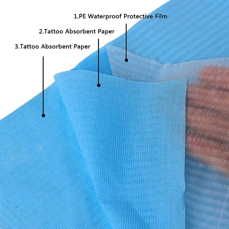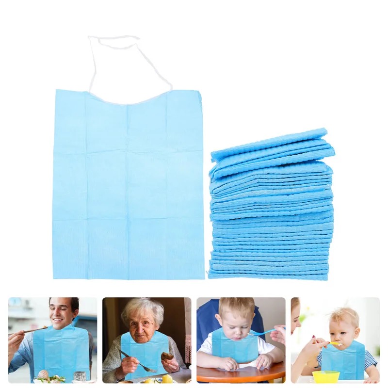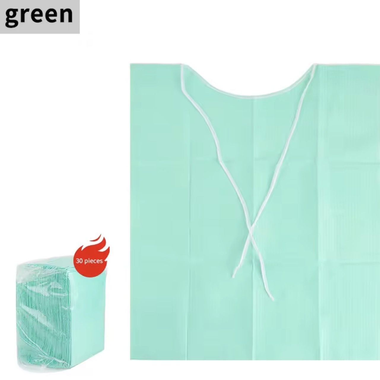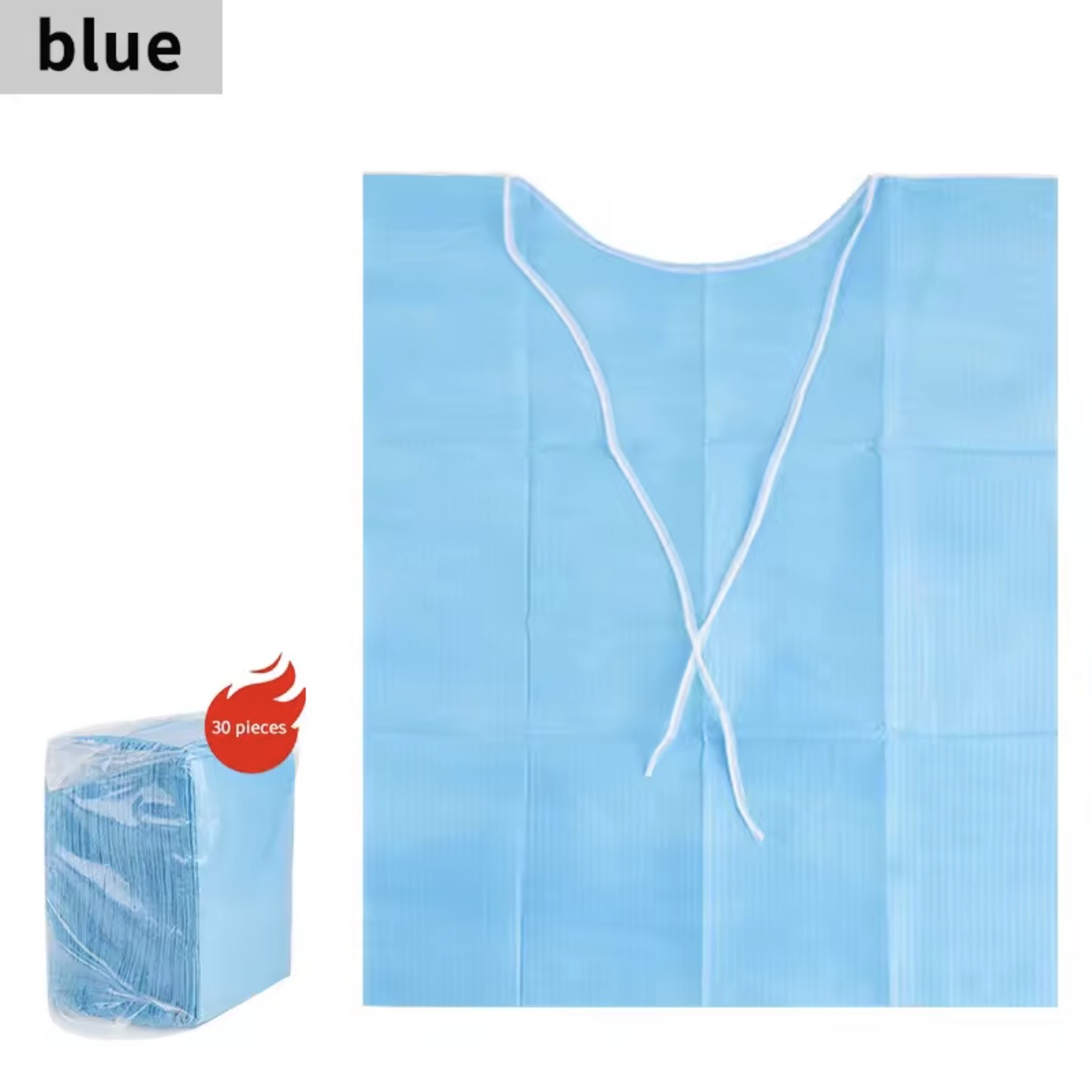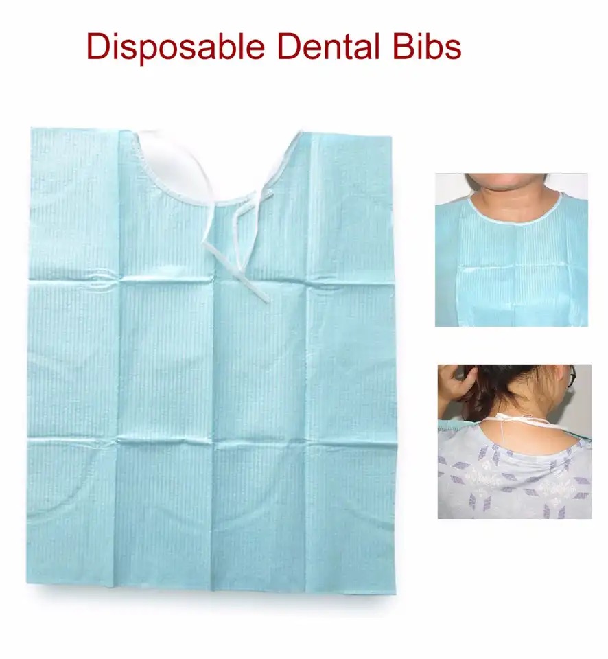 1.Disposable Bibs for Dental Clinics or Salons 2.Waterproof sheets keep fluids and spills off of the patient 3.Beautiful design with faint design on each bib 4.3 ply material designed to be more tear resistant 5.Each Bib has it's own laces to secure to patient Advantage: These Dental Bibs are large rectangles of thin waterproof material with a cutout for the neck and are held in place by inividual ties attached to each bib. Suitable for dental clinics and salons, each sheet is blue and has a faint print pattern on it. These bibs are aesthetically pleasing ano keep spills and fluids off of your patient during treatments such as cleaning, teeth whitening, and others. The material is 2 layers of tissue with 1 layer of plastic for waterproofing and designed to resist tears better than other thin dental bibs. Each bib has it's own individual tie as opposed to a reusable clip for convenience and hygiene. * Excellent waterproof with Belt and slight prints * Maximum protection with horizontal embossed pattern and a unique water repellent edge