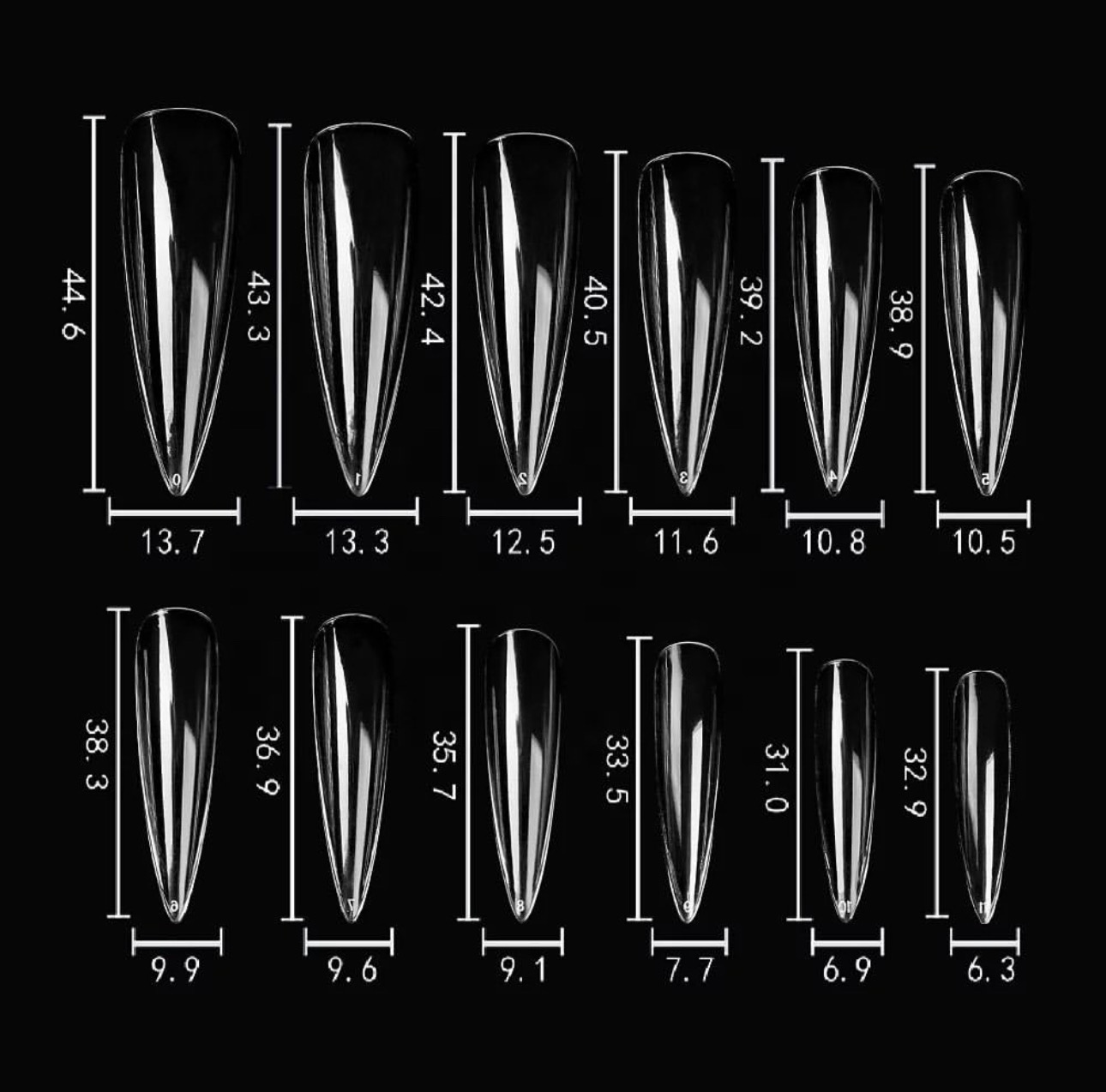 Quantity :240pcs/box Item Type :False Nail Type : Coffin Square Stiletto Nail Tips Color :Transparent Size:0-11 size, 12 sizes in total Suitable for use with gel, acrylic applications Can add nail art decorations on the nails