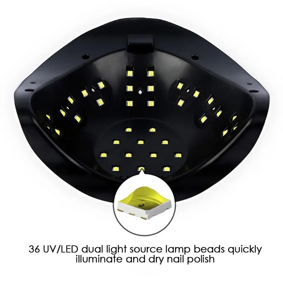 Thanks to the intelligent and convenient infrared smart sensor technology, a sensitive hand control can be detected sensitively and the manicurist's hands can be freed The 168W nail dryer uses dual light source LED filament lamp beads. 36UV dual light source LED filament lamp beads can be used to dry different types of nail polish, such as: B. Glue phototherapy glue, extension glue, temperature change glue and reinforcement., Cat eye glue, etc. No blind spot lighting, fast baking speed Removable plug-in bottom plate design, easy to bake, manual baking glue is convenient and fast, easy to clean, to prevent the growth of bacteria Four speed adjustable digital timing display, choose time according to your situation, there are 10S fast curing, 30S, 60S and 99S painless modes You can enjoy at home nail salon which can be used as gifts for Valentine's Day, Birthday, Mother's Day and Christmas. Material: ABS plastic Power: 168W Number of lights: 36 Wavelength: 365-405NM Feature: (1) Intelligent infrared sensor (2) Detachable base Function: four speed timing 105, 305, 605, 995 painless mode Package size: 23 * 18 * 11CM, Scope of delivery: 1 nail lamp 1* plug 1 * description