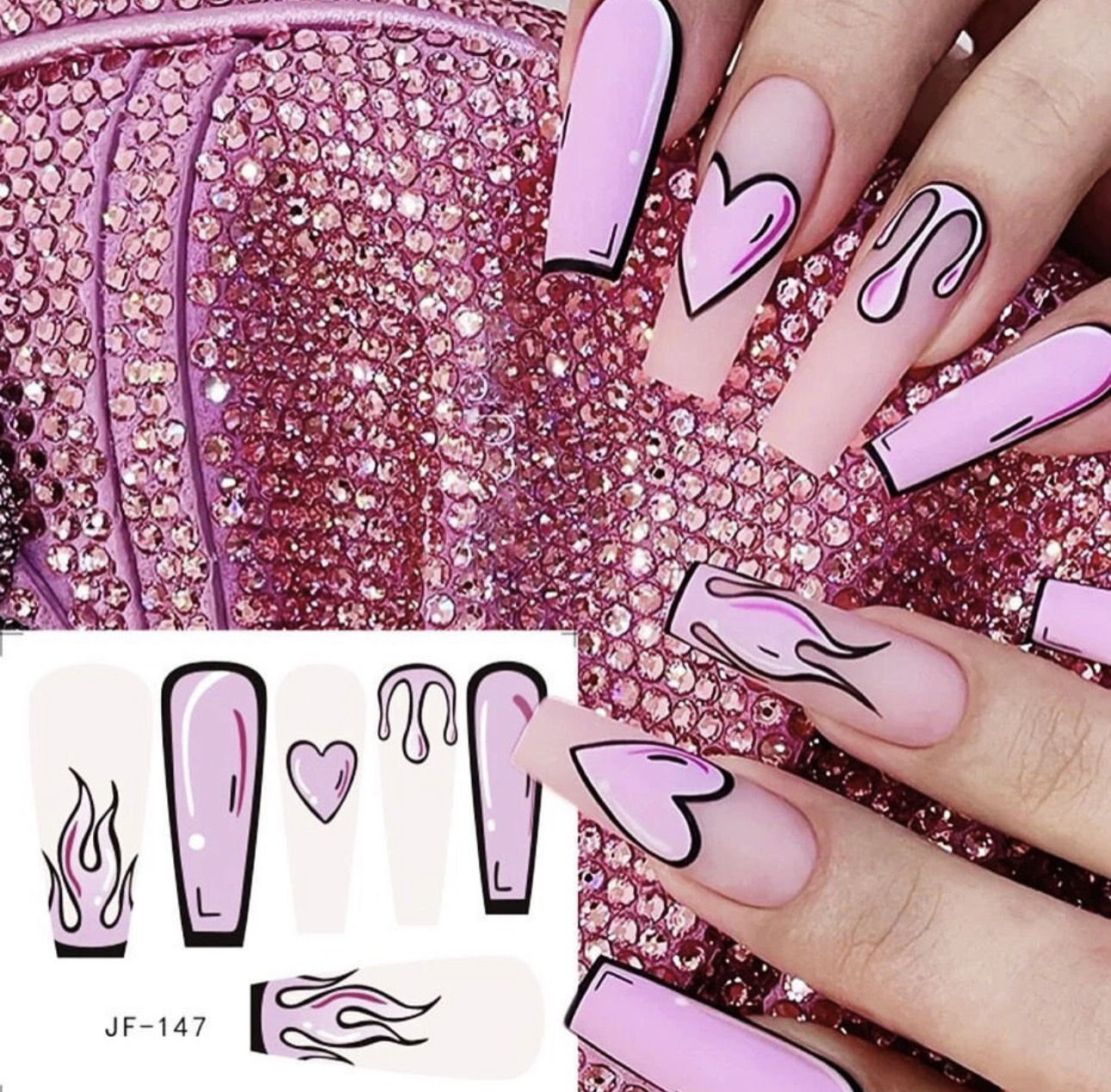 Pattern: Comics Heart Fire Color: Mixed Color Type: Water Transfer Nail Stickers Set Cute Nail Art Decoration Daily DIY Full Cover Nail Stickers Package Contents: 12design/sheets Nail Stickers Decal Set Nails Application: 1.Trim, clean and polish the fingernails; paint the background coior on the fingernails and dry it out. 2. Remove the film of product, cut out the patter and plunge it into water 10-20 seconds. 3. Moisten the fingernails, stick the patter in position. 4. Sop up the water with a paper towel and blow dry. 5. Cap with clear nail polish and blow dry.