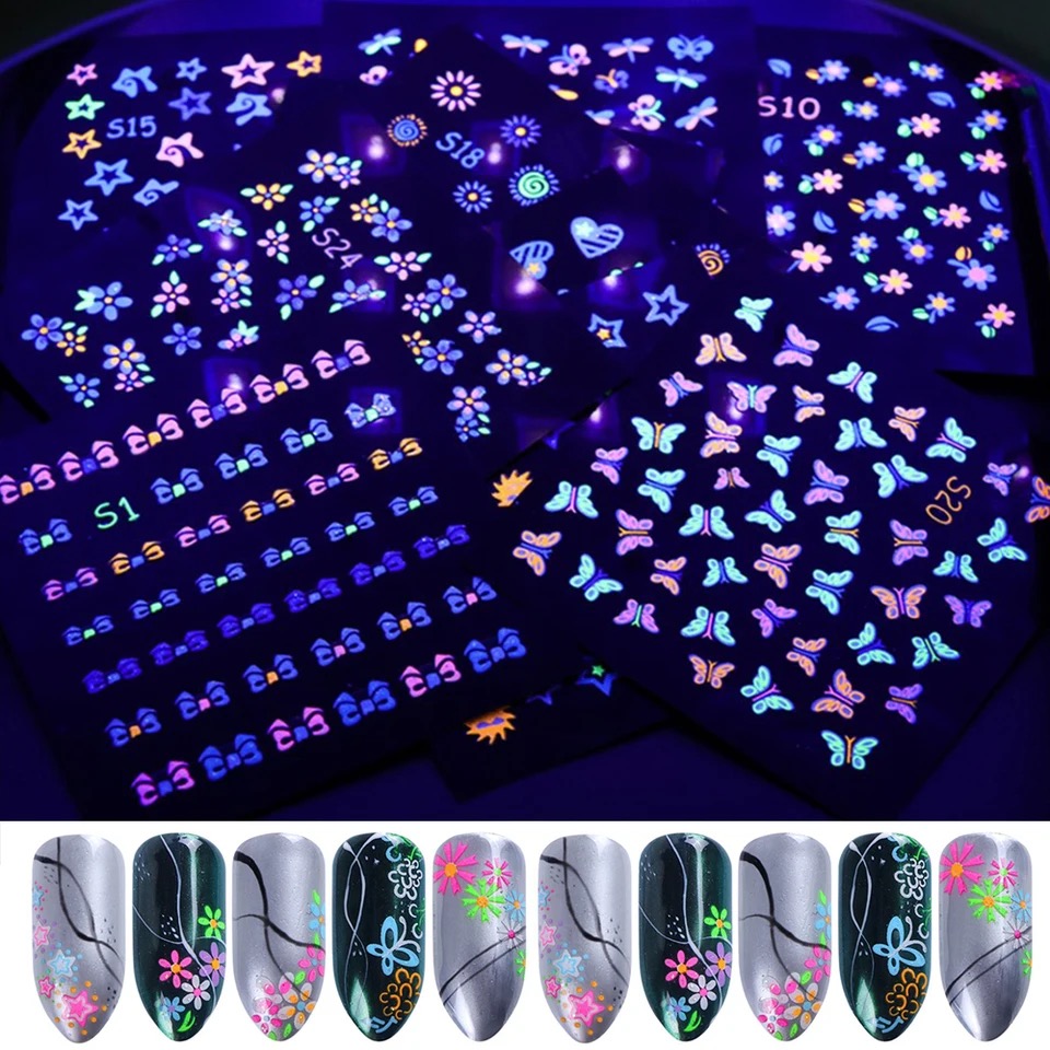 Color: White Color Type: Luminous/Glow In The Dark Size : 12x7.5cm Designs: Christmas/New Year's Eve Nail Design Pattern:Snowflake/Elk/Snowman/Santa Claus/Christmas Tree/Deer Packing: 24 sheet glow in the dark sticker