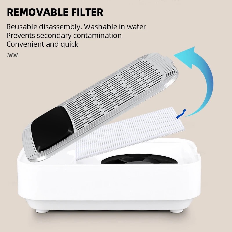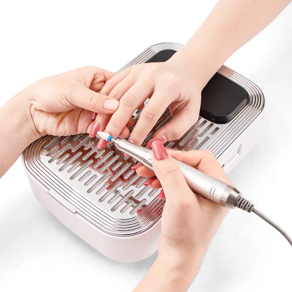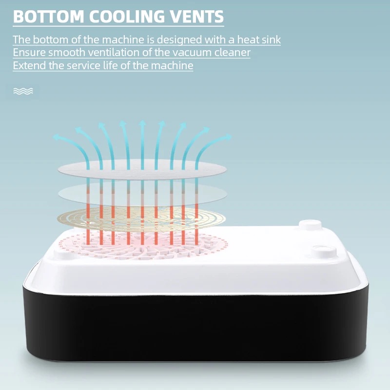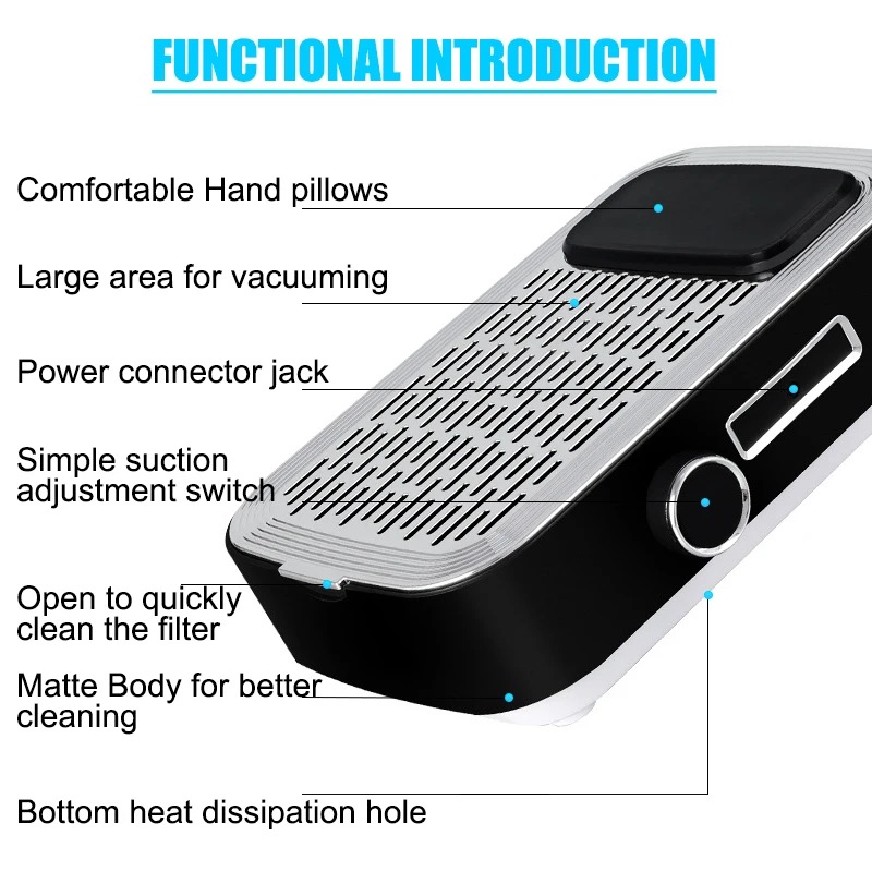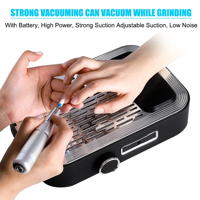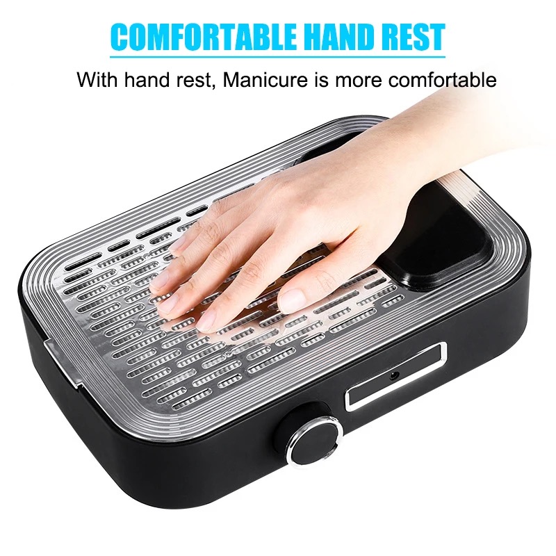 Product Description: * 80W High-power Nail Dust Collector - Are you still troubled by the dust flying when you polish your nails? 80w dust collector, perfectly solve your dust removal problem! The nail dusting machine is made of high-quality stainless steel and ABS resin, come with a powerful high-speed rotating motor, which can easily suck up dust and bring you a clean nail art making environment. Efficient Heat Dissipation & Low Noise - The bottom of the nail duster is designed with large exhaust holes for better heat dissipation. You can adjust the suction power according to your needs. Of course, the greater the suction power, the higher the power, and the noise will inevitably increase, but it will not affect your normal communication with customers, we hope vou can understand. * Comfortable Hand Pillow & Replaceable Filter - The dust collector for nails comes with a silicone hand pillow, which provides you with a comfortable manicure experience and relaxes your wrists. Comes with a replaceable filter, if you are using it personally, we recommend that you replace the filter every 4-6 months. In addition, the filter is not washable and can be cleaned by shaking it gently. If there is too much dust, you can use a hair dryer to blow off the excess dust. Versatile Use More Than Manicures - Our duster can be used not only for manicure polishing, but also to absorb dust in jewelry, small crafts, and woodworking. It is worth noting that if there is some dust left on the panel, you can clean it up by simply swiping the surface with any small brush. [Warm Tips - Our nail vacuum cleaner can be used with an adapter or without a power supply. the green light is on to indicate that it is fully charged (about 1.5hours of continuous use). The charging design is more convenient to carry, suitable for grinding fingernails and toenails. (Input voltage 110 v)
