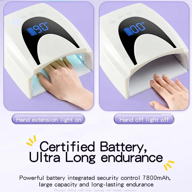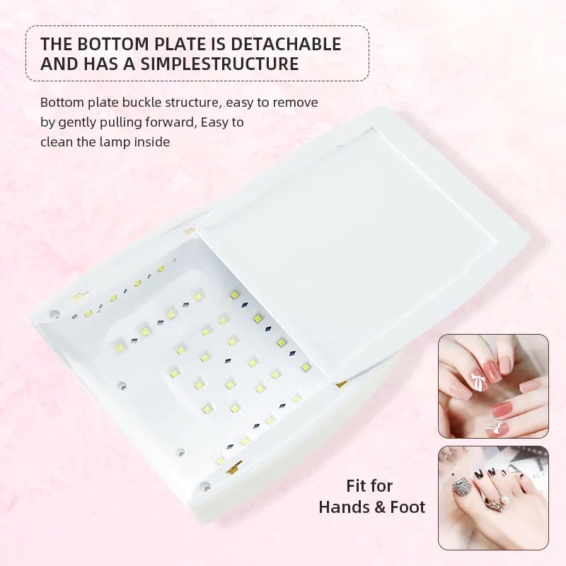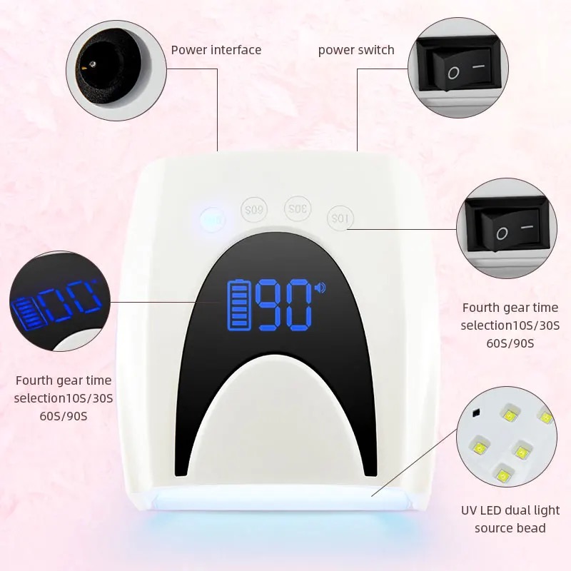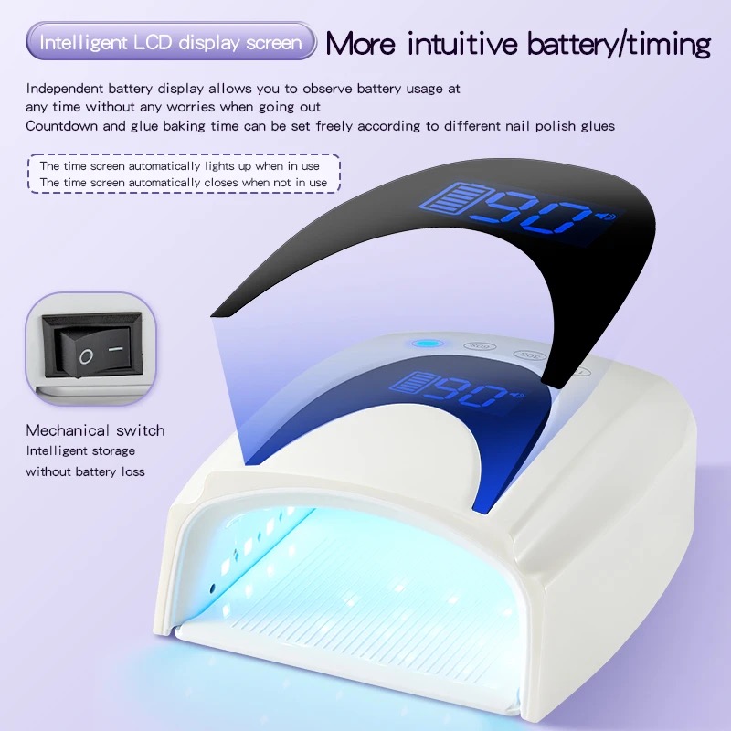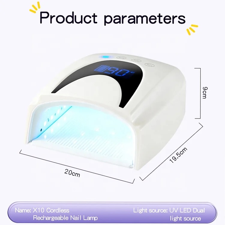 Product Description: X10 Nail Drying Lamp • Time saving: 72W high-power, gel nail lamp with 33 UV/ LED lamp beads. It can consolidate nails faster. Perfect for families and salons, this nail machine can help You solve almost all treatment problems. • Rechargeable cordless nail lamp: One button switch can protect the battery life of the UV gel nail lamp. This LED gel finger lamp can last for 6-7 hours. Can use 800-1000 Secondary recycling, long service life. You can carry it with you.LCD screen and 4 intelligent timers: The nail lamp has a large © LCD display screen that displays the drying time, intelligent sensors, and it will light up when your hand/foot enters, and when your hand/foot leaves, extinguished. The LED nail enhancement light has four timing modes (10S, 305, 60S, 90S), suitable for beginners or professional nail salons. You can choose the curing time suitable for various nail polish. • Repair various nail polish: applicable to all UV and LED nail polish, sculpture gel, extension gel, gem glue, etc. But not suitable for ordinary nail polish. You can also enjoy DIY beauty at home Art of Jia. This UV gel nail lamp is also a birthday and Christmas gift for friends and family • Removable base: Removable base is more convenient for hands and toenails gel to heal and clean the interior of UV LED nail lamp. The spacious space can handle more nails or toenails at the same time, allowing you to Have the most comfortable salon experience.