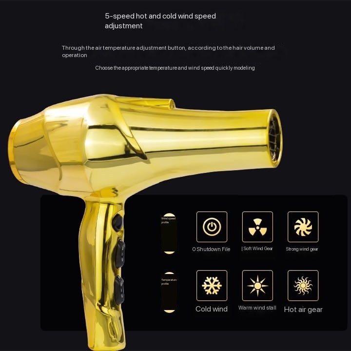 Product Introduction Color: gold Voltage: European standard (220V/60Hz) and American standard (110V/50Hz); Power: US 1800W/European 2000W; Wire length: 2.1m; Product features: Cold and hot air conversion 5-gear wind speed+temperature control regulation, powerful motor, colorful shell, fast dry hair 2 air collecting nozzles;