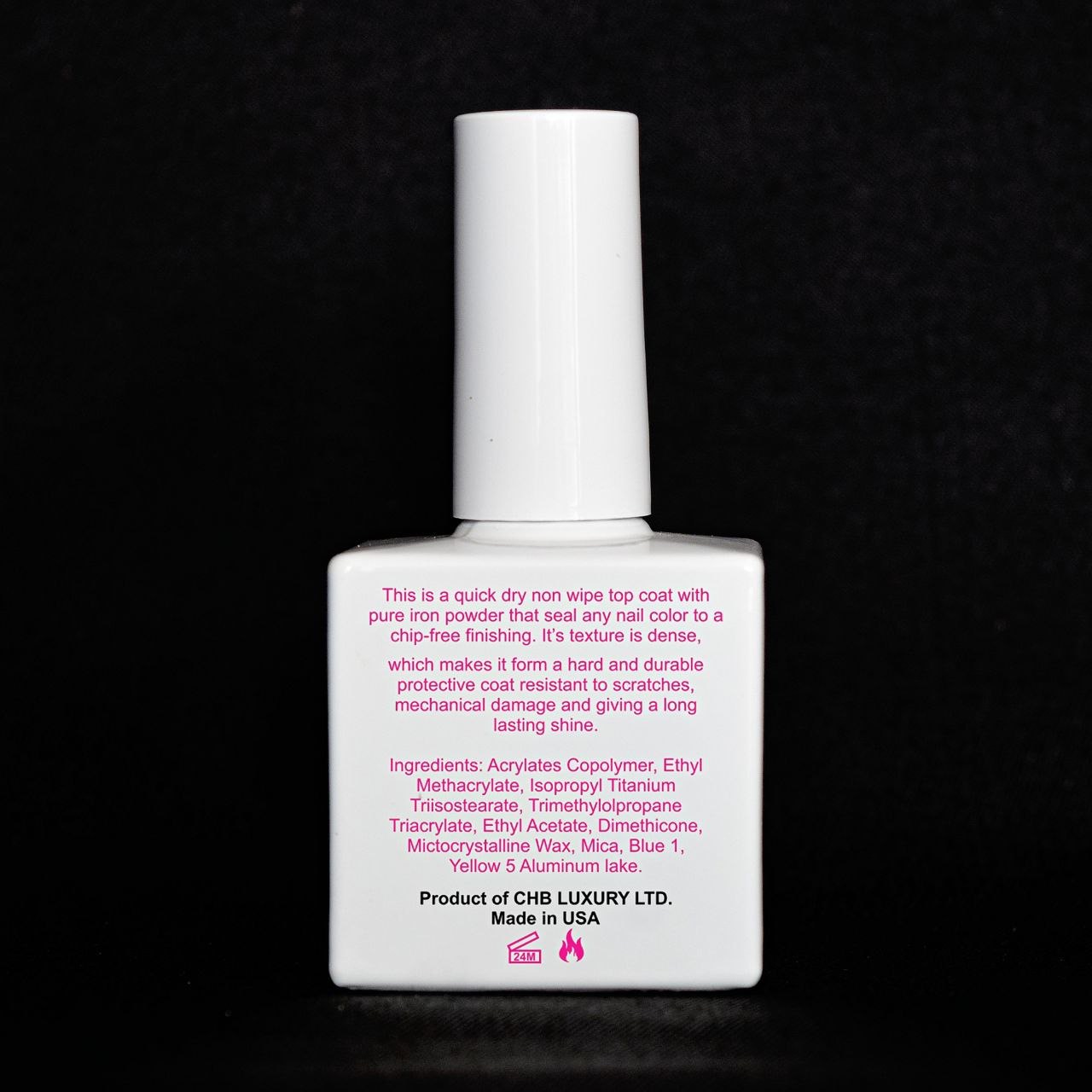 Product Description: This is a quick dry non wipe top coat with pure iron powder that seal any nail color to a chip-free finishing. It's texture is dense, which makes it form a hard and durable protective coat resistant to scratches, mechanical damage and giving a long lasting shine. Capacity:18 ml Color:as show in the pictures. Package Content: 1 pc Iron Bright Top Coat Feature: It made of healthy, environmental, friendly, no poisonous, pungent chemical materials. It is quick drying with any UV Light. Long lasting for at least 30 days, fantastic and super bright nails for you. This nail gel polish is easy to apply and soak off. Allow you for professional or home nail art design. A professional Nail Art Gift for yourself or your girlfriend. Professional usage: Step 1. Clean Nails then trimming nail surface as normal manicures process. Step 2. Fully shake up the gel polish, it can make the gel polish color balanced. (Important) Step 3. Apply Base coat first, which can make polish lasting longer, cure with UV lamp or LED lamp. (Necessary) Step 4. Apply first layer of color gel directly, cure with UV lamp for 2 minutes or cure with LED lamp for 60 seconds. Step 5. Apply second layer of color gel and then immediately cure with UV lamp for 2 minutes or cure with LED lamp for 60 seconds. Step 6. Coat with iron top coat, cured by UV lamp or LED lamp. Remove Our UV Gel Nail Polish Step: • Soak nails in a glass bowl filled with a small amount of acetone, or wrap each nail in cotton pad soaked with acetone for around 5 to 10 minutes. • Product will start to become soft and you can gently file it away or slide it off using a small wooden stick.