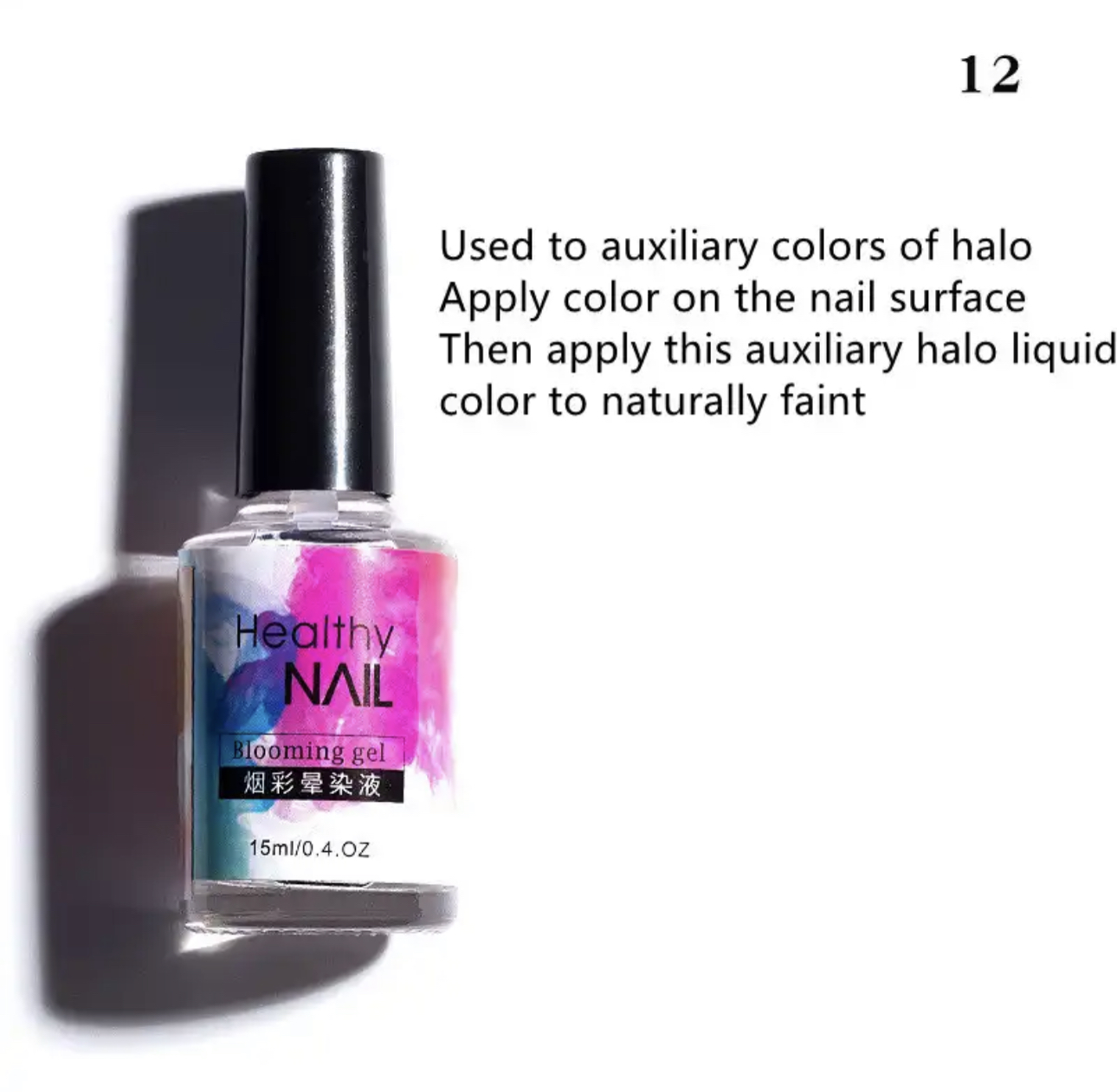 Item: Blooming nail polish Item condition: 100% brand new Style: Japanese style Design: Smoke effect/ watercolor ink/ blooming/ marble Colors: Pink, Smoke blue, Yellow, Khaki, Sky blue, Smoke pink, Green, Smoke black, Purple, Orange, Transparent Volume: 15 ml/bottle Quantity: 12 Colors set Feature: 1. Liquid nail polish blooming gel, do no need to cure by uv lamp 2. Bright and beautiful colors, suitable for salon as well as home use 3. Use No.12 transparent polish to bloom the nails, can make a better effect How to use: Step 1: Apply a layer of base coat ( white color ) and cure for 120s Step 2: Painting on nails with color nail polish Step 3: Use No.13 transparent polish to bloom the nail Step 4: Drying in the air without uv lamp Step 5: Apply a layer of top coat and cure for 120s by lamp