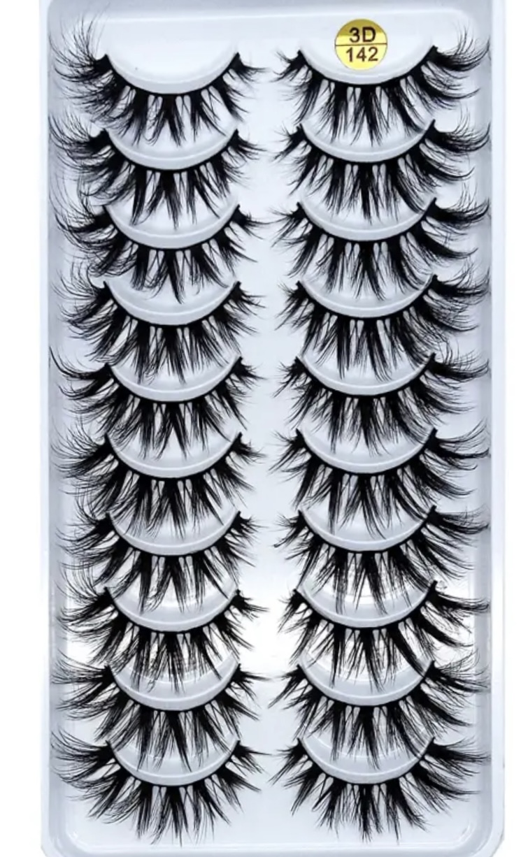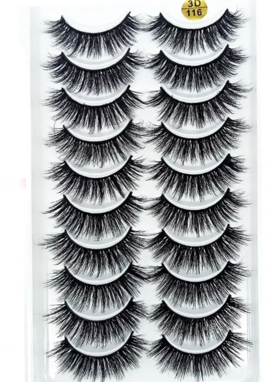 Name: Faux mink lashes Styles: Natural,soft,thick,winged,small clusters cross Lashes Band: Black / Clear Package include: 10 pairs 3d lashes mink