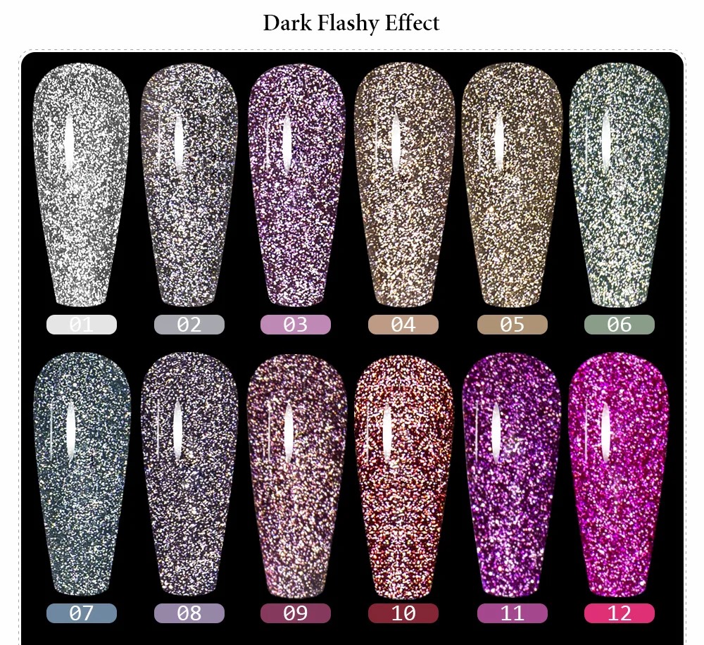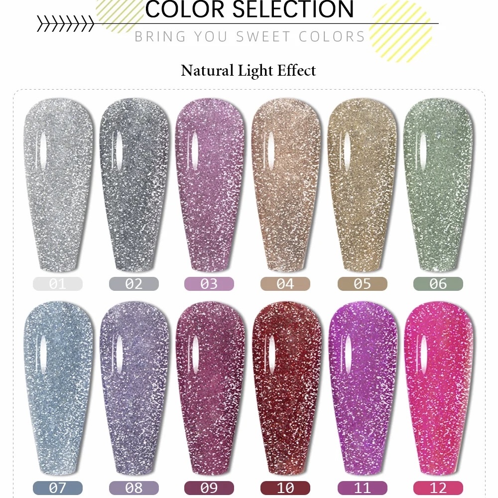 Package Contents: 12pcs 8ml Disco Reflective Glitter Gel Polish Unique Selling Proposition: It made of healthy, environmental, friendly, no poisonous, pungent chemical materials. It is quick drying with any UV Light. Long lasting for at least 2-3 weeks, fantastic and super bright nails for you. This nail gel polish is easy to apply and soak off. Allow you for professional or home nail art design. A professional nail art gift for yourself or your girl friend. Professional Usage: 1.-Shape nail surface, clean the cuticles, buffing nail surface and clean the dust. 2.-Apply the base gel from the cuticle to the free edge . (Remember to seal the edge of the nail). Cure the nails under the LED or the UV light for 1minutes. 3.-Apply a layer of color coat. Cure the nails under the LED or the UV light for 1minutes. 4.-Apply BOZLIN Reflective Glitter Line Gel to painting your like. Cure the nails under the LED or the UV light for 1minutes. 5.-Apply the top gel from the cuticle to the free edge . Cure the nails under the LED or the UV light for 1minutes. 6.-Wipe the tacky residue on nails with the cleanser. Remove Our UV Gel Nail Polish Step: • Soak nails in a bowl filled with a small amount of acetone, or wrap each nail in cotton pad soaked with acetone for around 5 to 10 minutes. Product will start to become soft and you can gently file it away or slide it off using a small wooden stick. Warm Reminder: 1. Avoid all skin contact. If redness or other signs of adverse reaction occur, discontinue use immediately. 2. Keep tightly sealed. Keep out of sunlight. Keep out of reach of children. NOTICE: Please avoid contact with skin. In case of accident or if you feel unwell, seek medical advice immediately(show the label whenever possible) Color Difference Reason: we don't accept client complaint color difference, if you don't accept, please don't buy from our store .our picture are 100% real ,but we can not promise what every body see are same as the real picture 1.every display resolution is different 2. outdoor light and indoor light is different